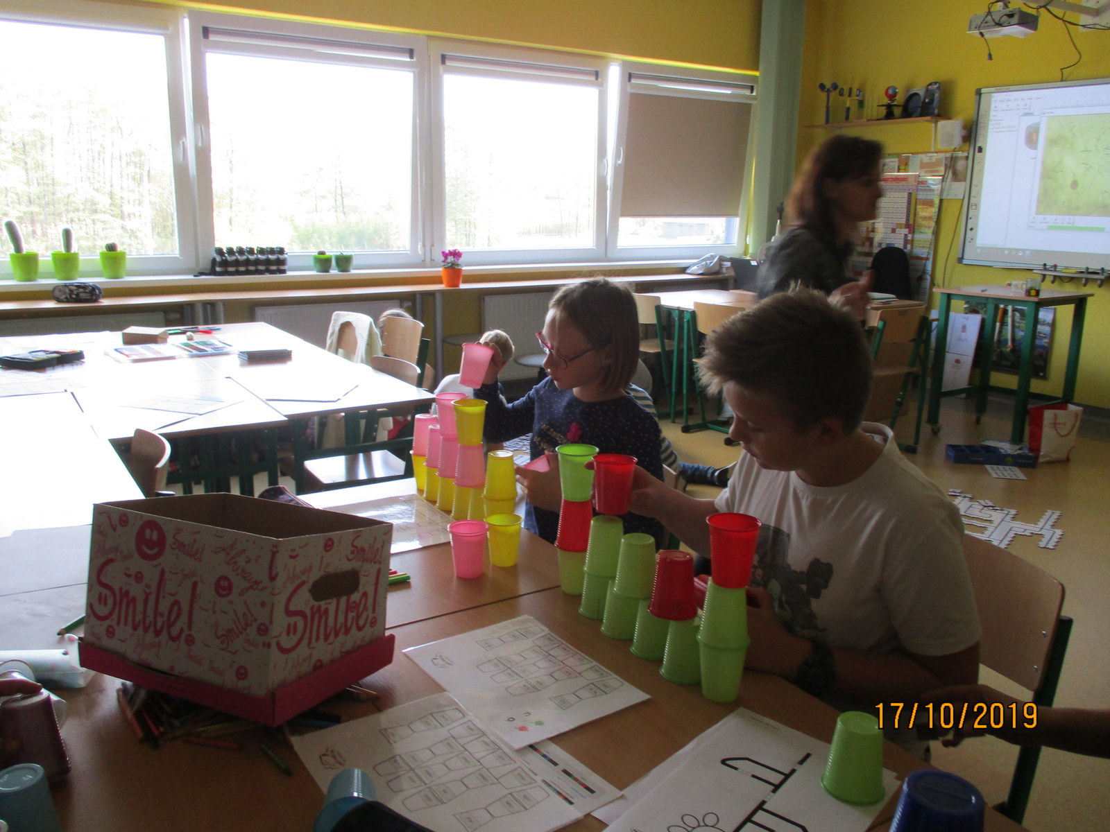 W czasie zajęć uczniowie z klasy VIA i VIB zapoznali się z podstawami programowania. Pracowali z ozobotami, układali trasy przejazdów ozobotów, kodowali kubeczkowe wieże.