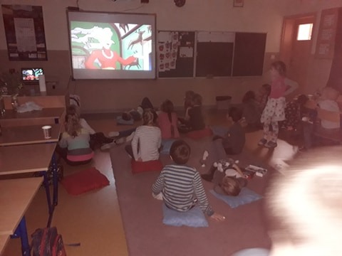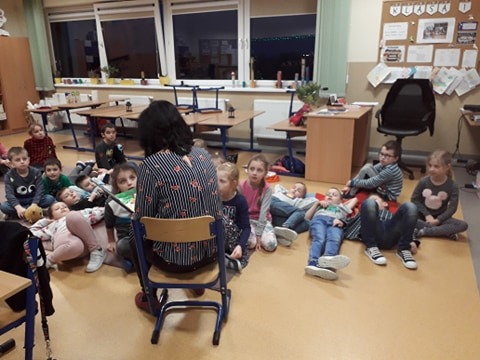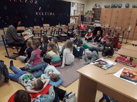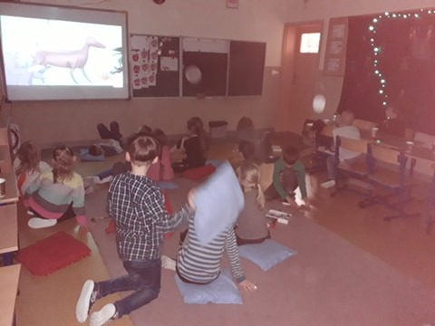 Pierwszym punktem spotkania było czytanie fragmentu książki, omawianie treści i rozwiązanie krzyżówki przygotowanej przez organizatorki. Kto uważnie słuchał i znał odpowiedzi, ten otrzymywał słodką nagrodę. Następnie uczniowie oglądali film animowany zaproponowany przez opiekunów. Po zakończeniu projekcji był czas na posiłek,  dzielenie się wrażeniami i wspólną zabawę. Wieczór upłynął w miłej i przyjaznej atmosferze.