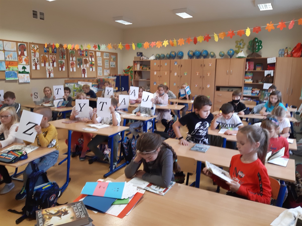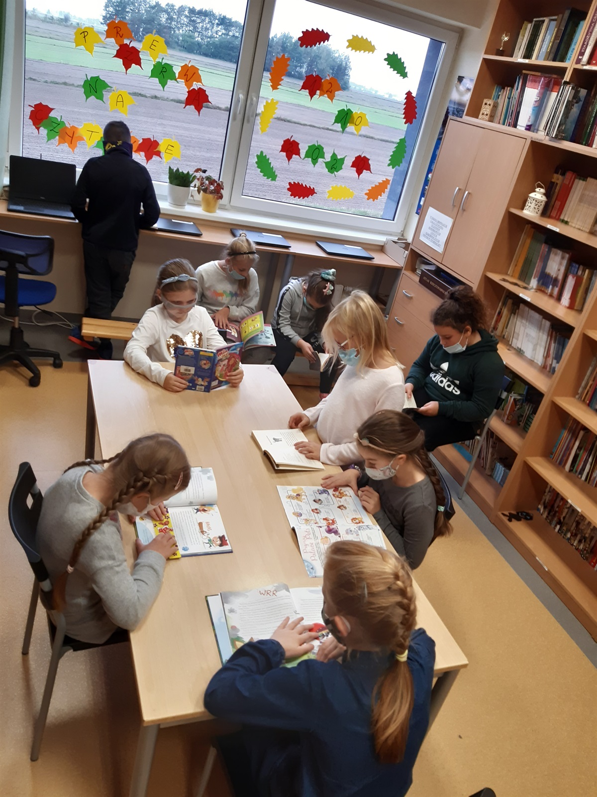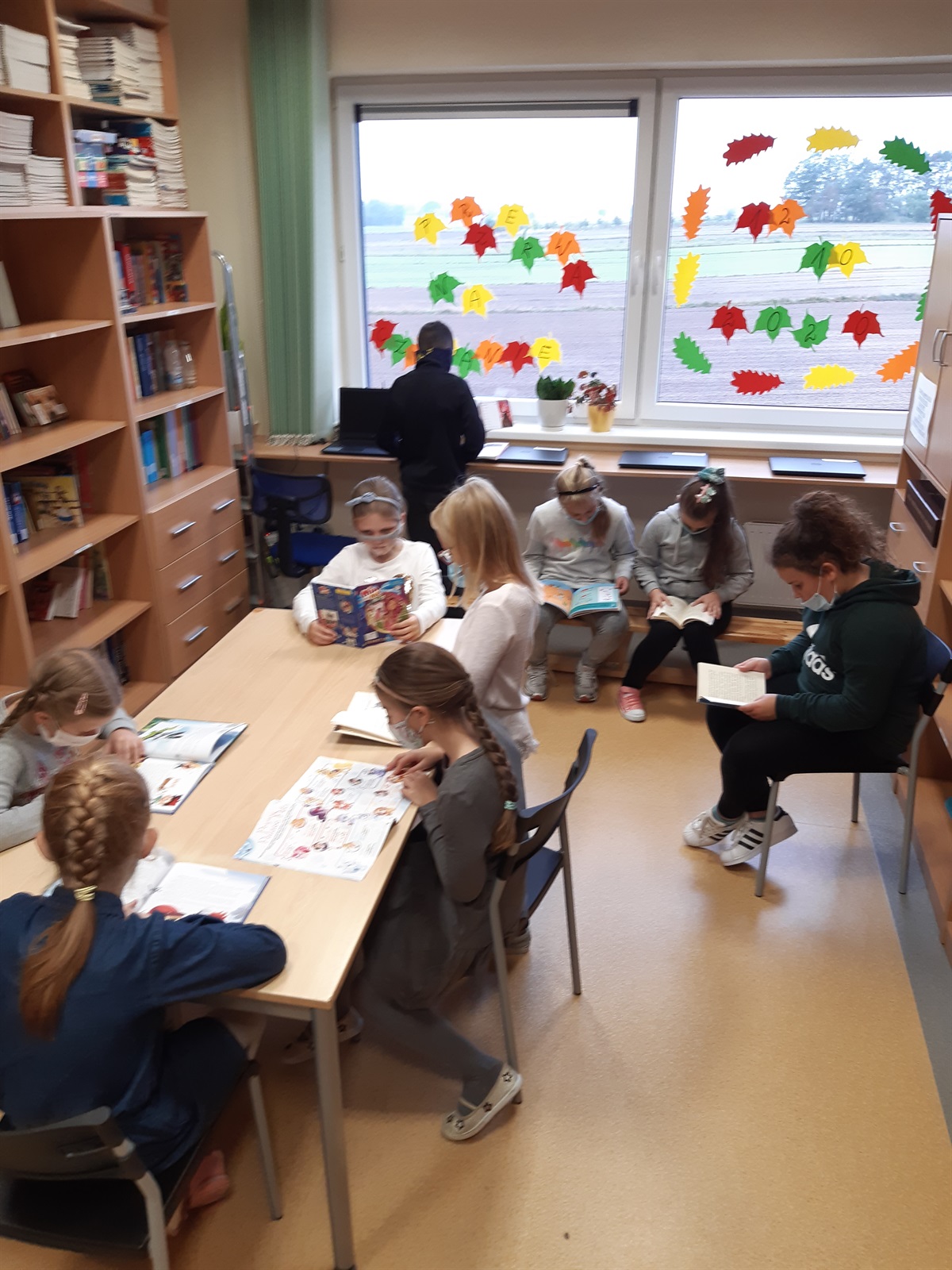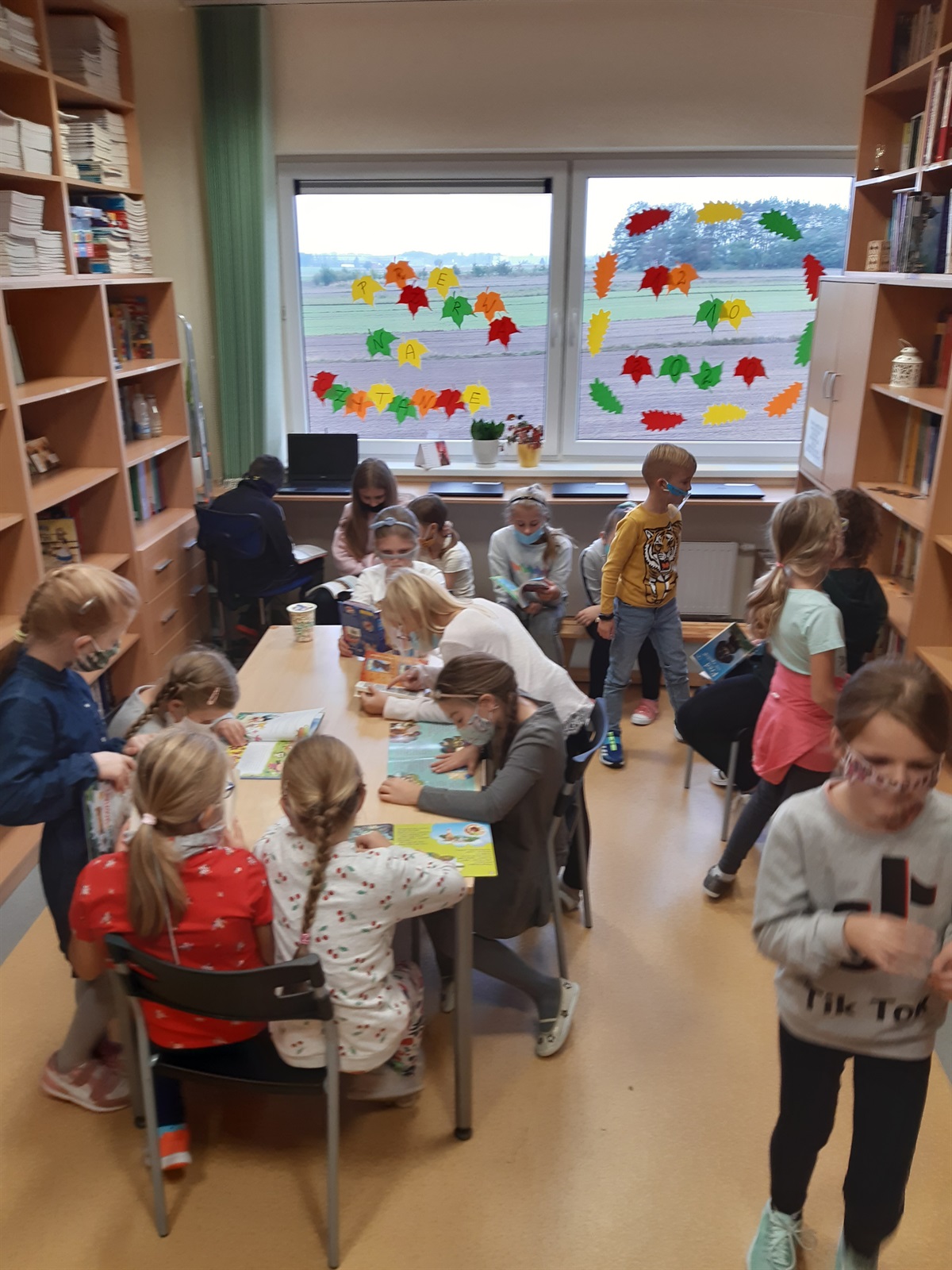 W związku z zaistniałą sytuacją musieliśmy się spotykać w mniejszych grupach  z zachowaniem środków ostrożności. Podczas dwóch przerw dziesięciominutowych czytaliśmy w bibliotece. W trakcie lekcji gościłam w grupie przedszkolnej, gdzie czytałam maluchom przygody Fajniaków, ulubionych bohaterów. Natomiast w ramach lekcji bibliotecznej przeprowadzonej w klasie II – czytaliśmy fragmenty lektur przeznaczonych dla tego etapu edukacyjnego. Część uczniów mogła również czytać przyniesione przez siebie książeczki. Łącznie w akcję włączyło się 67 uczniów i trzech nauczycieli.