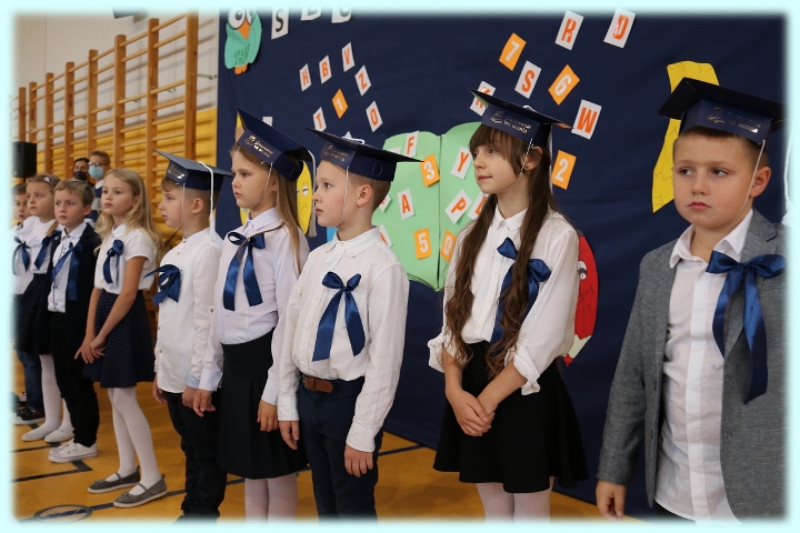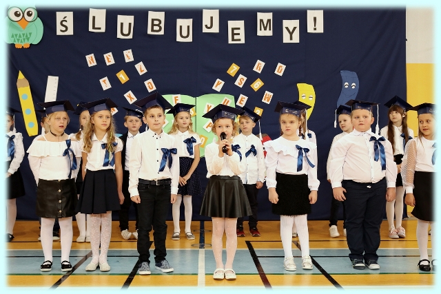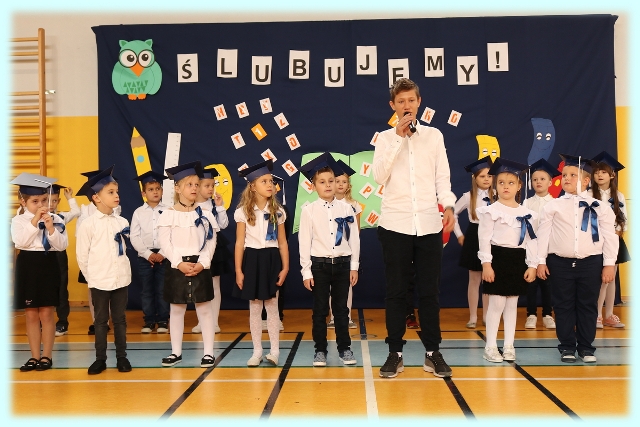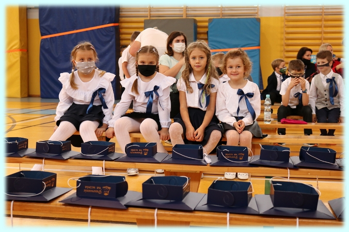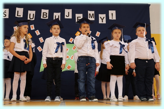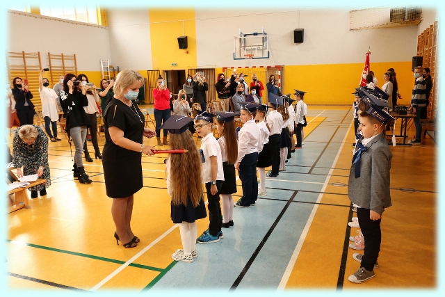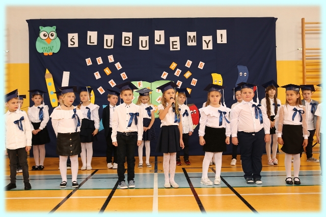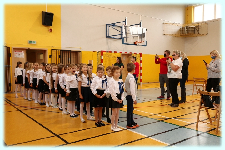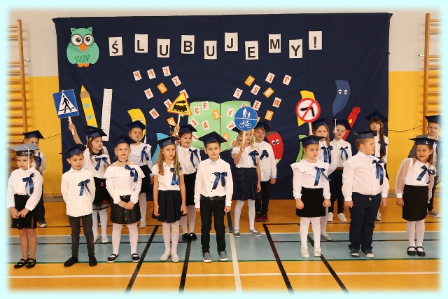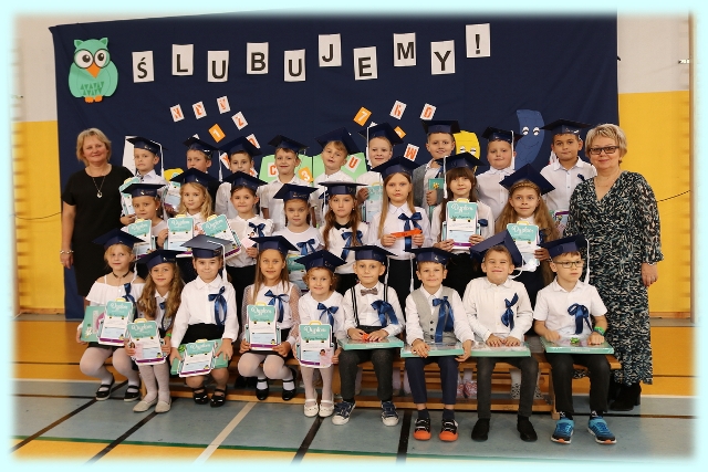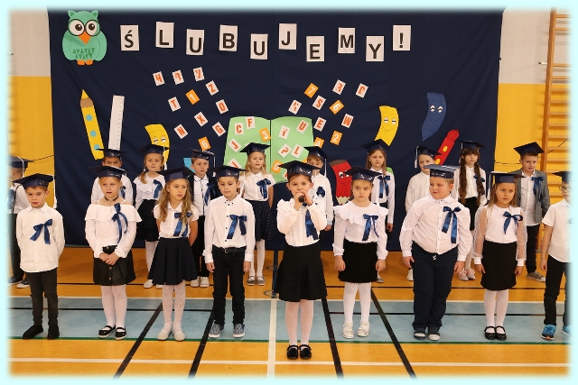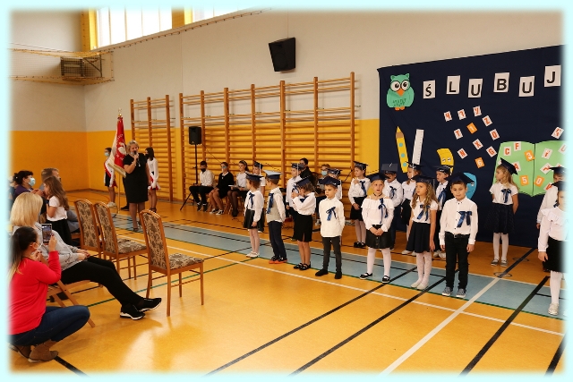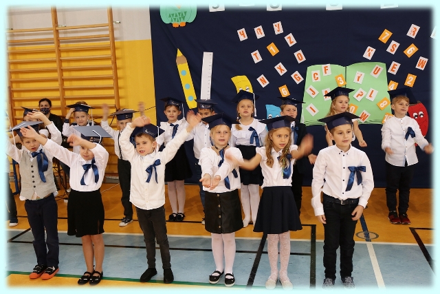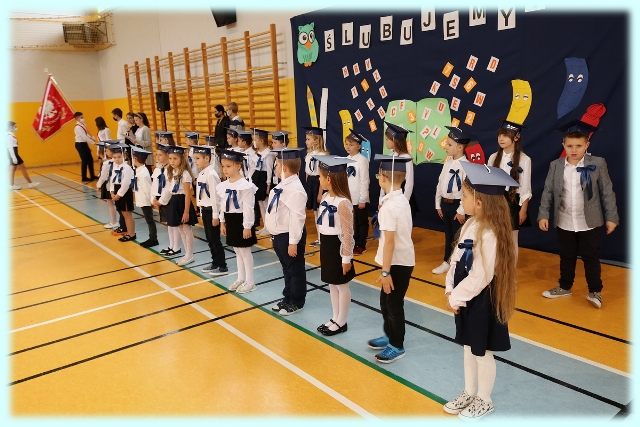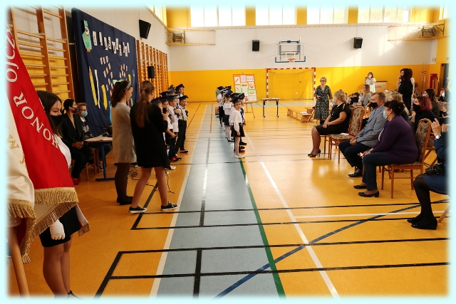 Dnia 23.10.2020 r. uczniowie klasy pierwszej zostali przyjęci w poczet społeczności szkolnej. Uroczystość rozpoczęła się pięknie zatańczonym przez uczniów polonezem, a następnie pierwszaki prezentowały wszystkim zebranym to, czego nauczyły się w pierwszych miesiącach pobytu w szkole. Dzieci złożyły uroczyste ślubowanie, a następnie zostały pasowane na uczniów przez panią dyrektor. Otrzymały mnóstwo życzeń, gratulacji, a także upominków od Rady Rodziców, którą reprezentował pan przewodniczący – Marcin Adamczyk, od obecnych na uroczystości rodziców (słodka niespodzianka), od wychowawczyni – pani Elzbiety Ogrodniczak- Kozłowskiej (dyplomy i legitymacje szkolne) oraz od starszych kolegów  i koleżanek z oddziału drugiego (własnoręcznie wykonane zakładki do książek i odblaski). Przedstawiciele Samorządu Uczniowskiego, prezes Fundacji Oświatowej „Jarosty” pani Beata Dziadczyk oraz rodzice życzyli wszystkim pierwszoklasistom samych sukcesów, poznawania tajników wiedzy oraz tego, aby każdy dzień pobytu w szkole był dla nich niezapomnianą przygodą. Na koniec pan fotograf zrobił dzieciom pamiątkowe zdjęcia.