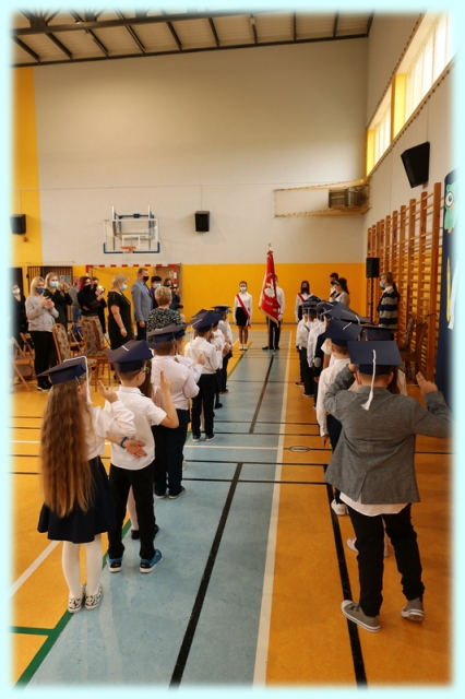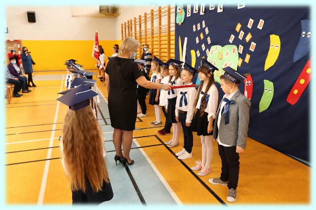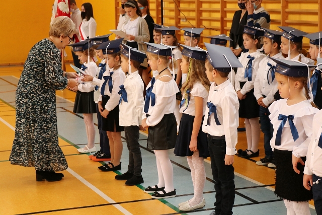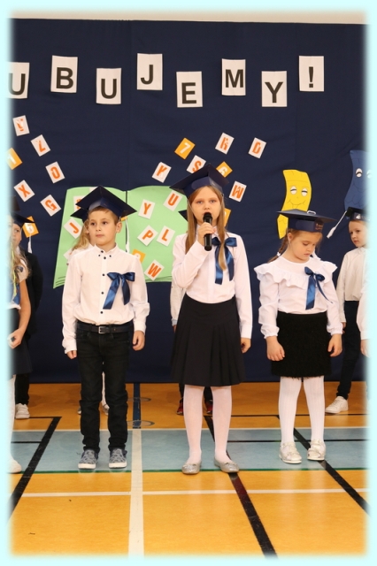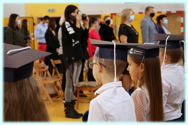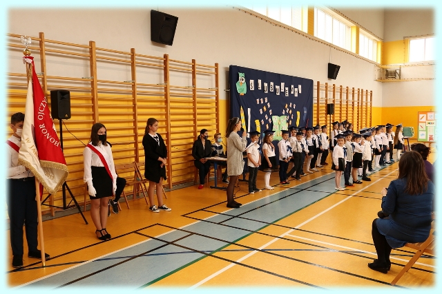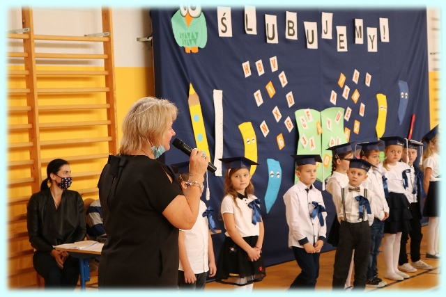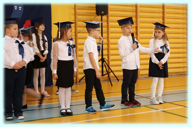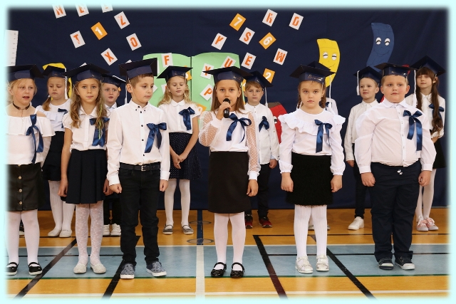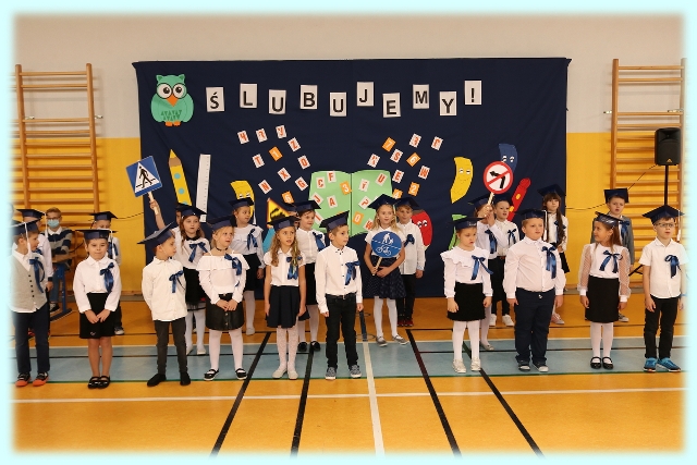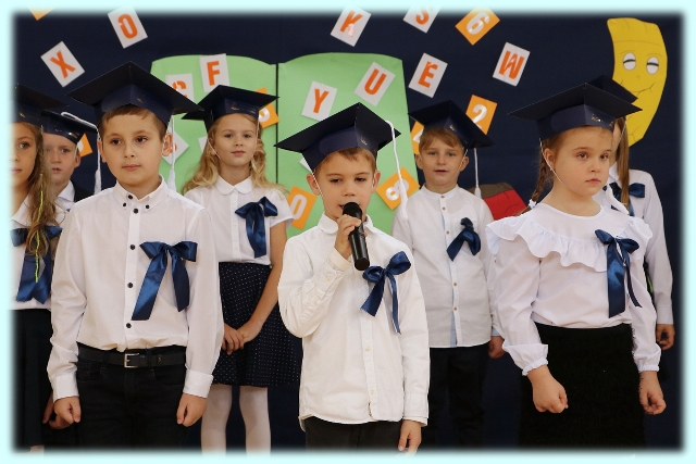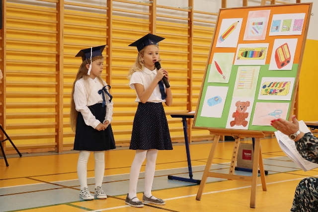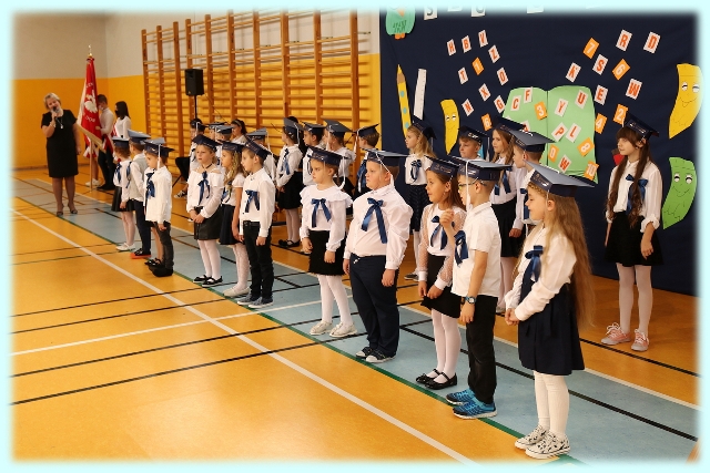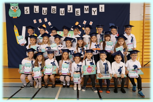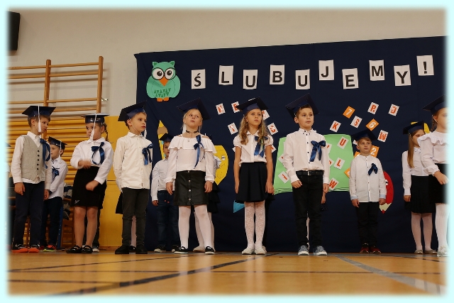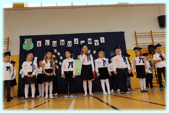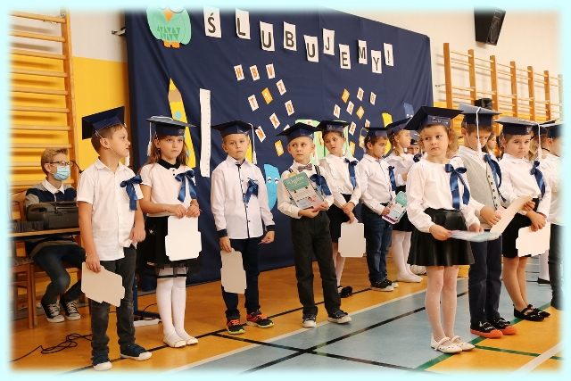 Dnia 23.10.2020 r. uczniowie klasy pierwszej zostali przyjęci w poczet społeczności szkolnej. Uroczystość rozpoczęła się pięknie zatańczonym przez uczniów polonezem, a następnie pierwszaki prezentowały wszystkim zebranym to, czego nauczyły się w pierwszych miesiącach pobytu w szkole. Dzieci złożyły uroczyste ślubowanie, a następnie zostały pasowane na uczniów przez panią dyrektor. Otrzymały mnóstwo życzeń, gratulacji, a także upominków od Rady Rodziców, którą reprezentował pan przewodniczący – Marcin Adamczyk, od obecnych na uroczystości rodziców (słodka niespodzianka), od wychowawczyni – pani Elzbiety Ogrodniczak- Kozłowskiej (dyplomy i legitymacje szkolne) oraz od starszych kolegów  i koleżanek z oddziału drugiego (własnoręcznie wykonane zakładki do książek i odblaski). Przedstawiciele Samorządu Uczniowskiego, prezes Fundacji Oświatowej „Jarosty” pani Beata Dziadczyk oraz rodzice życzyli wszystkim pierwszoklasistom samych sukcesów, poznawania tajników wiedzy oraz tego, aby każdy dzień pobytu w szkole był dla nich niezapomnianą przygodą. Na koniec pan fotograf zrobił dzieciom pamiątkowe zdjęcia.