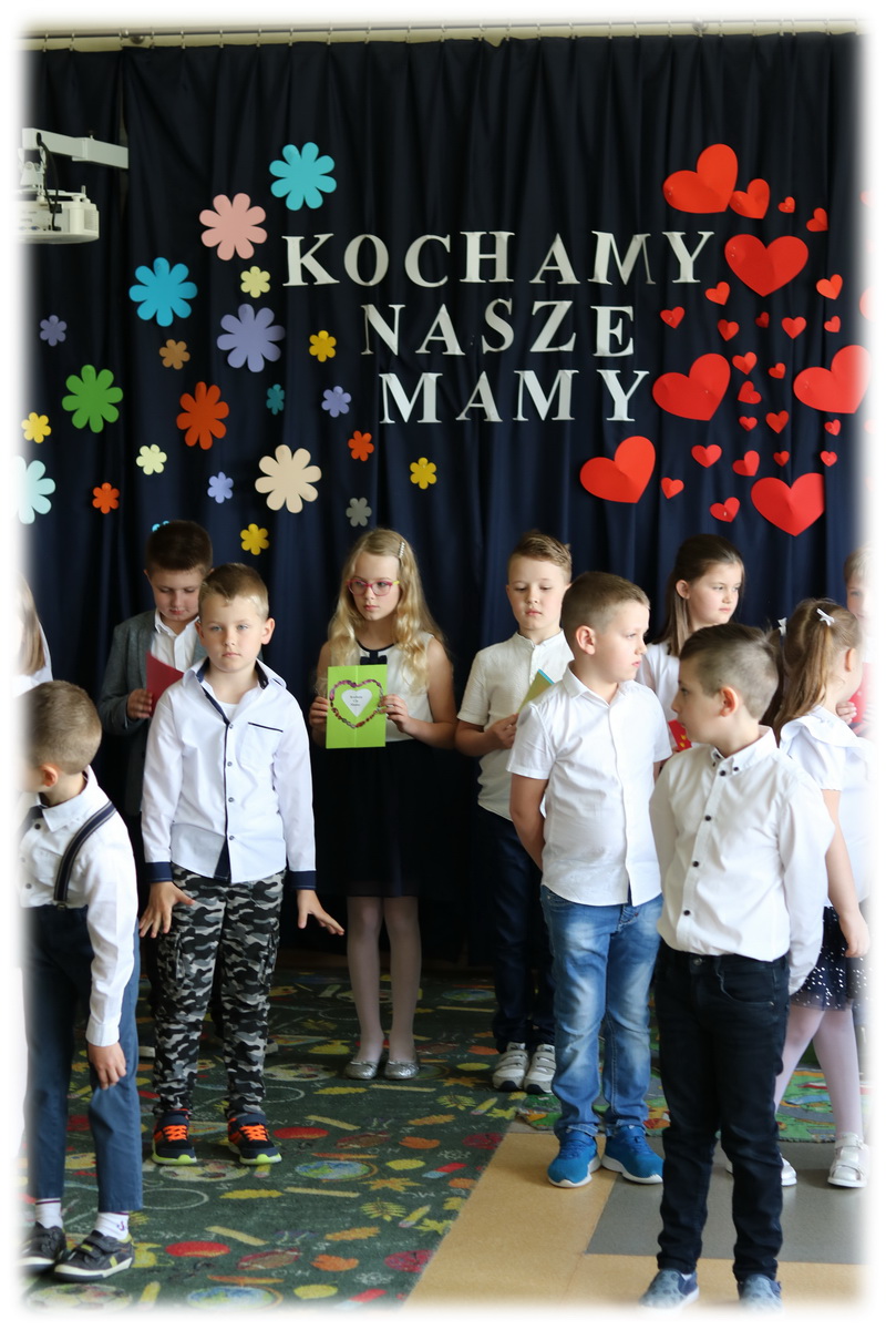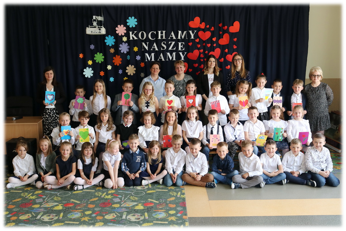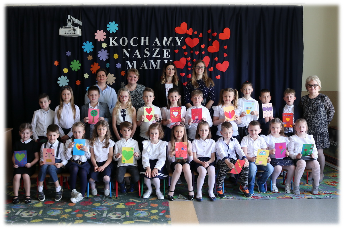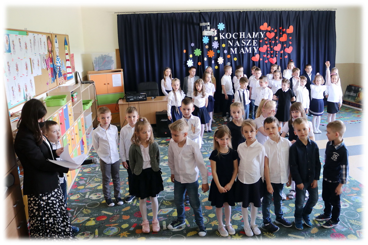 i przedszkolnego przed kamerą (bez udziału mam, ze względu na pandemię covid-19). Uczniowie recytowali wiersze, śpiewali piosenki z inscenizacją ruchową dla wszystkich "Mam". A prezentem dla mam była laurka z sercem i kwiatami oraz płyta CD, na którą nagrana została uroczystość. Gośćmi podczas tej uroczystości były: pani dyrektor szkoły - Bożena Nowak Justyna, oraz nauczycielki: pani Anetta Banaszczyk, pani Ada Lenarczyk, pani Monika Baryła. Na zakończenie zostało wykonane zdjęcia grupowe obu oddziałów oraz wszystkich obecnych nauczycieli wraz z panią dyrektor szkoły.