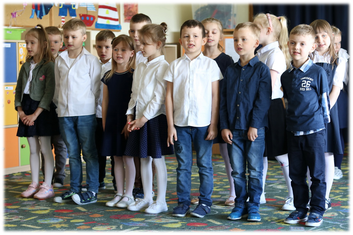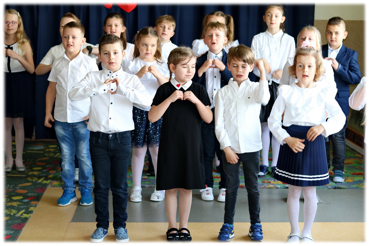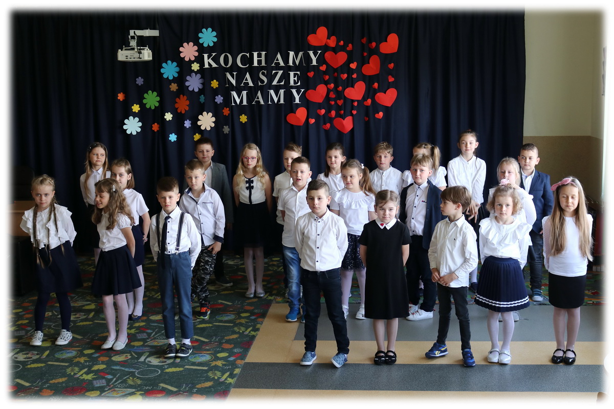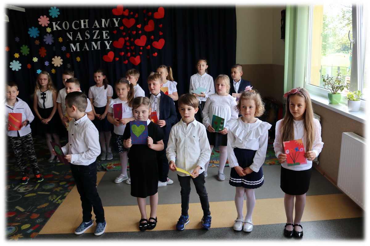i przedszkolnego przed kamerą (bez udziału mam, ze względu na pandemię covid-19). Uczniowie recytowali wiersze, śpiewali piosenki z inscenizacją ruchową dla wszystkich "Mam". A prezentem dla mam była laurka z sercem i kwiatami oraz płyta CD, na którą nagrana została uroczystość. Gośćmi podczas tej uroczystości były: pani dyrektor szkoły - Bożena Nowak Justyna, oraz nauczycielki: pani Anetta Banaszczyk, pani Ada Lenarczyk, pani Monika Baryła. Na zakończenie zostało wykonane zdjęcia grupowe obu oddziałów oraz wszystkich obecnych nauczycieli wraz z panią dyrektor szkoły.