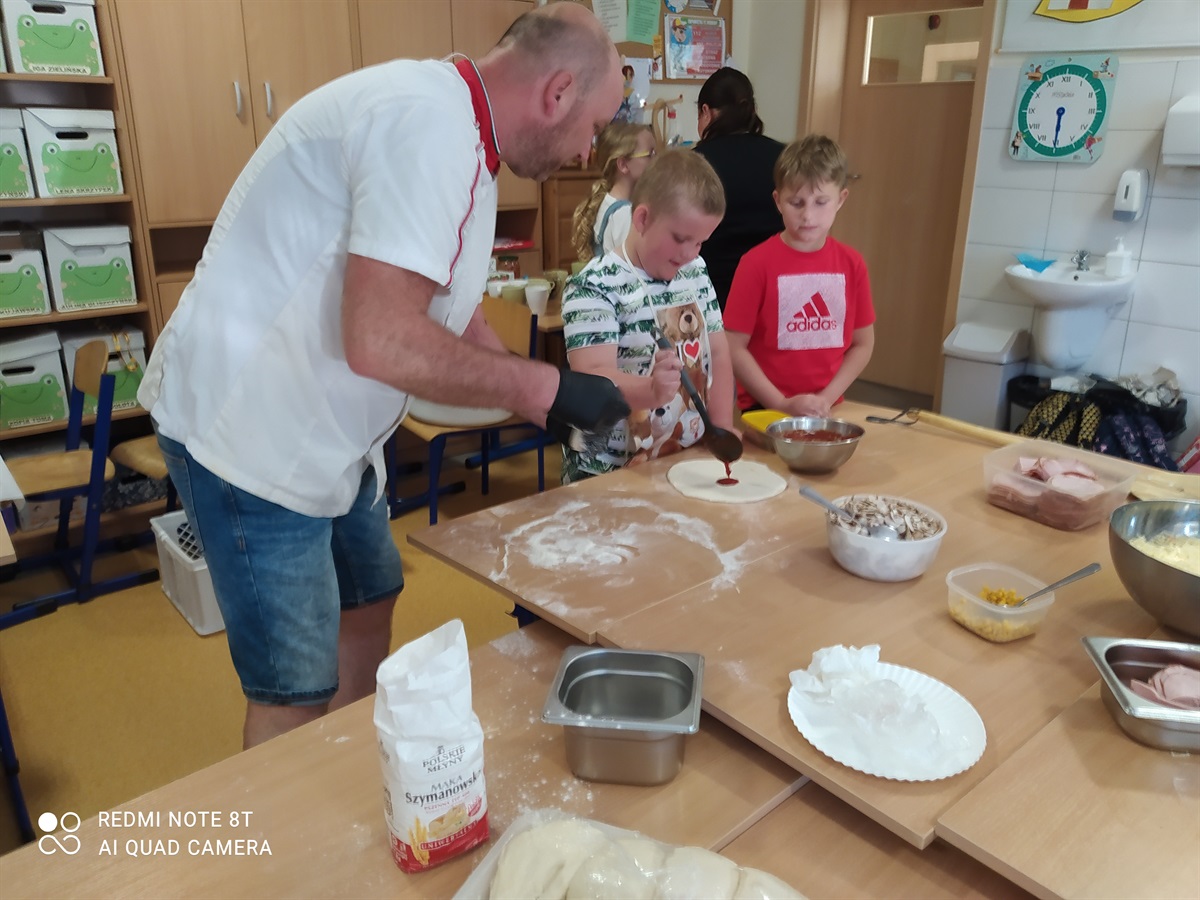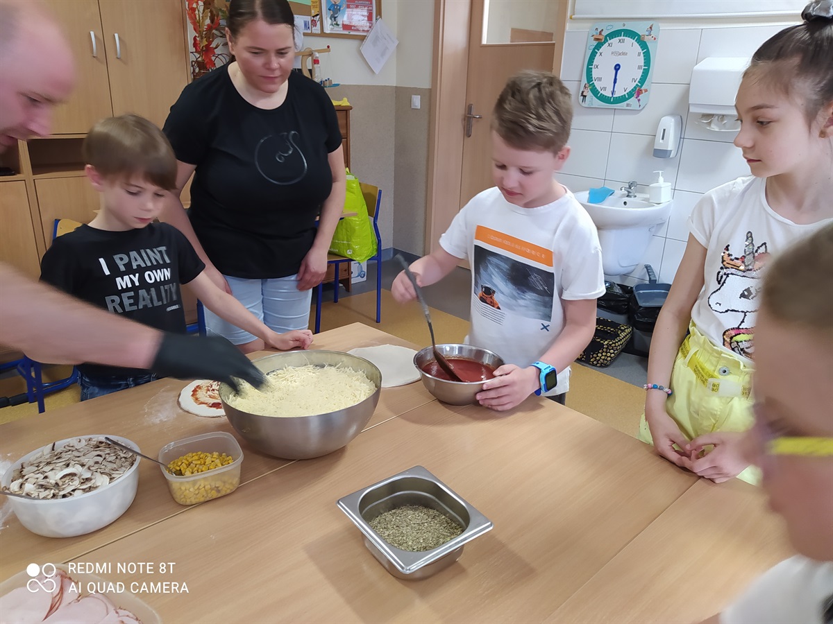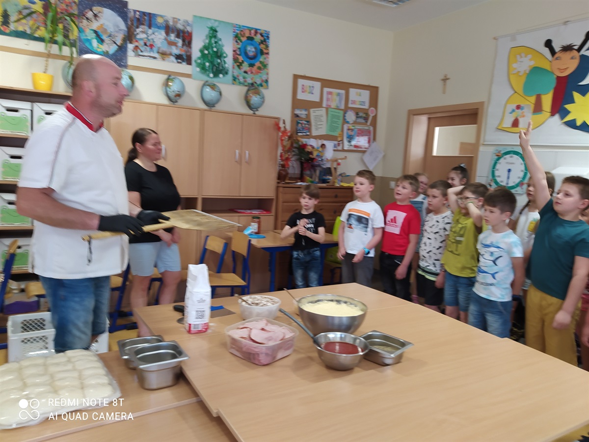 Rodzice zaproponowali, żeby w tym dniu odbył się - Dzień Pizzy. Pan Bartosz Mordaka - kucharz, pracujący w Pizzerii i jego żona Edyta Mordaka przybyli do oddziału z produktami potrzebnymi do zrobienia pizzy(ciasto, wszelkie dodatki:szynka, pieczarki, sery, sosy). Na przygotowanych stołach uczniowie oddziału pierwszego pod okiem pana Bartka wykonywali swoje pizze, które następnie zostały przeniesione do piekarnika. Uczniowie zajadali się pyszną pizza, którą sami wykonali pod okiem znakomitego kucharza. W przerwach uczniowie tańczyli zumbę, z układem ruchowym, naśladując grupy taneczne na youtube.