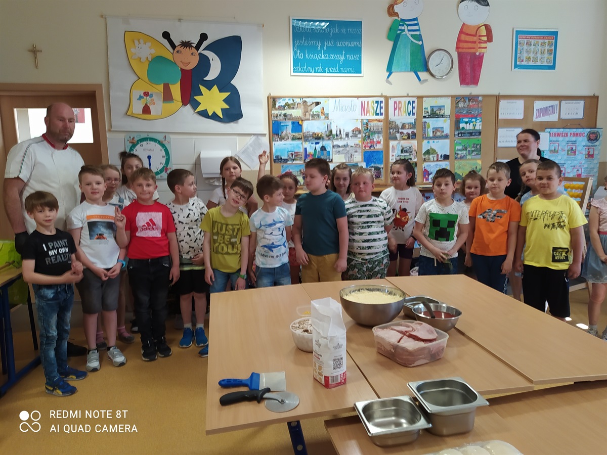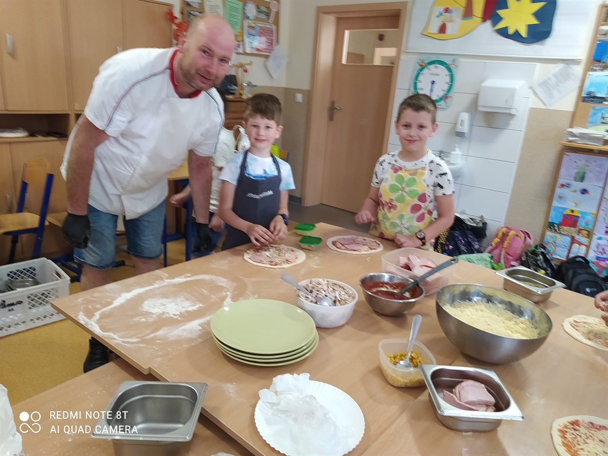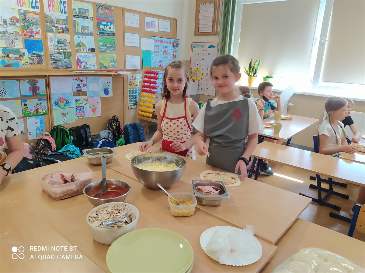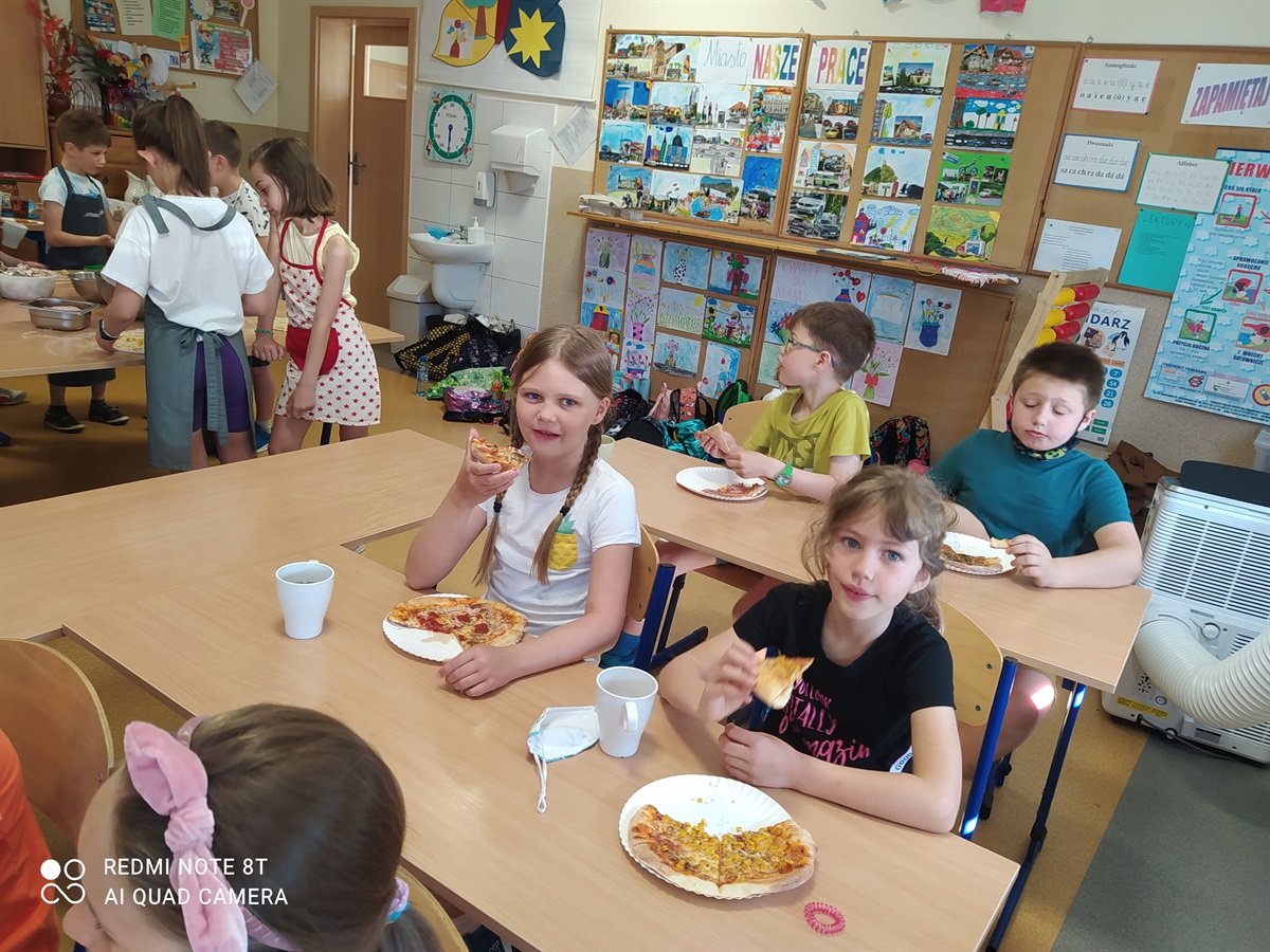 Rodzice zaproponowali, żeby w tym dniu odbył się - Dzień Pizzy. Pan Bartosz Mordaka - kucharz, pracujący w Pizzerii i jego żona Edyta Mordaka przybyli do oddziału z produktami potrzebnymi do zrobienia pizzy(ciasto, wszelkie dodatki:szynka, pieczarki, sery, sosy). Na przygotowanych stołach uczniowie oddziału pierwszego pod okiem pana Bartka wykonywali swoje pizze, które następnie zostały przeniesione do piekarnika. Uczniowie zajadali się pyszną pizza, którą sami wykonali pod okiem znakomitego kucharza. W przerwach uczniowie tańczyli zumbę, z układem ruchowym, naśladując grupy taneczne na youtube.