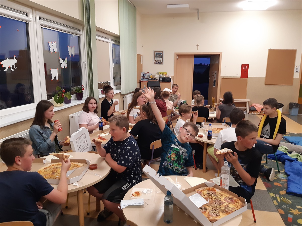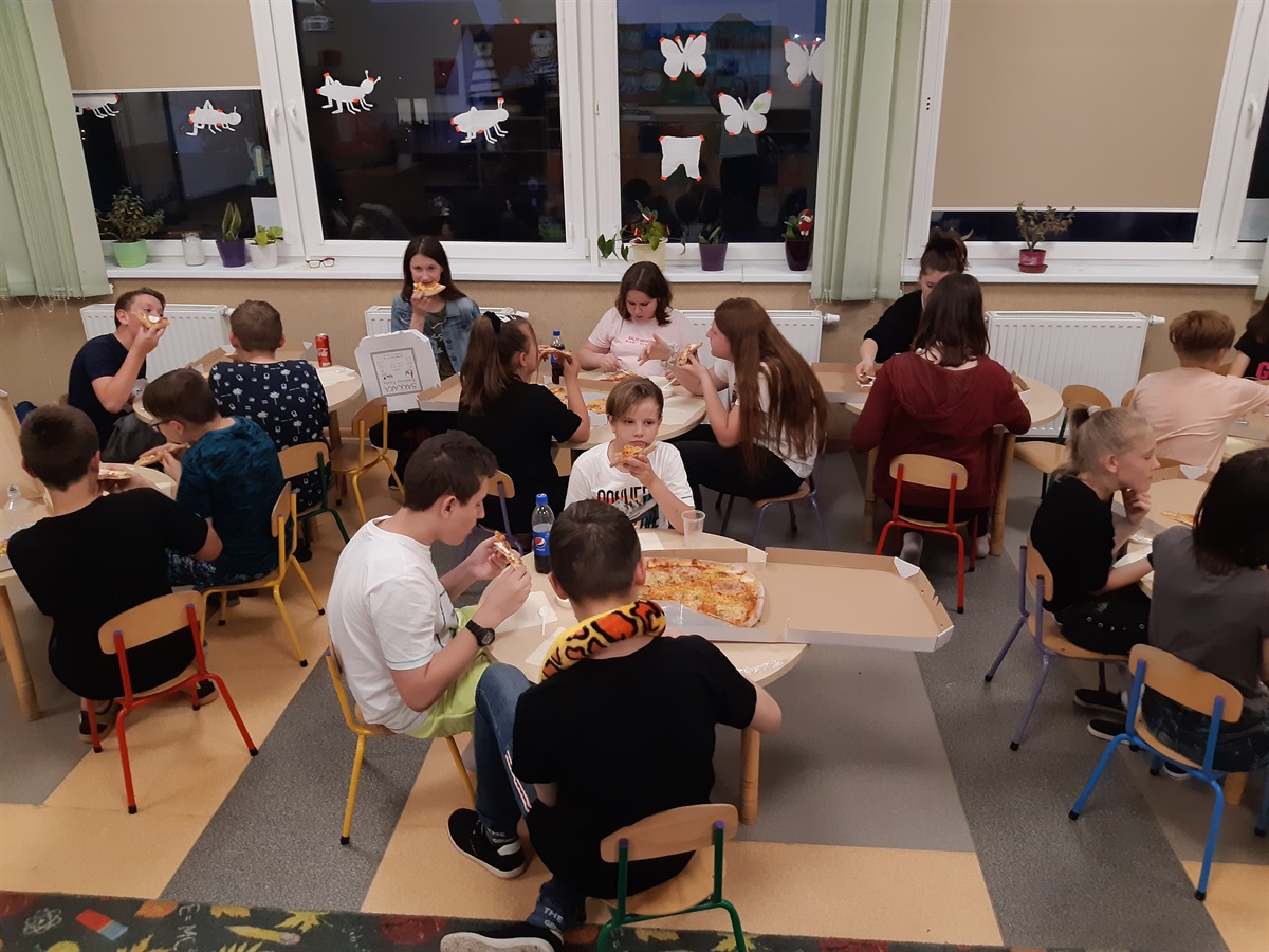 Po wyczynach sportowych przyszedł czas na regenerację sił – pizza i drobne przekąski zrobiły swoje – wszyscy chętnie zabrali się do gier towarzyskich, rozmów i wspólnego słuchania muzyki, oglądania filmów. Oczywiście wszystkie prezentowane utwory były odpowiednio dobrane do wieku i możliwości uczestników oraz szczegółowo omówione w trakcie spotkania.