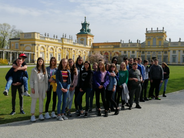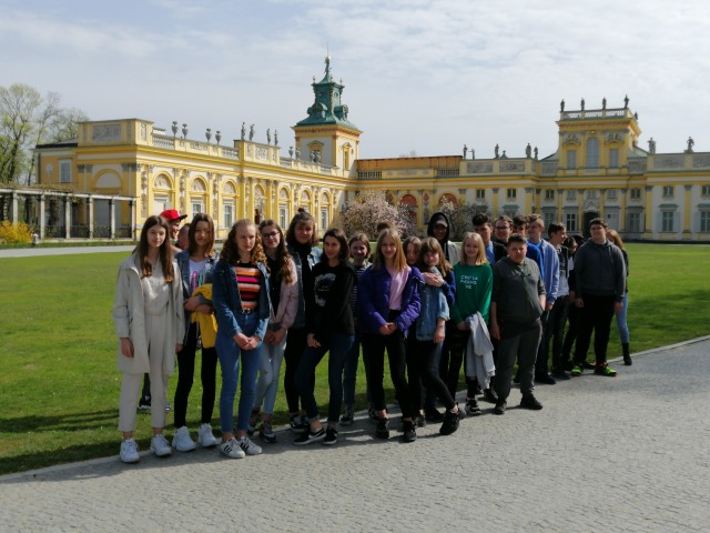 W dniach 24-25 kwietnia uczniowie klasy VII i VIII uczestniczyli w dwudniowej wycieczce do Warszawy. Wśród pierwszych atrakcji znalazł się Pałac w Wilanowie. W czasie wizyty u króla Jana III udaliśmy się na spacer po królewskich apartamentach. W dawnej rezydencji władcy obejrzeliśmy jego portrety, przedmioty oraz malowidła sławiące jego męstwo. Ukryta w nich historia tworzy barwną opowieść o losach tego walecznego monarchy. Zobaczyliśmy, w co ubierał się król, i przekonaliśmy się, ile czasu zajmowało mu przepasanie się pasem kontuszowym. Przyjrzeliśmy się królewskim komnatom i dowiedzieliśmy się, dlaczego król i królowa przyjmowali gości w swoich sypialniach. Barwne anegdoty pozwoliły poznać nie tylko wilanowski pałac, ale przede wszystkim króla, zwanego Lwem Lechistanu. Po wyjściu z pałacu, odbyliśmy krótki spacer po ogrodzie wilanowskim, w którym mogliśmy podziwiać uroki wiosny.