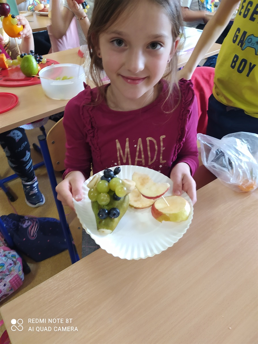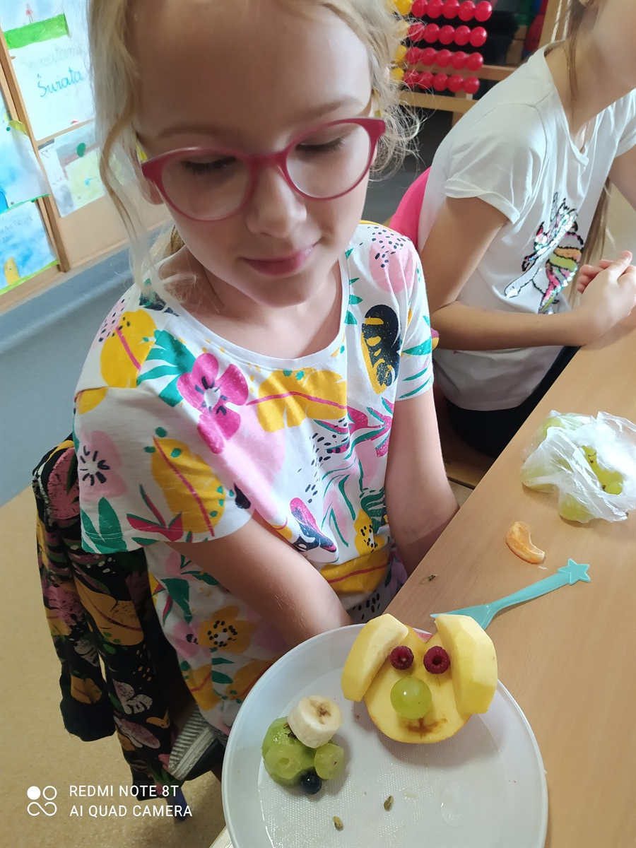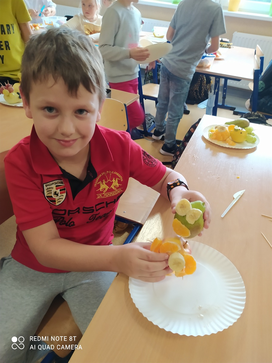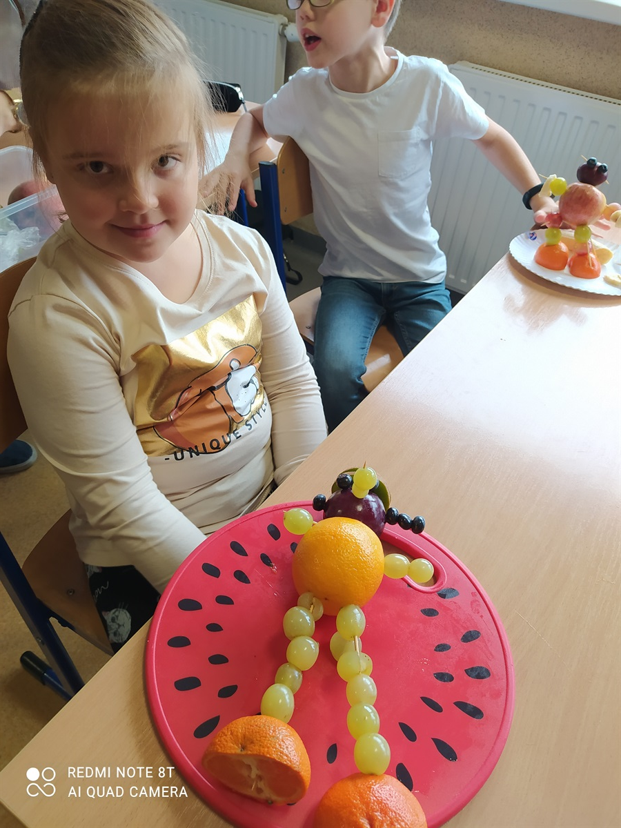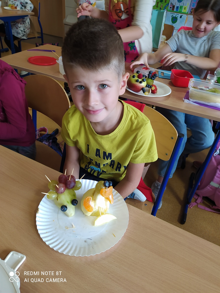 W ramach Programu dla szkół oddział drugi w dniu 8.10.2021 r.  realizował tematykę dotyczącą zdrowego odżywiania się. Podczas zajęć uczniowie wykonali "Smakołyki dla Pani" - "Owocowe ludki". Zostały wykonane z owoców, które uczniowie przynieśli, według własnych pomysłów. Po wykonaniu  prac, uczniowie wraz z panią wychowawczynią delektowali się "Owocowymi ludkami". Uczniowie w ten sposób uczyli się zasad zdrowego odżywiania - spożywania owoców, które mają dużo witamin i codzienne ich spożywanie wpływa na odporność naszego organizmu przed chorobami.