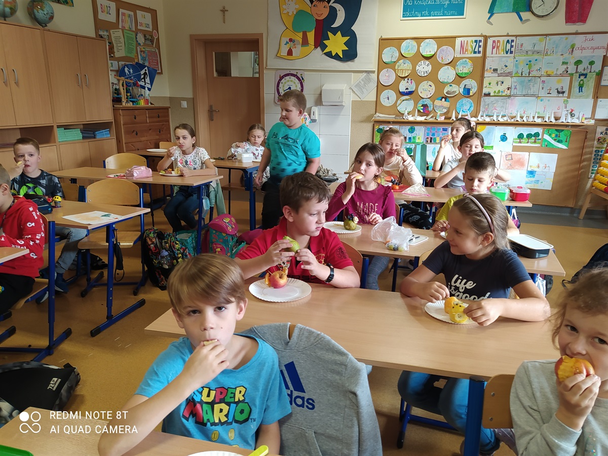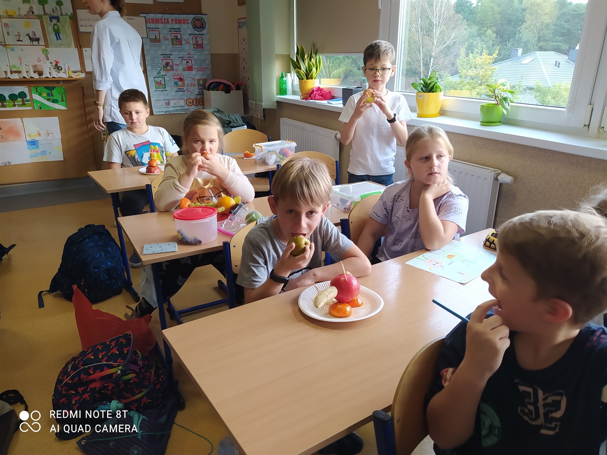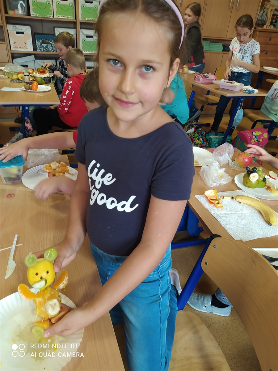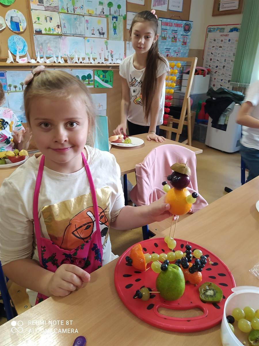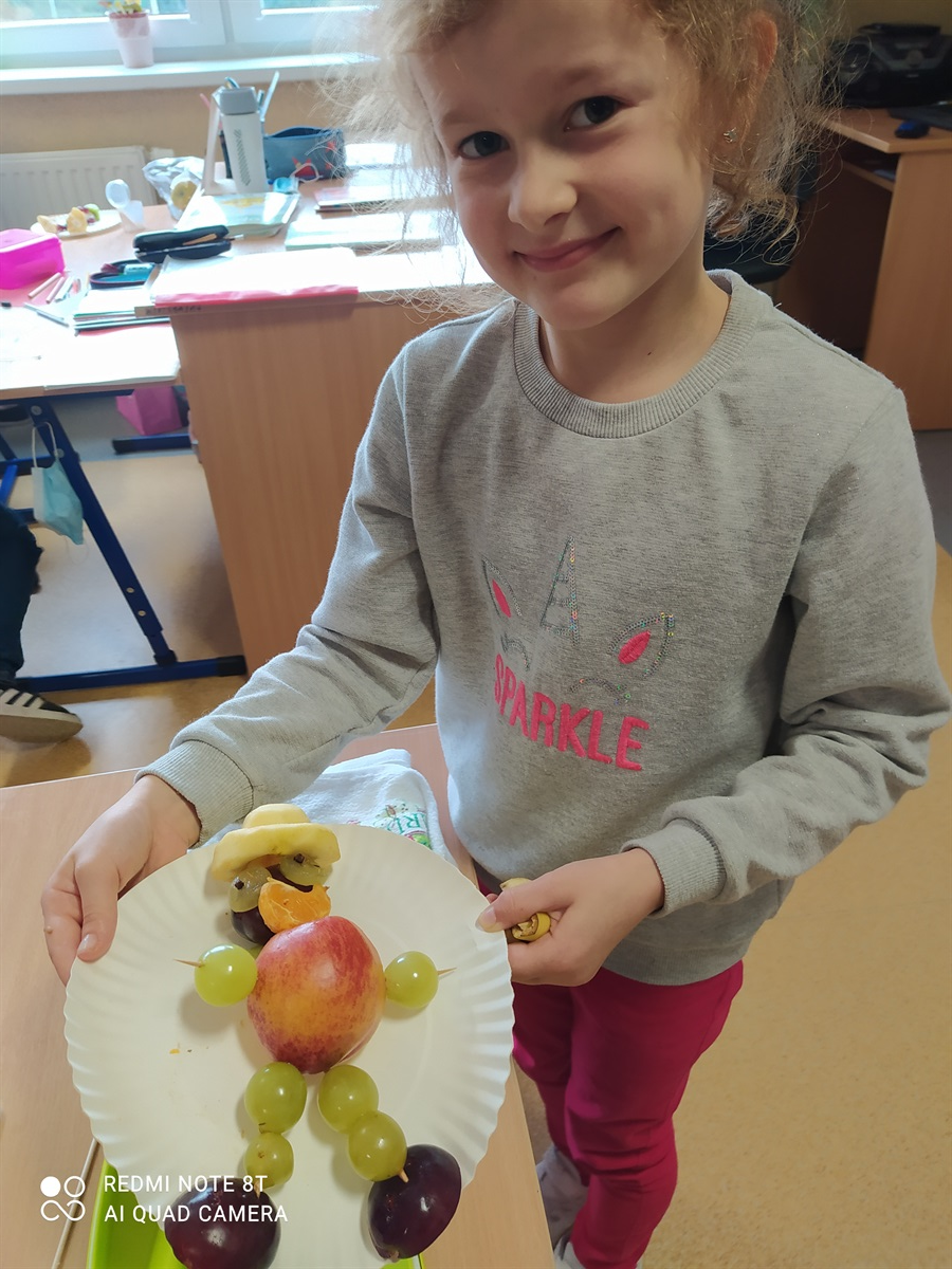 W ramach Programu dla szkół oddział drugi w dniu 8.10.2021 r.  realizował tematykę dotyczącą zdrowego odżywiania się. Podczas zajęć uczniowie wykonali "Smakołyki dla Pani" - "Owocowe ludki". Zostały wykonane z owoców, które uczniowie przynieśli, według własnych pomysłów. Po wykonaniu  prac, uczniowie wraz z panią wychowawczynią delektowali się "Owocowymi ludkami". Uczniowie w ten sposób uczyli się zasad zdrowego odżywiania - spożywania owoców, które mają dużo witamin i codzienne ich spożywanie wpływa na odporność naszego organizmu przed chorobami.