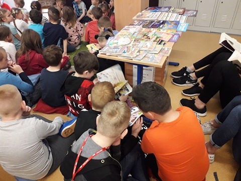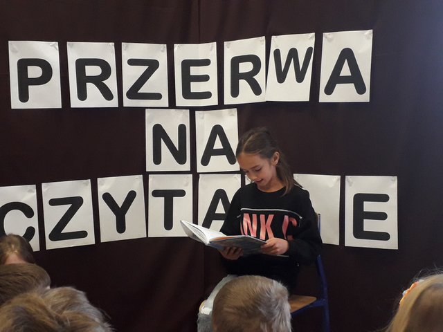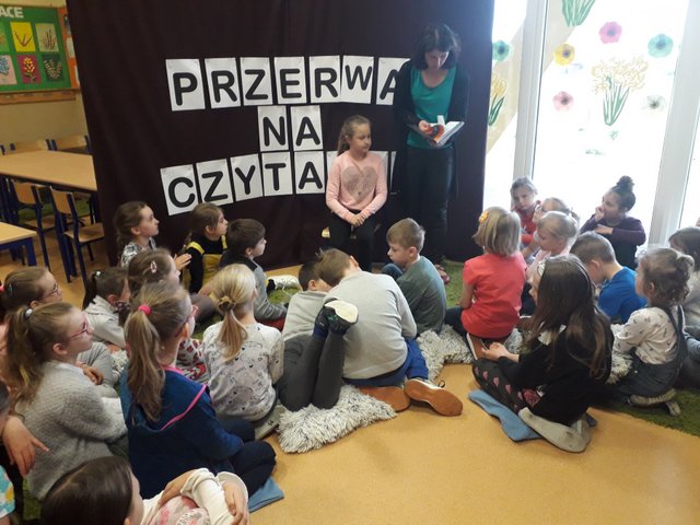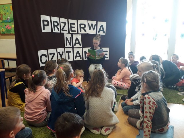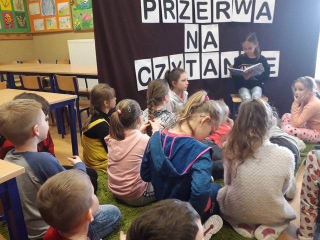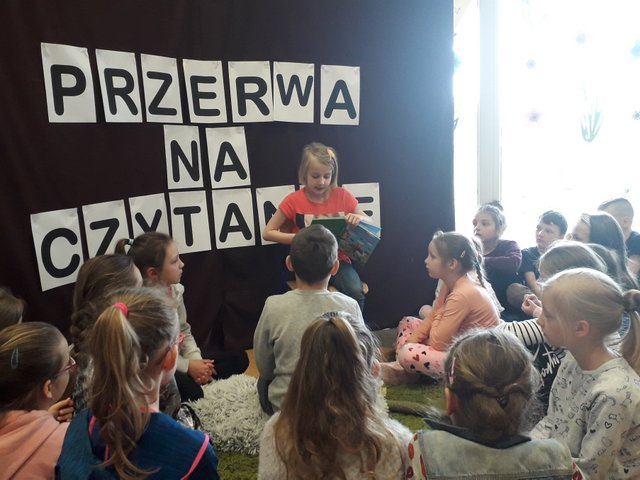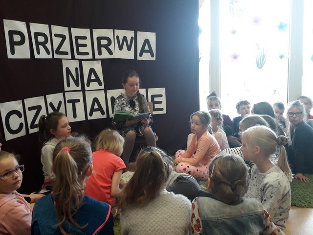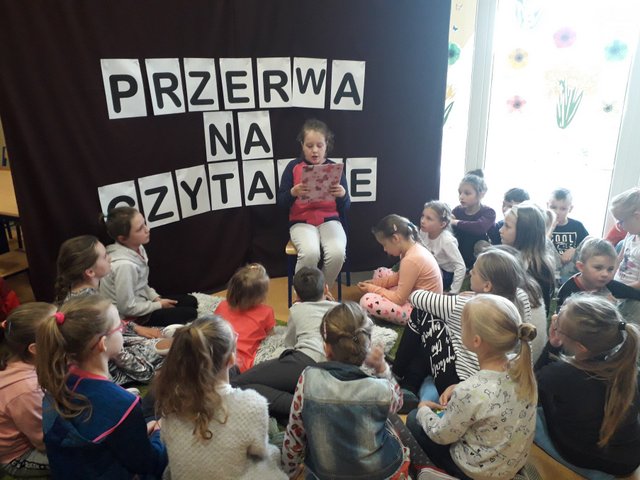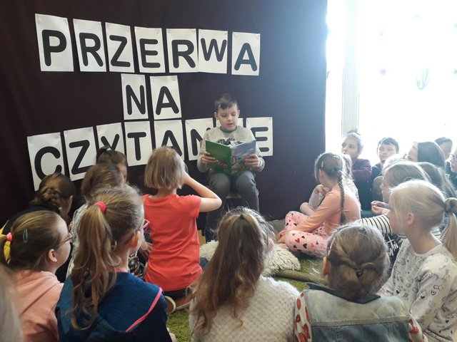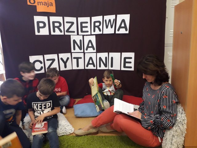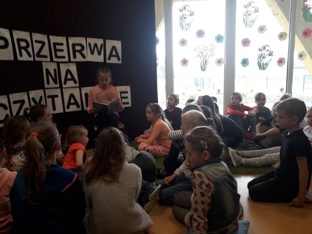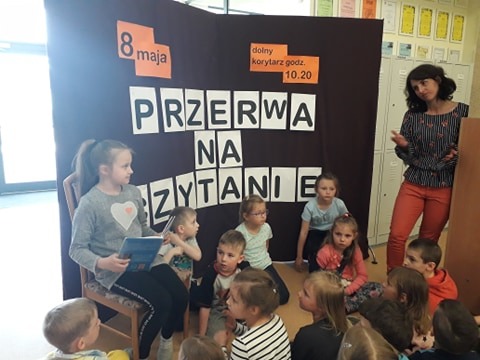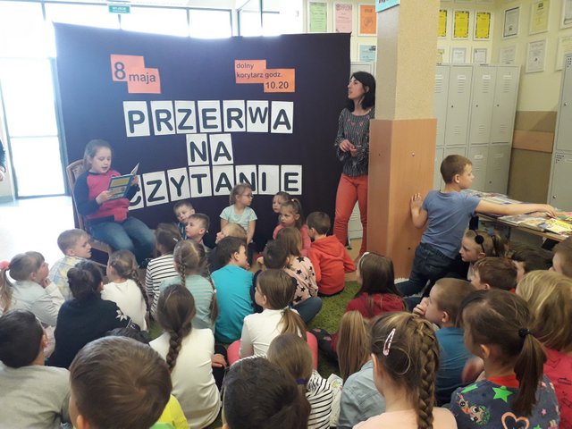 8 i 9 maja 2019 r. nasza szkoła wzięła udział w ogólnopolskiej akcji  czytelniczej pod hasłem „Przerwa na czytanie”. Chętni z oddziału przedszkolnego i klas I – VIII z entuzjazmem przystąpili do bicia rekordu osób czytających podczas przerw.