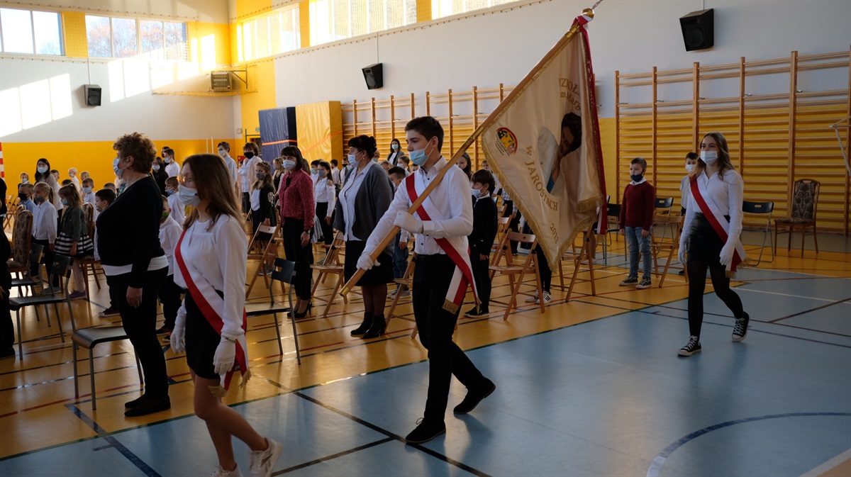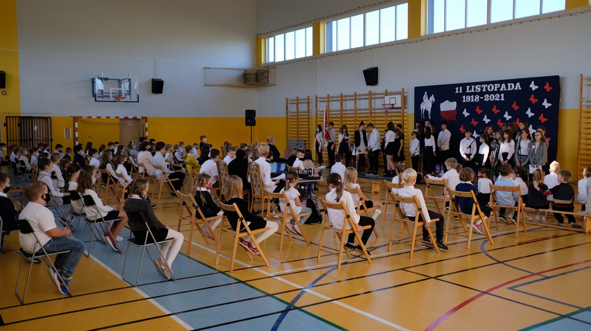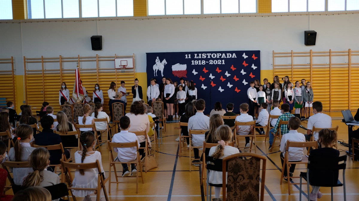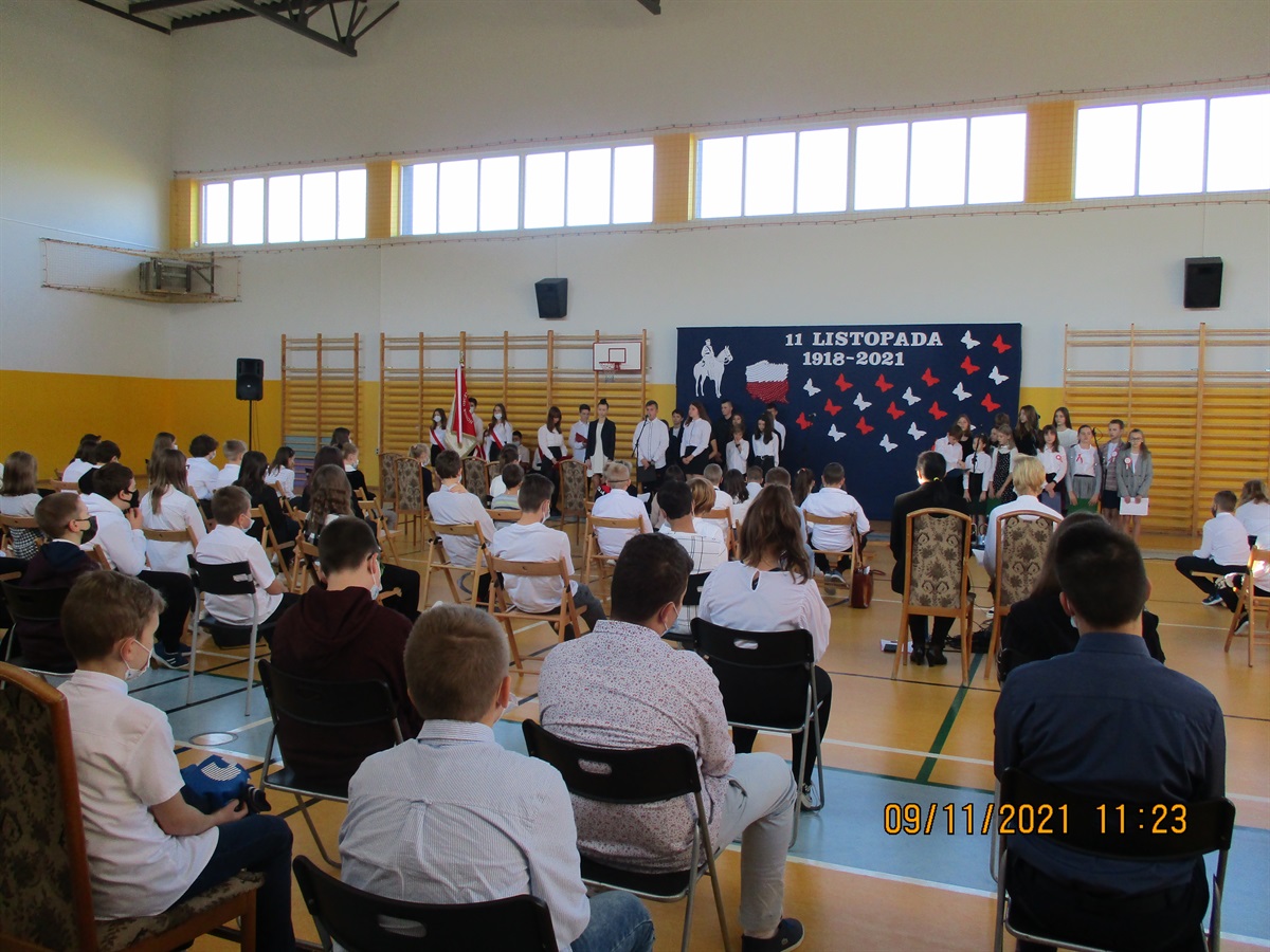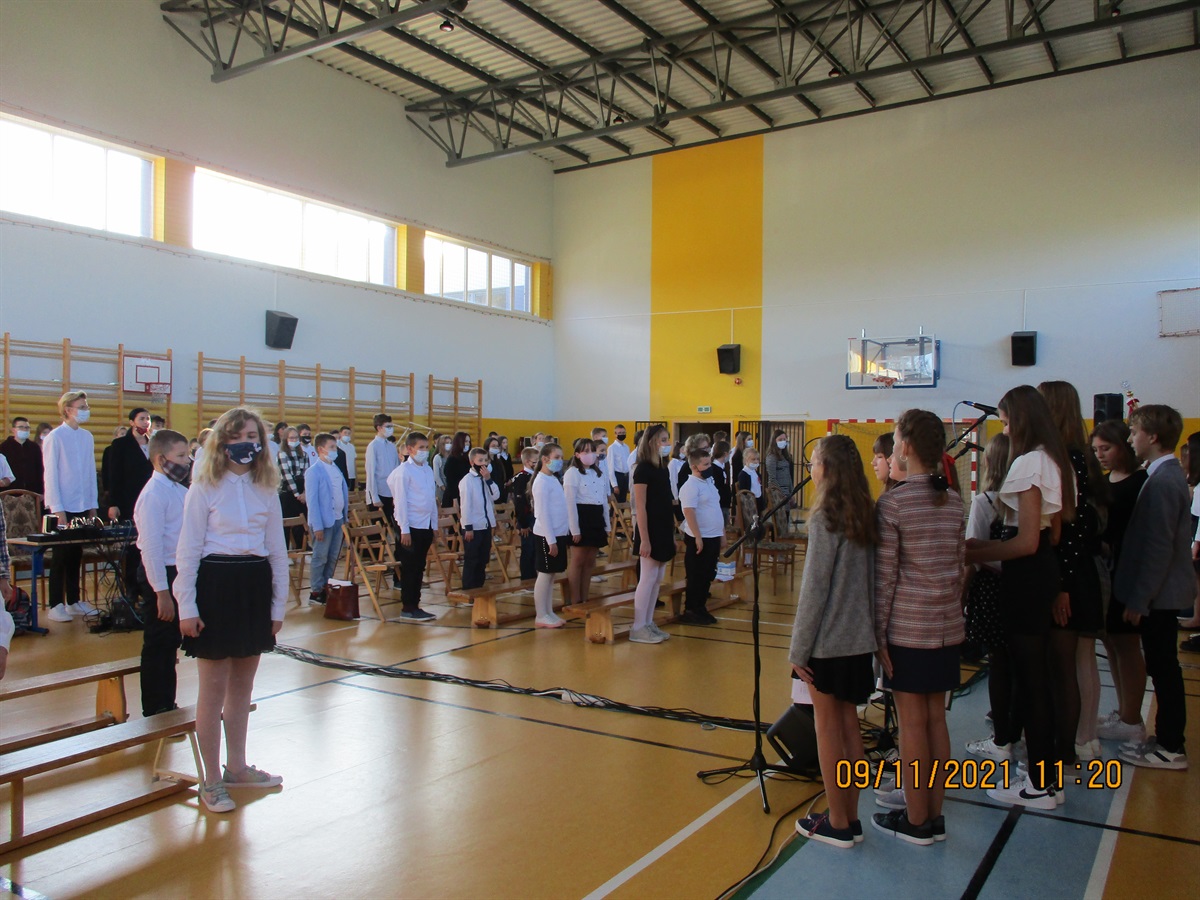 W środę 10.11.2021 r. odbyły  się w naszej szkole obchody 103 Rocznicy Odzyskania przez Polskę Niepodległości. Narodowe Święto Niepodległości to dla Polaków jedno z najważniejszych świąt państwowych. Po 123 latach zaborów nasz kraj odzyskał suwerenność. W wyniku upadku potęg zaborczych i własnych działań Polska po wielu dziesięcioleciach powróciła na mapy Europy. Stało się to głównie dzięki wytrwałości i ofiarności aktywnej części polskiego społeczeństwa, które w okresie niewoli przekazywało młodym Polakom przywiązanie do języka i kultury narodowej. O godzinie 8.40  i 9.35 odbyły się akademie przygotowane przez klasy VII i VIII b. Uczniowie w piękny sposób oddali cześć bohaterom walczącym za naszą wolność. Natomiast o godz. 11.11 wszyscy uczniowie w ramach akcji "Szkoła do hymnu" odśpiewali hymn państwowy.
