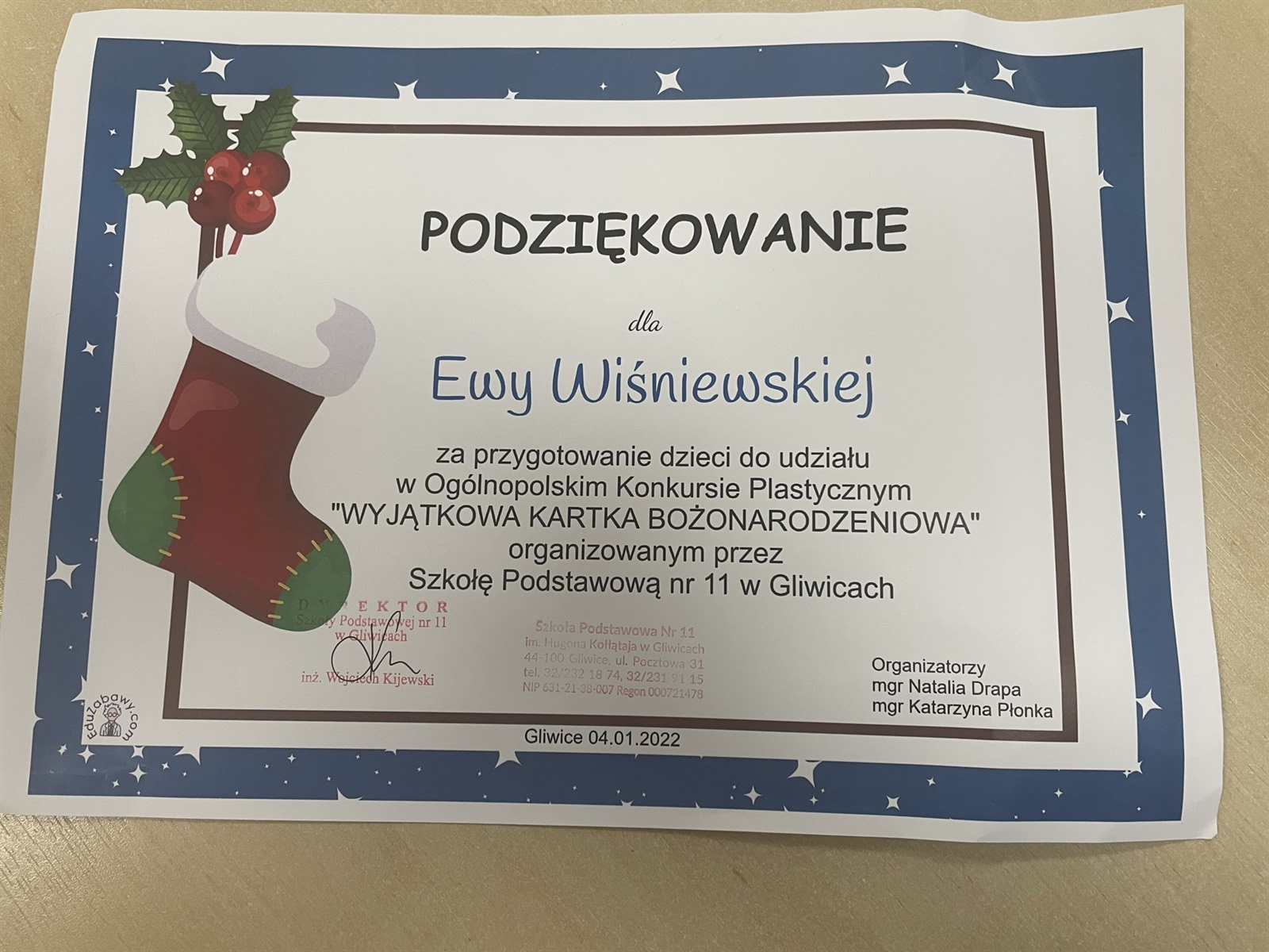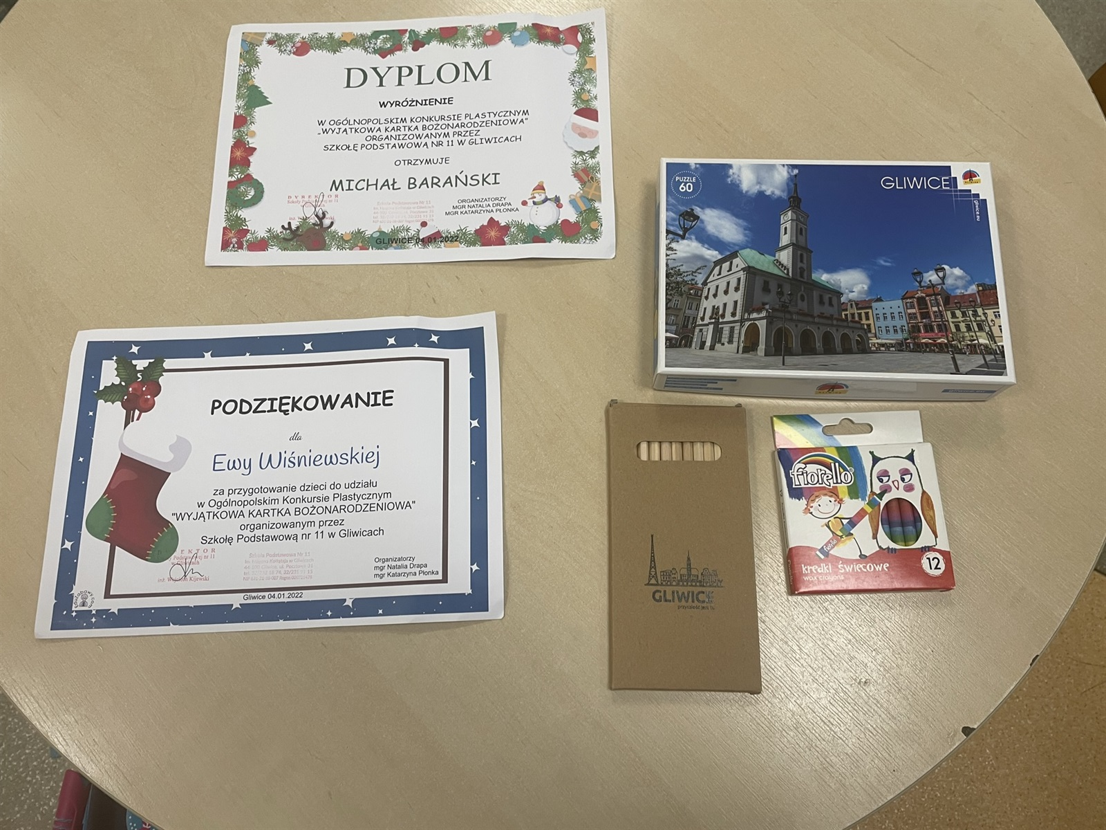 Michał Barański (uczeń oddziału przedszkolnego) otrzymał nagrodę rzeczową w ramach uzyskanego wyróżnienia, za stworzenie wyjątkowej kartki świątecznej w kształcie Mikołaja. Wszystko to w ramach ogólnopolskiego konkursu plastycznego „Wyjątkowa Kartka Bożonarodzeniowa”, który odbył się w Szkole Podstawowej nr 11 w Gliwicach. Konkurs organizowany był przez tamtejszy oddział przedszkolny.
