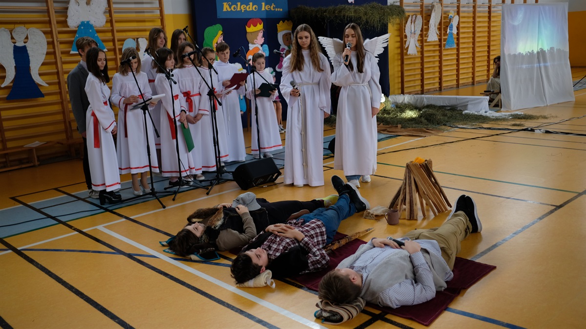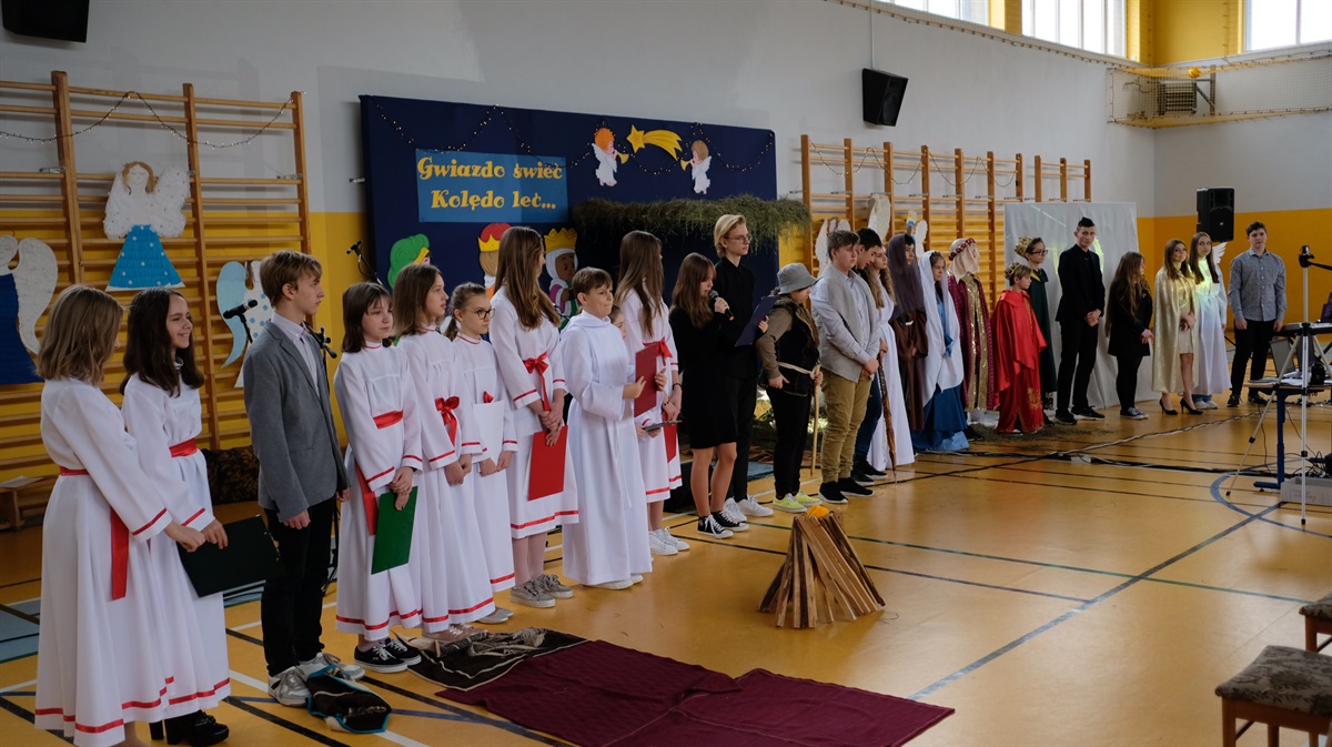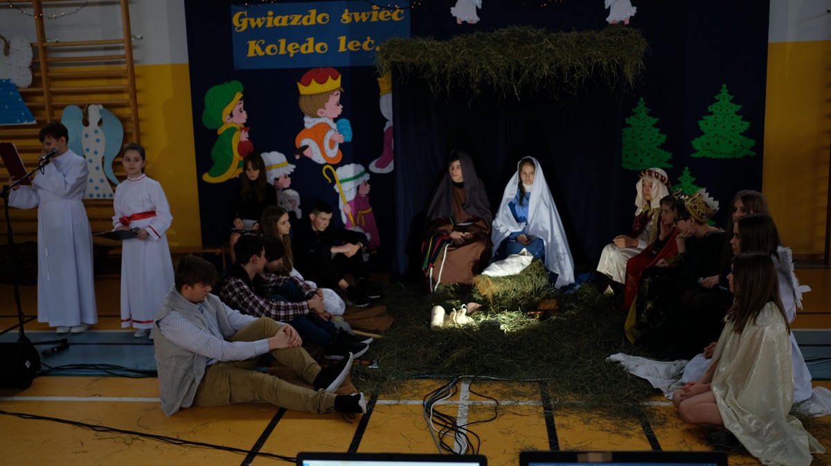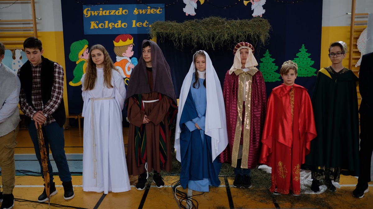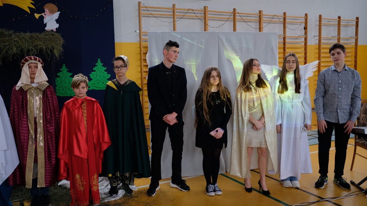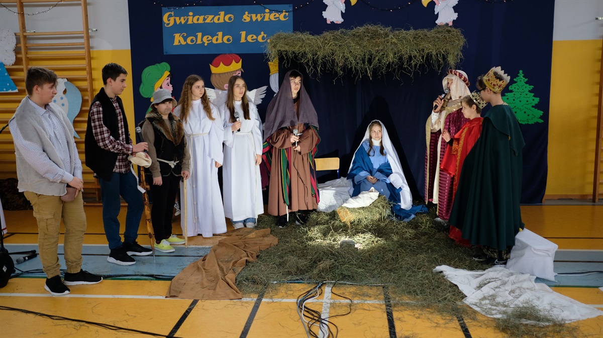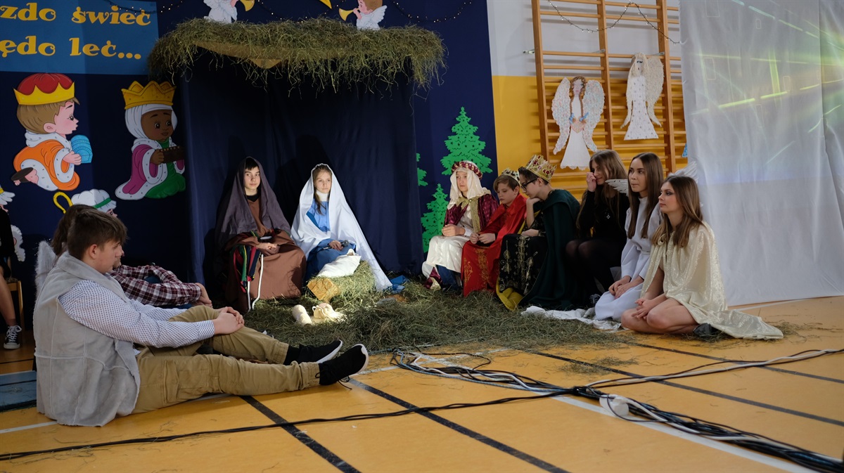 Okres Bożego Narodzenia już za nami. Mimo to chcielibyśmy podzielić się ze wszystkimi krótką relacją z naszego przedstawienia jasełkowego. Wydawało się, że nasze plany nie dojdą do skutku, niestety,  tuż przed świętami zostało wprowadzone zdalne nauczanie. Dzięki determinacji naszych aktorów występ doszedł do skutku. Jasełka odbyły się 26 stycznia. Wielką radością było to, że cała szkoła mogła obejrzeć przedstawienie. Warto zaznaczyć, że ta data okazała się starzałem w dziesiątkę, ponieważ już od 27 stycznia starsze klasy przechodziły ponownie na zdalne nauczanie.