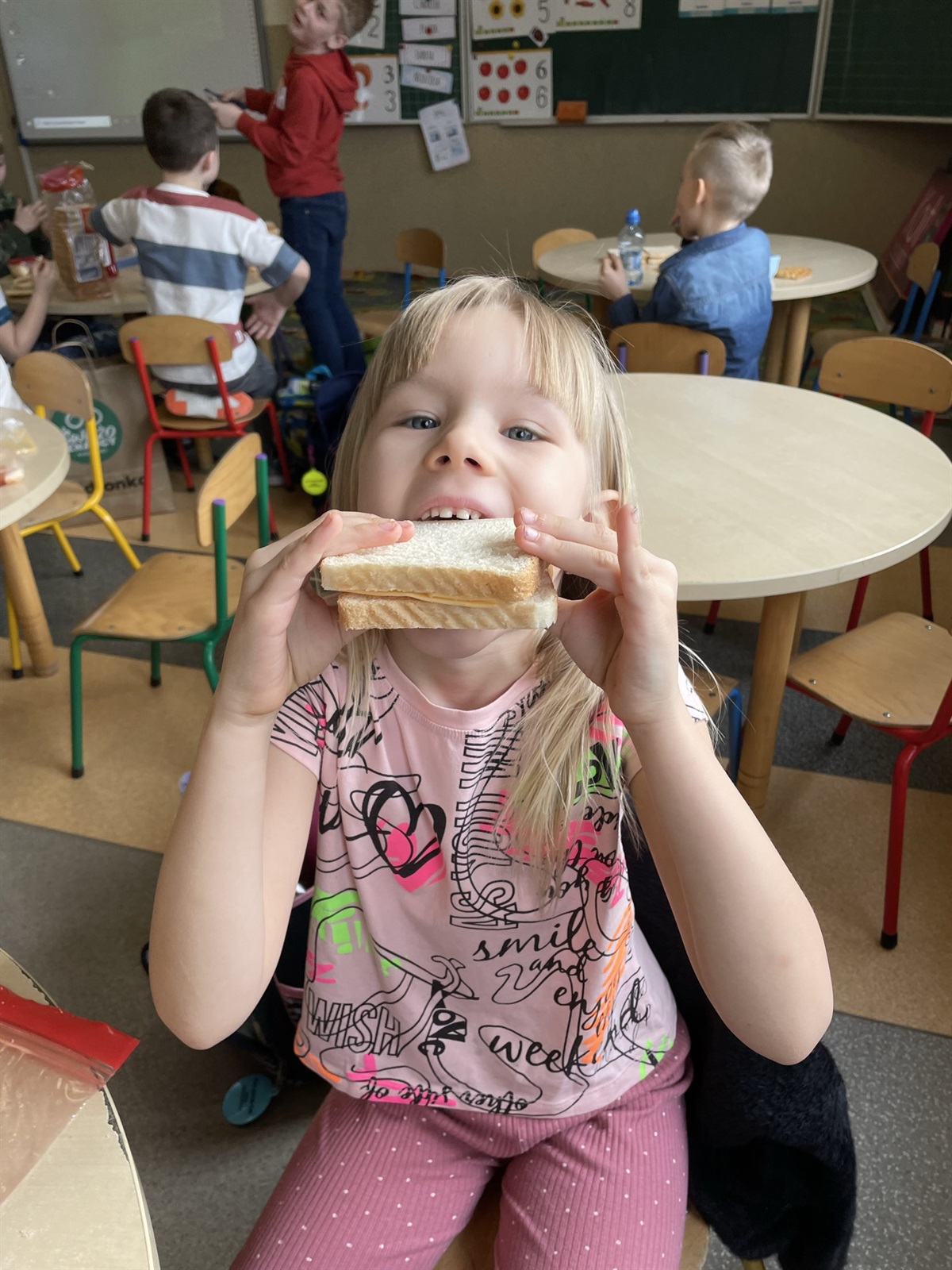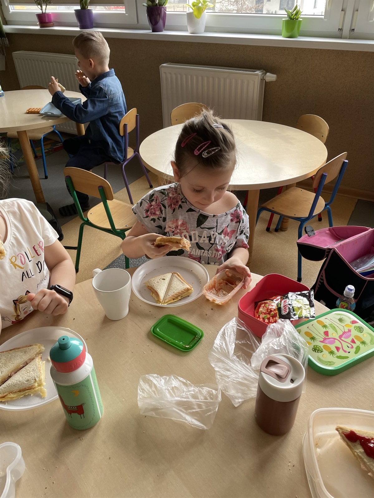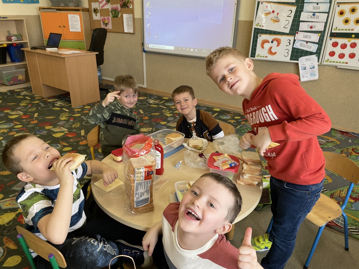 Tosty są przysmakiem każdego dziecka i dorosłego. Choć mało ludzi zdaje sobie sprawę, że są dość kaloryczne, mają bagatela 313,3 kcal. Każdego głodomora są więc w stanie nasycić, by natrętne burczenie w brzuchu nie męczyło i nie odwracało uwagi od dnia codziennego. Maluchy z oddziału przedszkolnego w środowy poranek (16.03.2022 roku) mogły ukoić burczące brzuszki skosztowaniem tej pysznej przekąski. Najpierw oglądając prezentacje multimedialną poznały postać Charles’a Strite’a - Amerykanina, który rozpoczął „boom” i „tostową rewolucję” tworząc w 1919 roku urządzenie z zegarem oraz sprężynami czyli pierwszy tak zautomatyzowany toster. Przedszkolaki poznały rodzaje tostów francuski, z Focacci itp. Zapoznały się z budową współczesnego tostera. Mogły rozwiązywać multimedialne puzzle z tostami, quiz