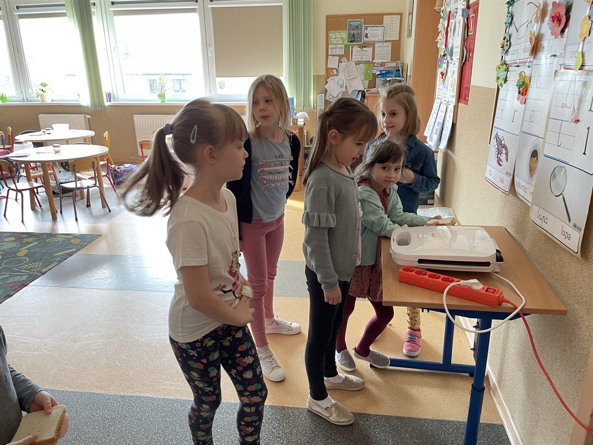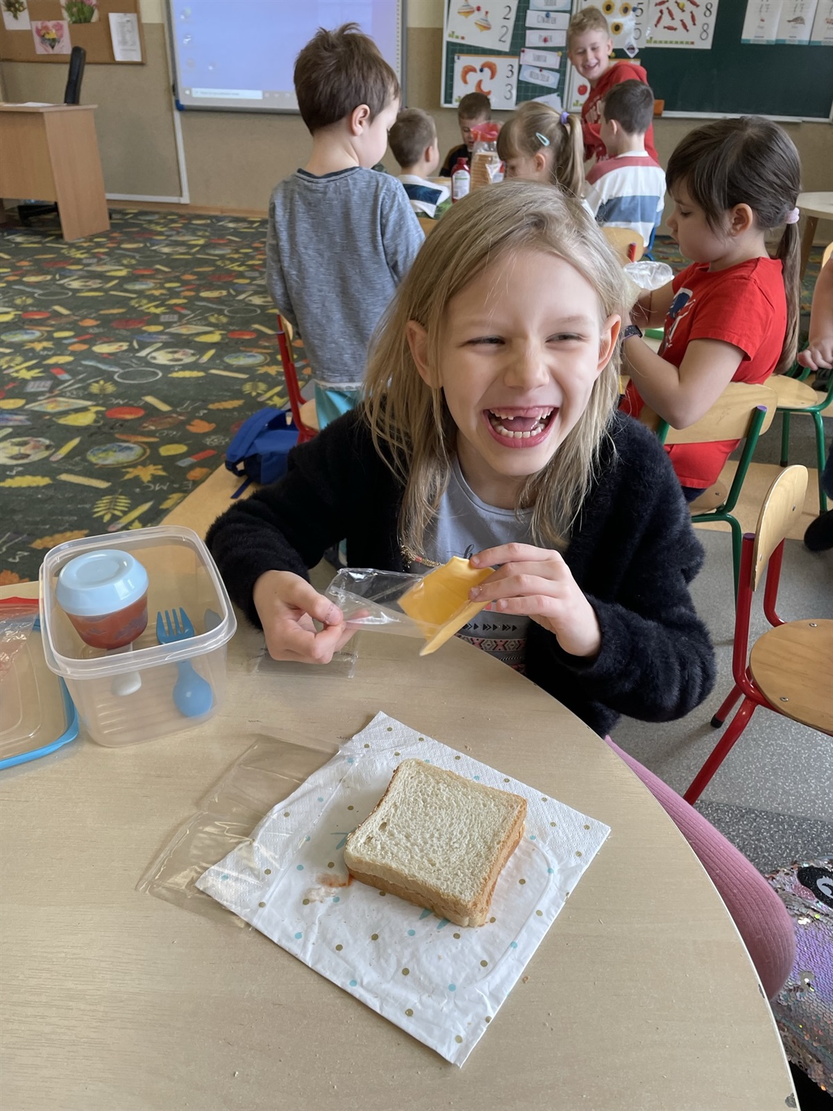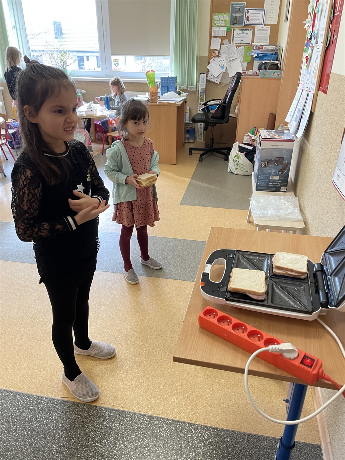 Tosty są przysmakiem każdego dziecka i dorosłego. Choć mało ludzi zdaje sobie sprawę, że są dość kaloryczne, mają bagatela 313,3 kcal. Każdego głodomora są więc w stanie nasycić, by natrętne burczenie w brzuchu nie męczyło i nie odwracało uwagi od dnia codziennego. Maluchy z oddziału przedszkolnego w środowy poranek (16.03.2022 roku) mogły ukoić burczące brzuszki skosztowaniem tej pysznej przekąski. Najpierw oglądając prezentacje multimedialną poznały postać Charles’a Strite’a - Amerykanina, który rozpoczął „boom” i „tostową rewolucję” tworząc w 1919 roku urządzenie z zegarem oraz sprężynami czyli pierwszy tak zautomatyzowany toster. Przedszkolaki poznały rodzaje tostów francuski, z Focacci itp. Zapoznały się z budową współczesnego tostera. Mogły rozwiązywać multimedialne puzzle z tostami, quiz