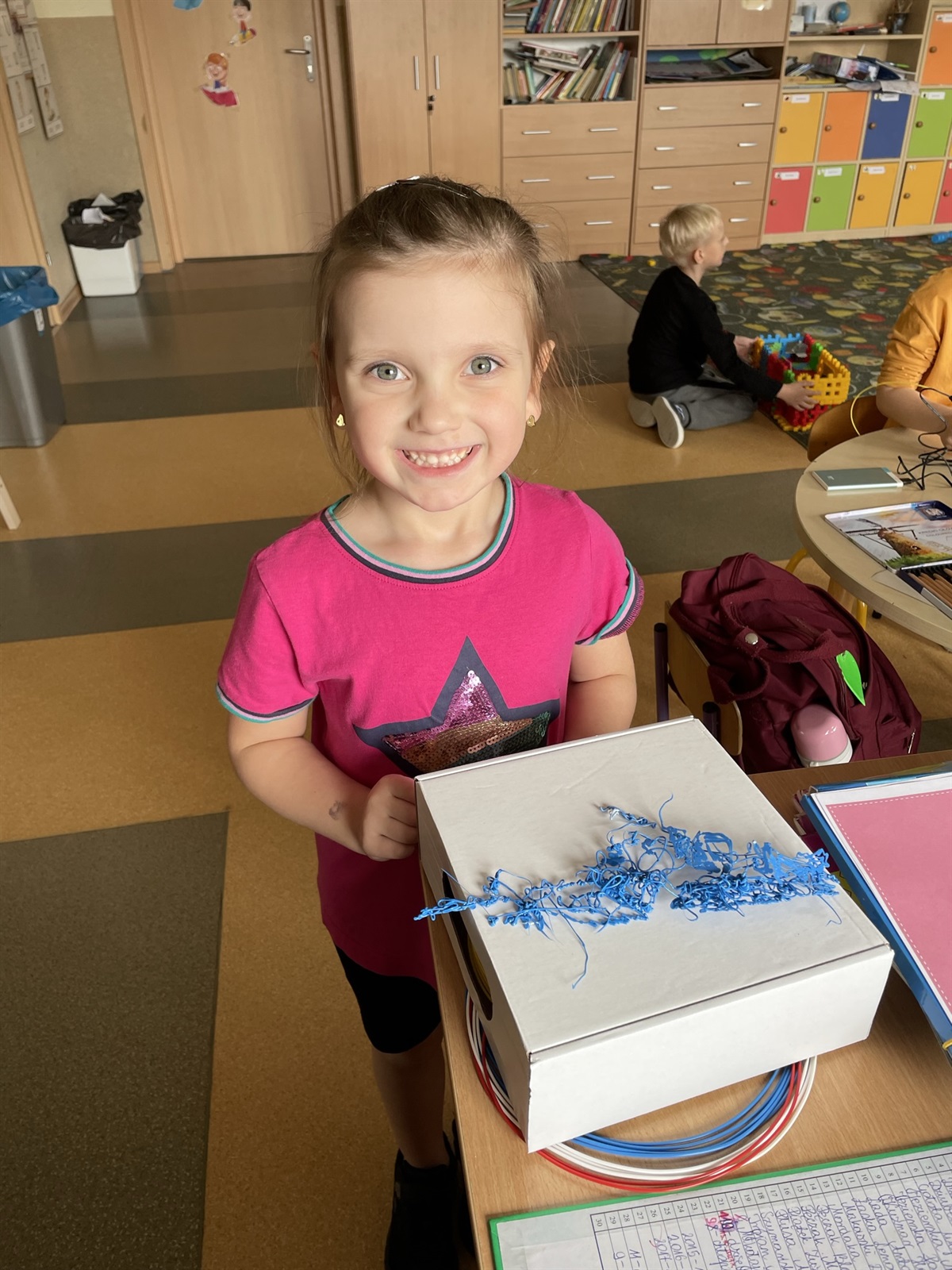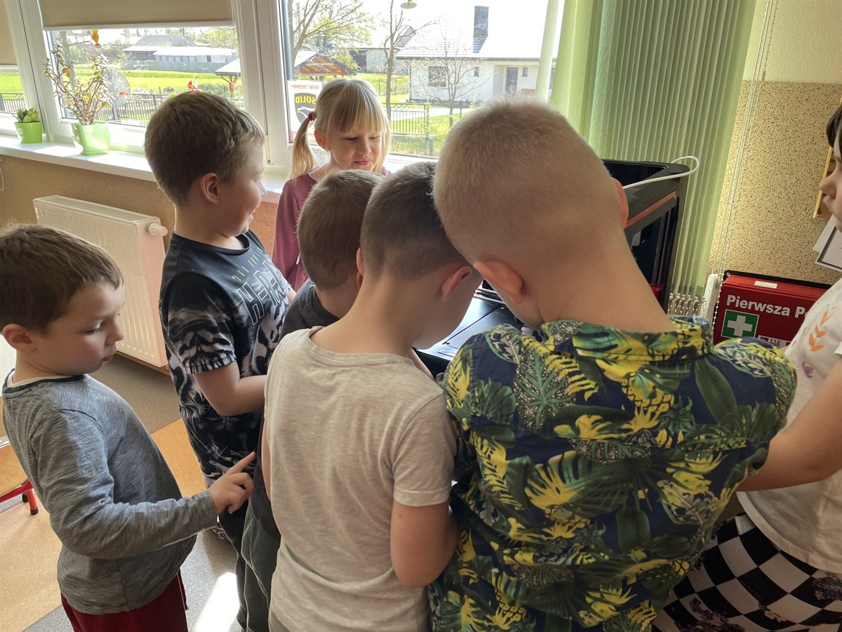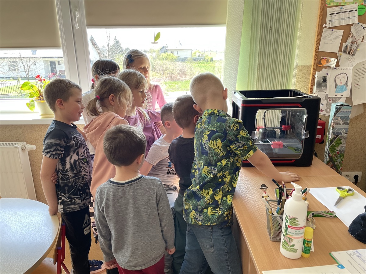 Nasza klasa oddziału przedszkolnego aż kipi od najwyższej jakości technologicznych nowinek. Podczas zajęć aktywnie bawimy się robotami marki GeniBot, które rysują figury, można nimi sterować, zmieniać światła, a także wydają dźwięki. Świetnie nadają się do zabaw z zakresu kodowania i programowania. Duma nas rozpiera z posiadania nowoczesnej drukarki Banach 3D, która drukuje dla nas przestrzenne bryły, figury. Jesteśmy pierwszym w gminie Moszczenica przedszkolem, które może poszczycić się tak nowoczesnym sprzętem. Posiadanie takiej drukarki daje nam ogromną renomę, możliwość prowadzenia przez nauczyciela nowoczesnych, kreatywnych zajęć dla dzieci. Uczniom zaś obcowanie z technologią na najwyższym poziomie.