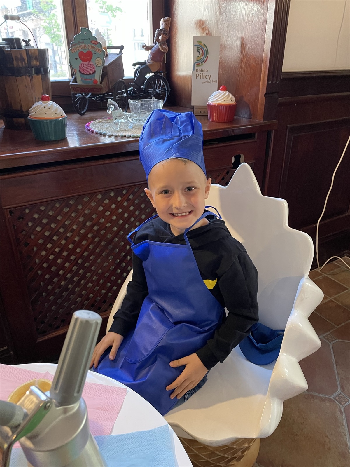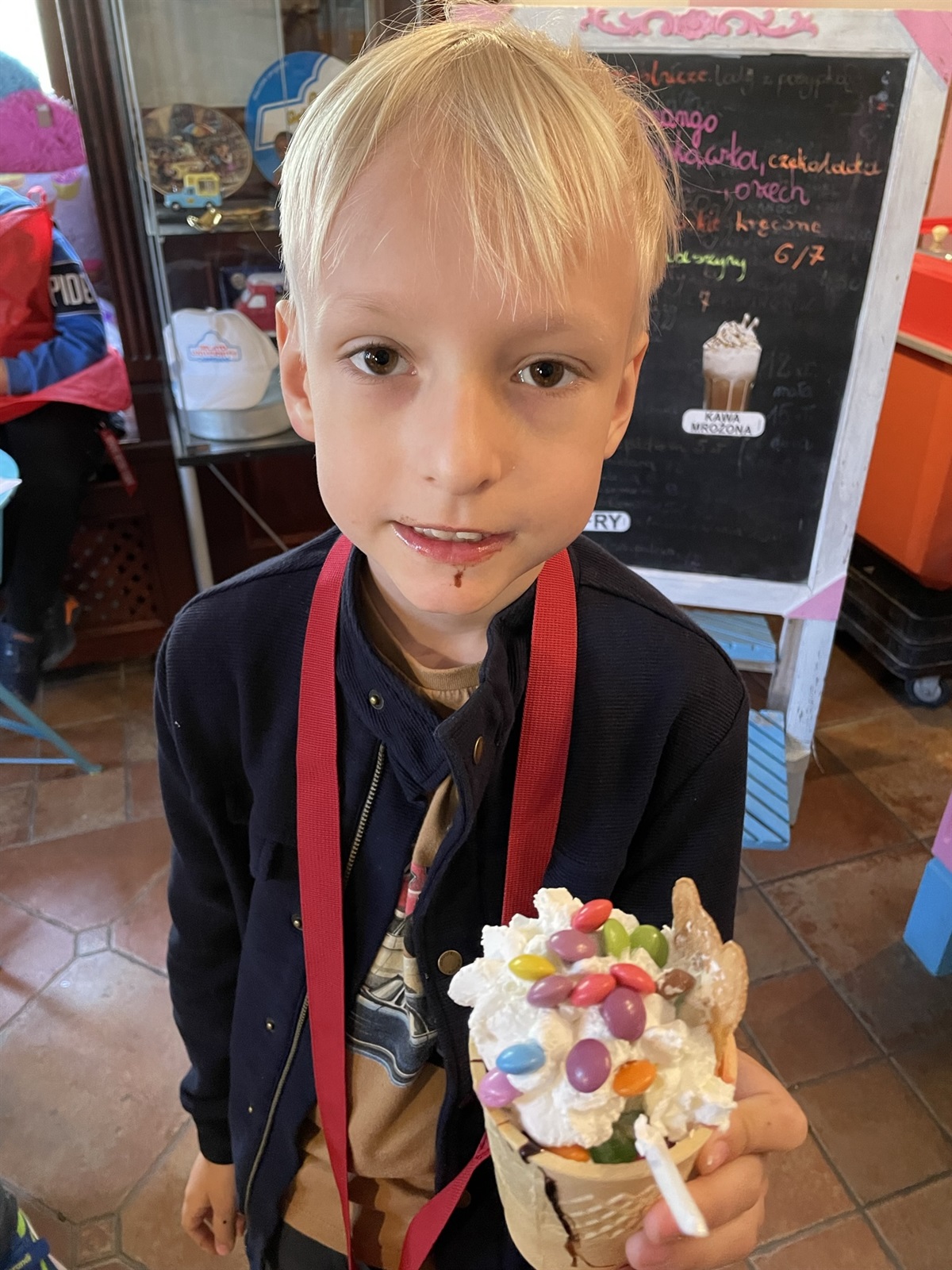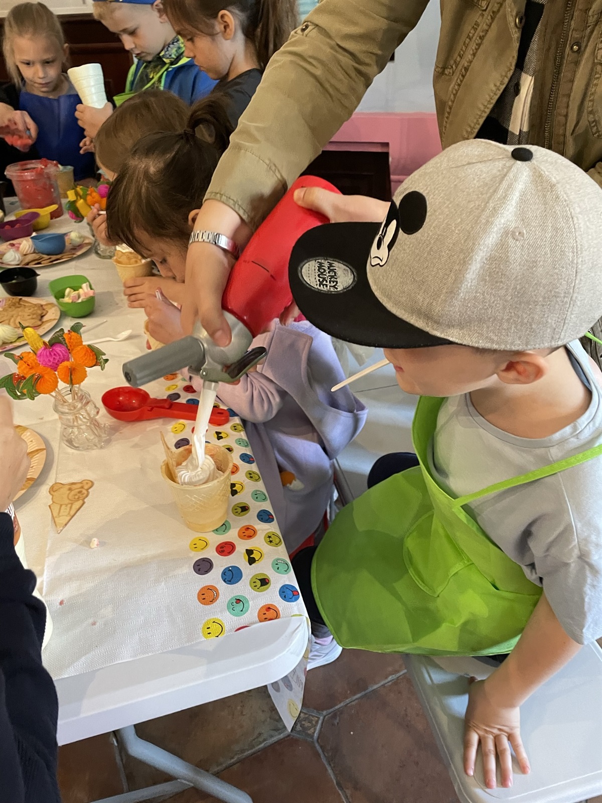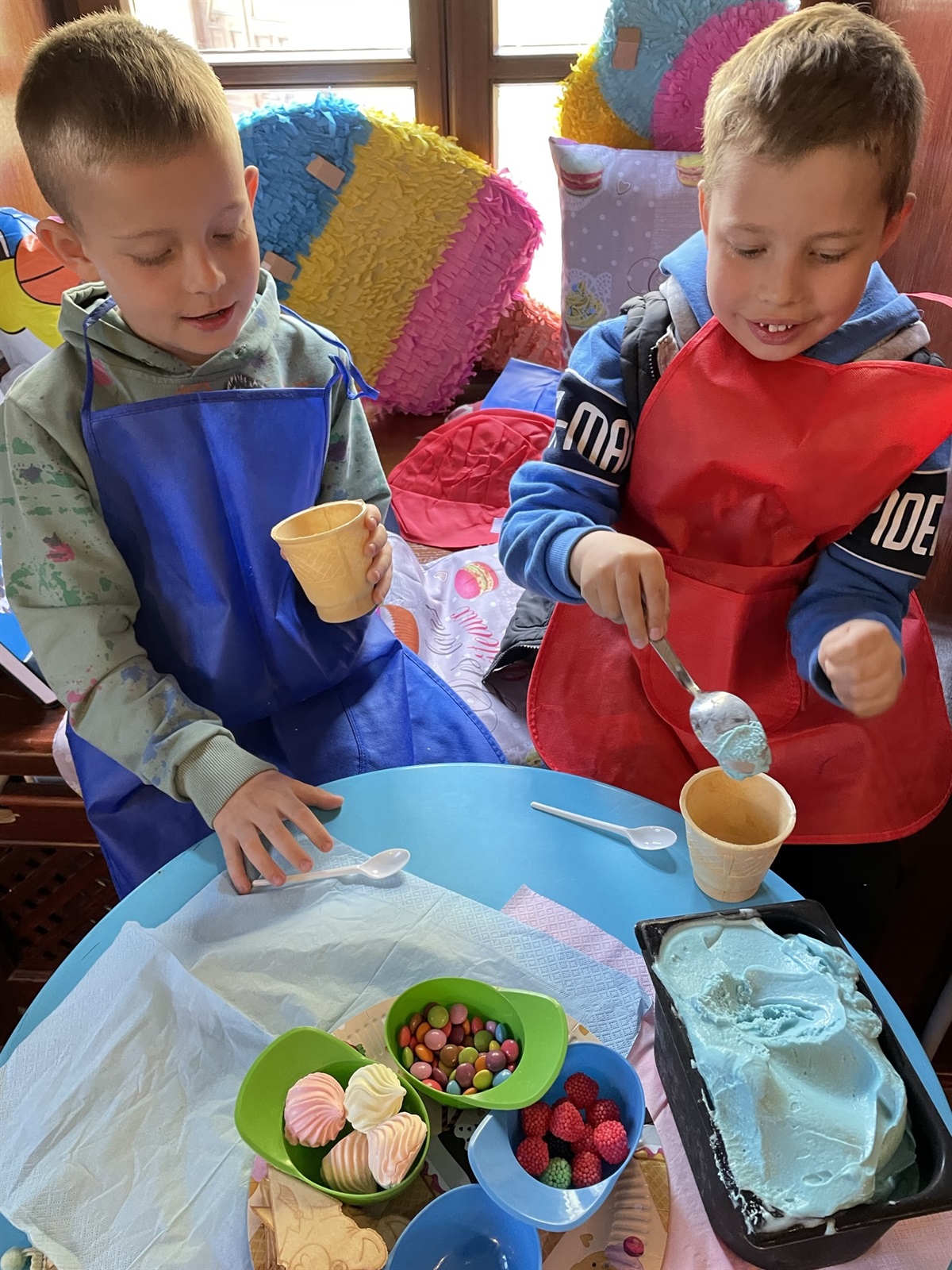 małych lodziarzy mógł do kruchego wafla włożyć kolorową gałkę lodowej masy,