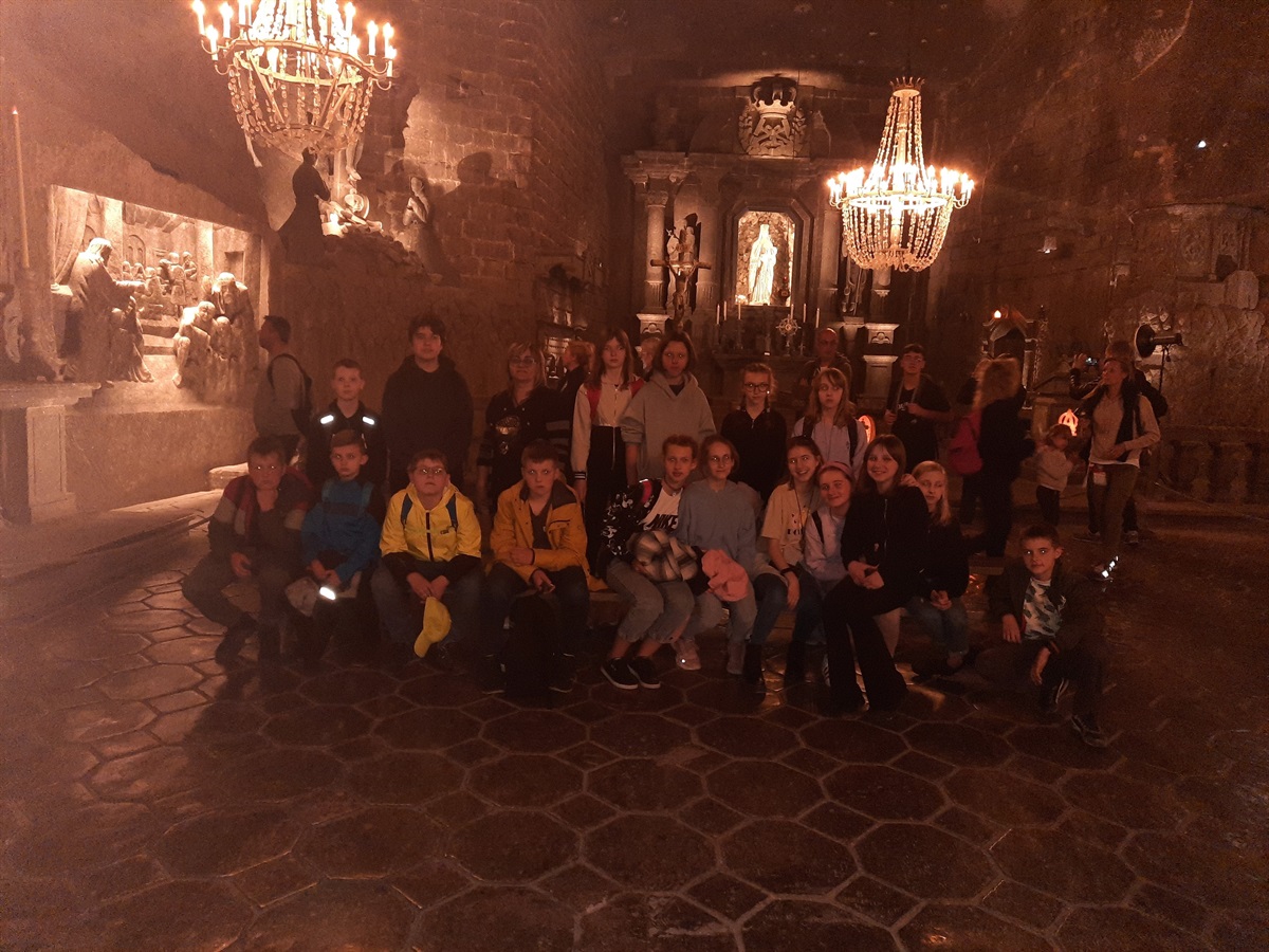 w której mieli okazję podziwiać tajemnice ukryte głęboko pod ziemią. Były to niespotykane na powierzchni krajobrazy: solankowe jeziora i przepiękne podziemne komory, w tym niepowtarzalna Kaplica św. Kingi. Poznali dawne narzędzia i maszyny górnicze oraz stosowane w przeszłości metody wydobycia i transportu soli. W drugim dniu wyjazdu uczniowie zwiedzali multimedialne Muzeum Podziemia Rynku w Sukiennicach, a następnie wspólnie