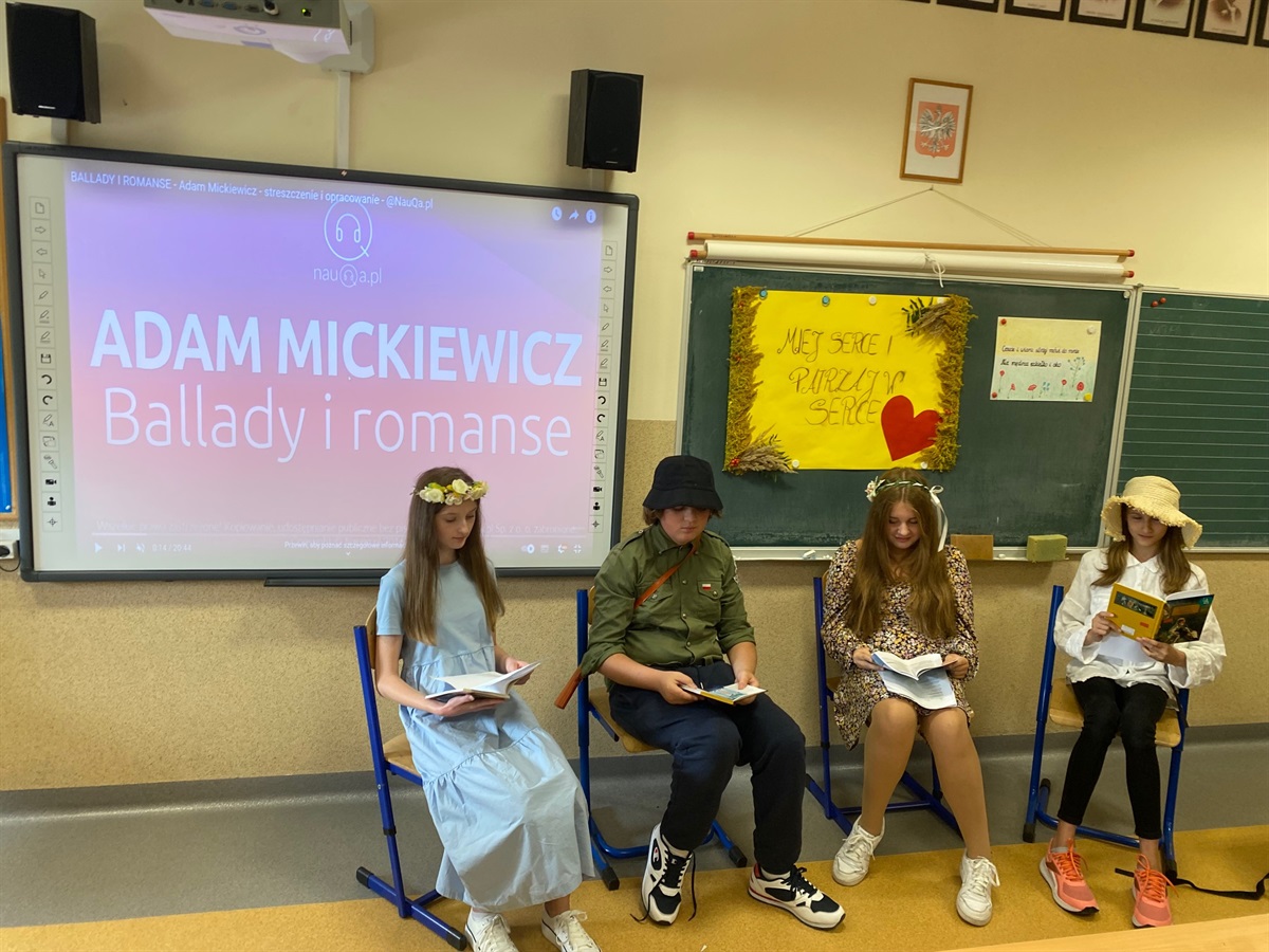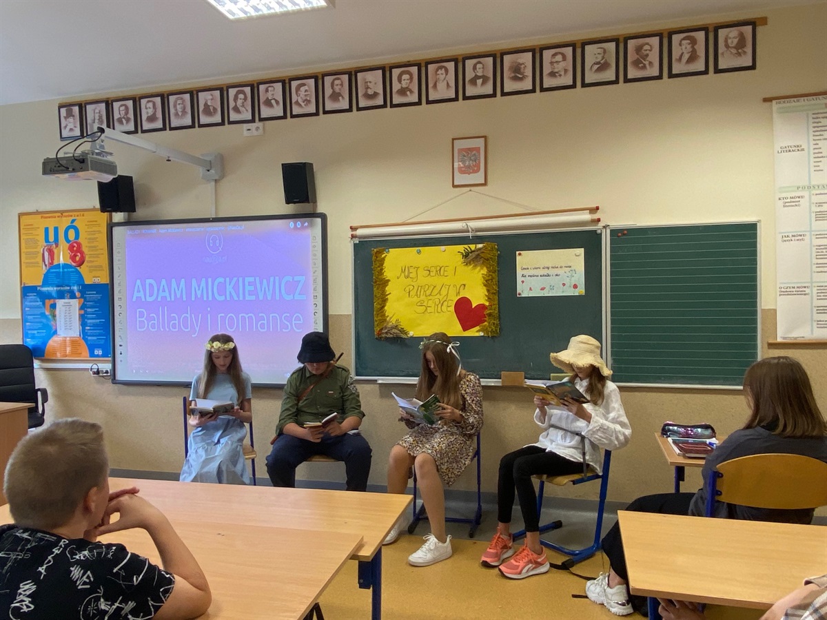 Po krótkim wstępie przygotowanym przez panią Monikę Raś, przybliżającym słuchaczom postać najznamienitszego wieszcza polskiego i historię powstawania kolejnych jego dzieł, młodzież odczytywała ballady „Świtezianka” i „Lilije”. Po tej części nastąpiło szczegółowe omówienie treści i podsumowanie.