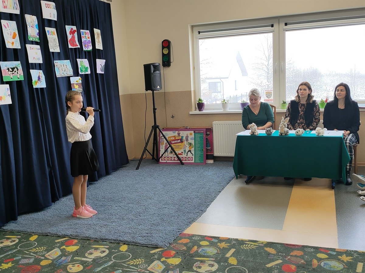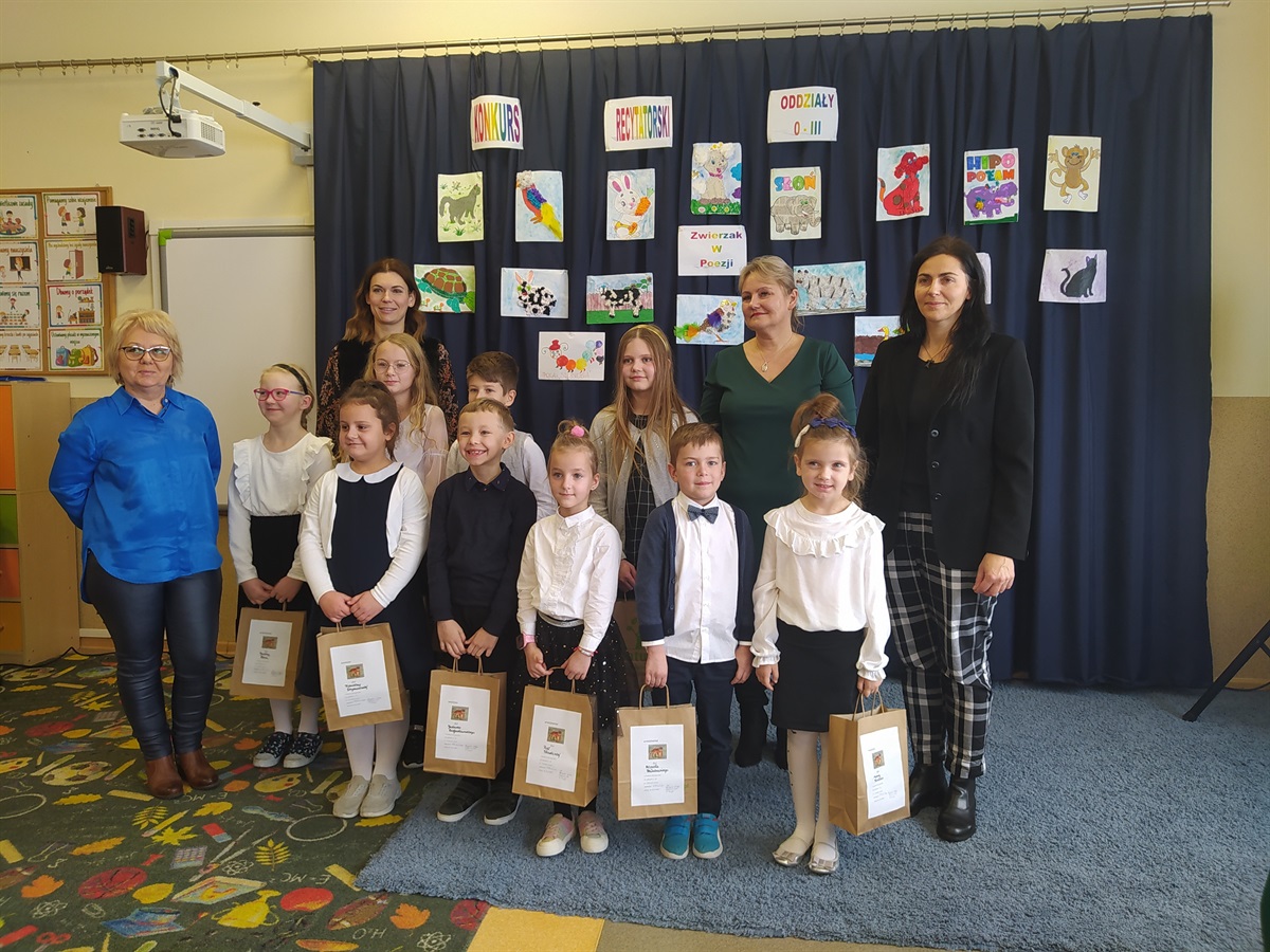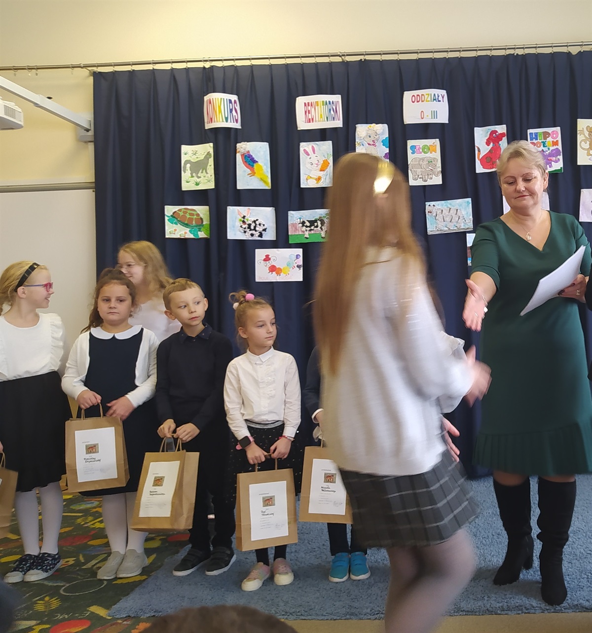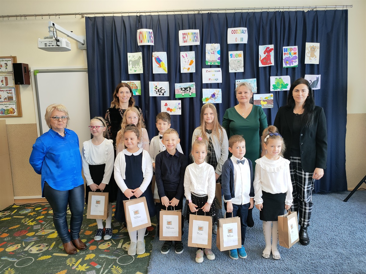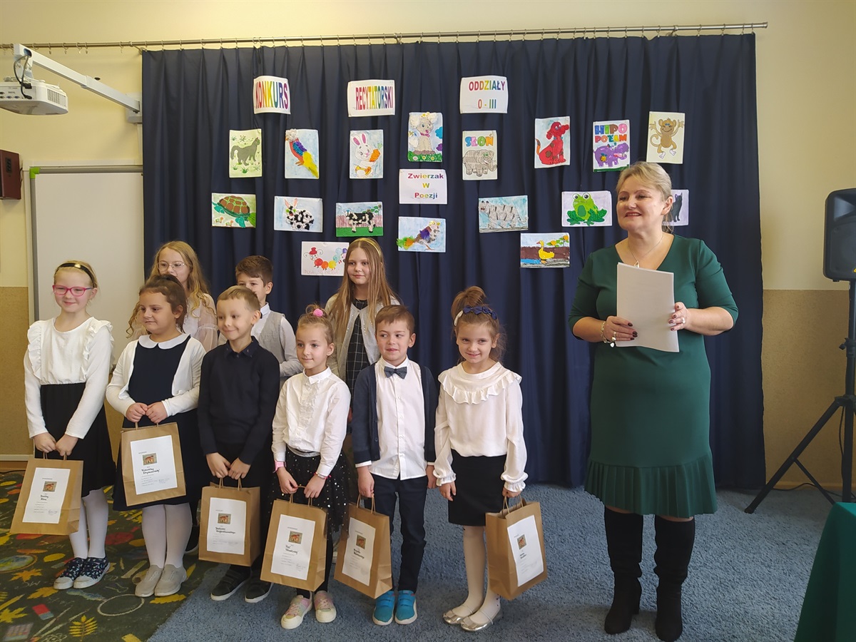 W dniu 25.11.2022 r. w naszej szkole odbył się konkurs recytatorski pt. "Zwierzak w poezji" dla uczniów z oddziałów I - III i oddziału przedszkolnego. Wzięło w nim udział 23 uczniów. Jury reprezentowały panie: dyrektor szkoły - Bożena Nowak - Justyna, Monika Baryła i Karolina Ludwiczak, która przygotowała także oprawę muzyczną. Po wystąpieniu wszystkich uczestników panie udały się na naradę i wybrały zwycięzców konkursu. I tak nagrody otrzymali uczniowie: Iga Zielińska, Natalia Mordaka, Jan Witkowski