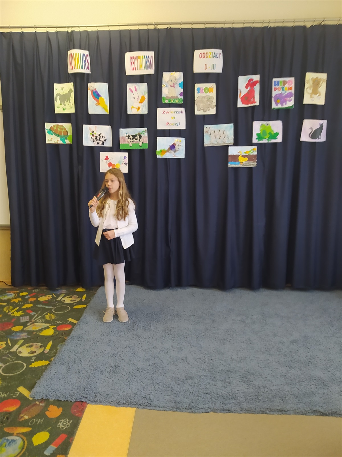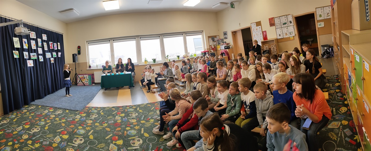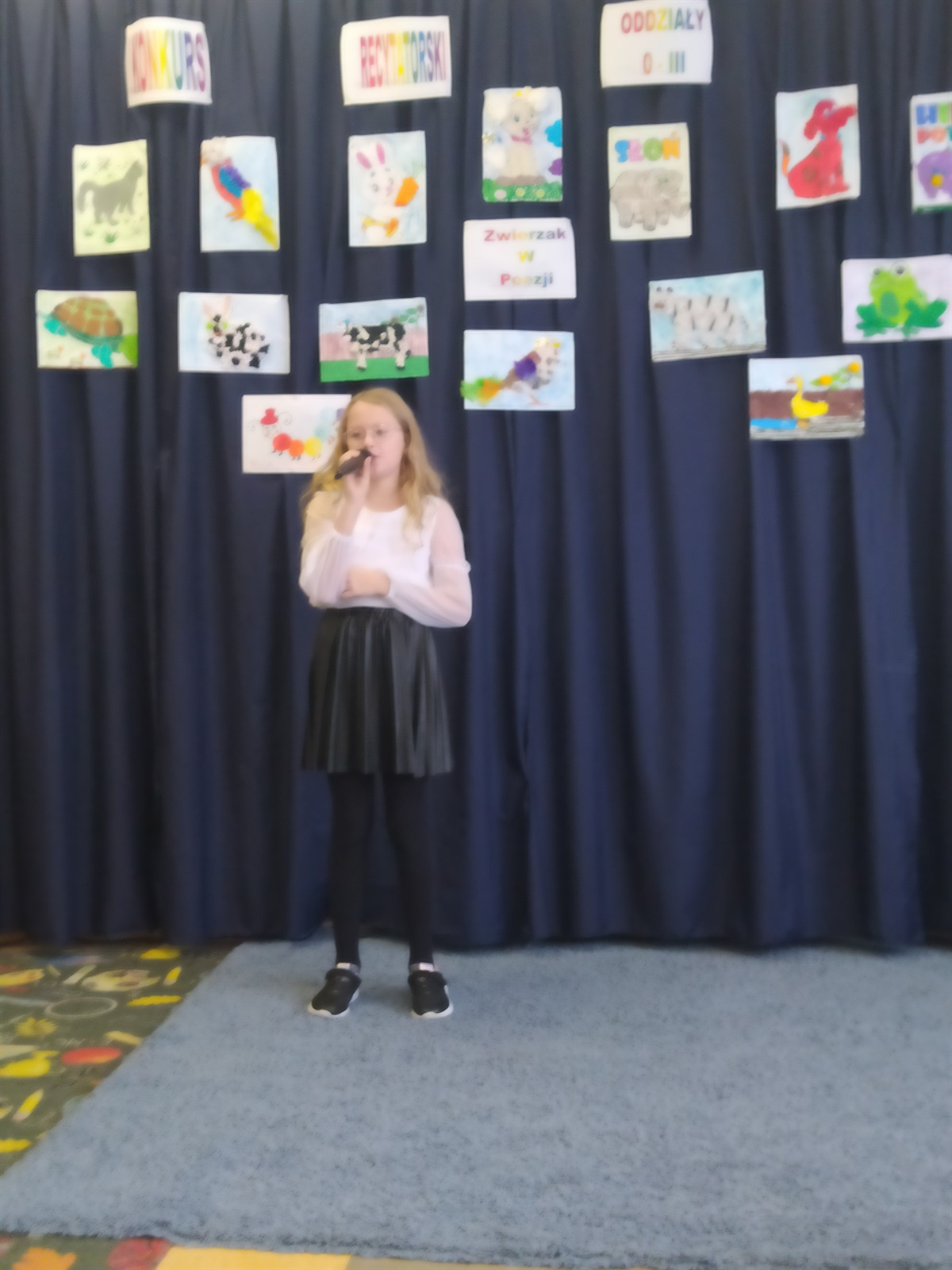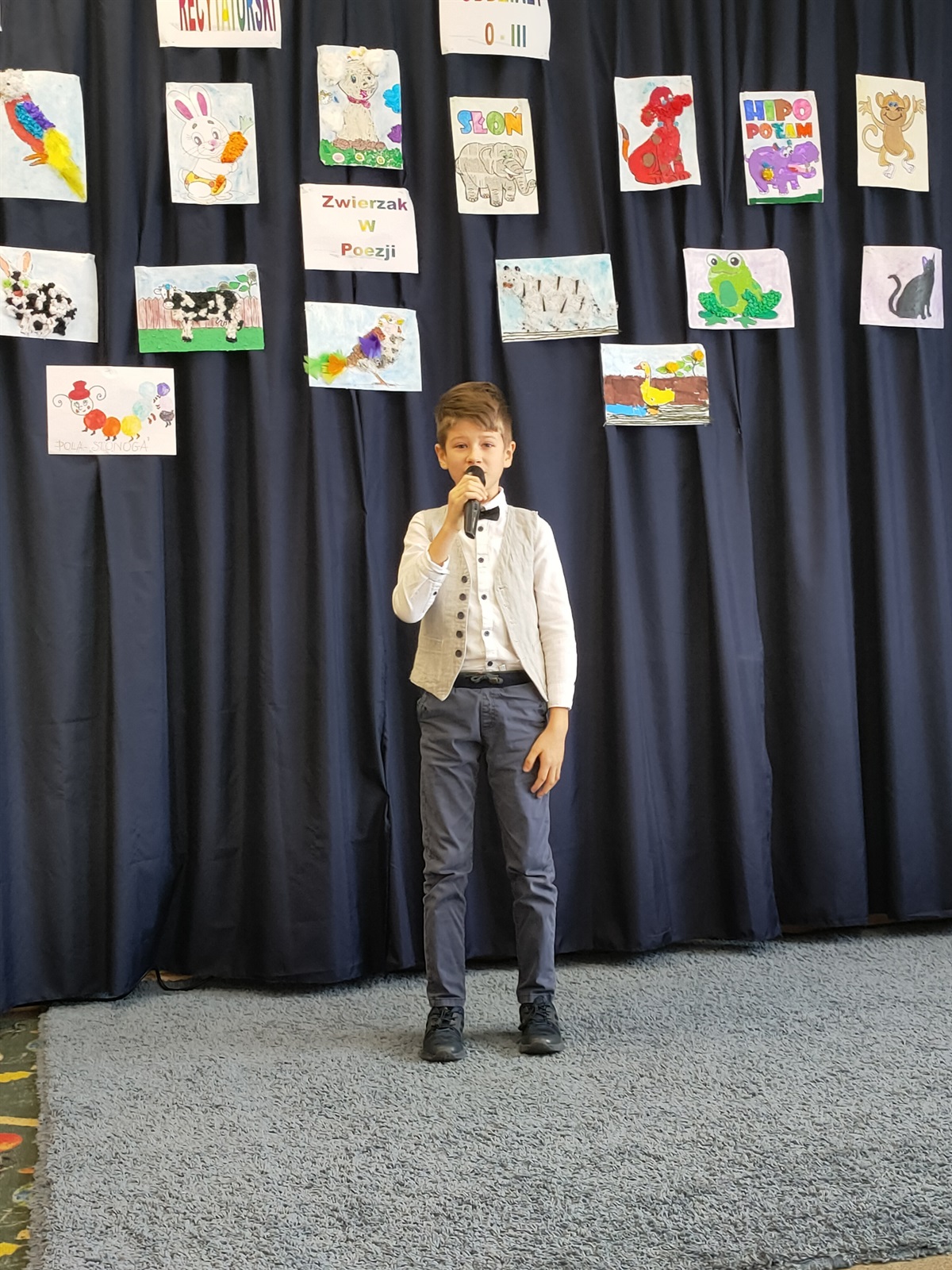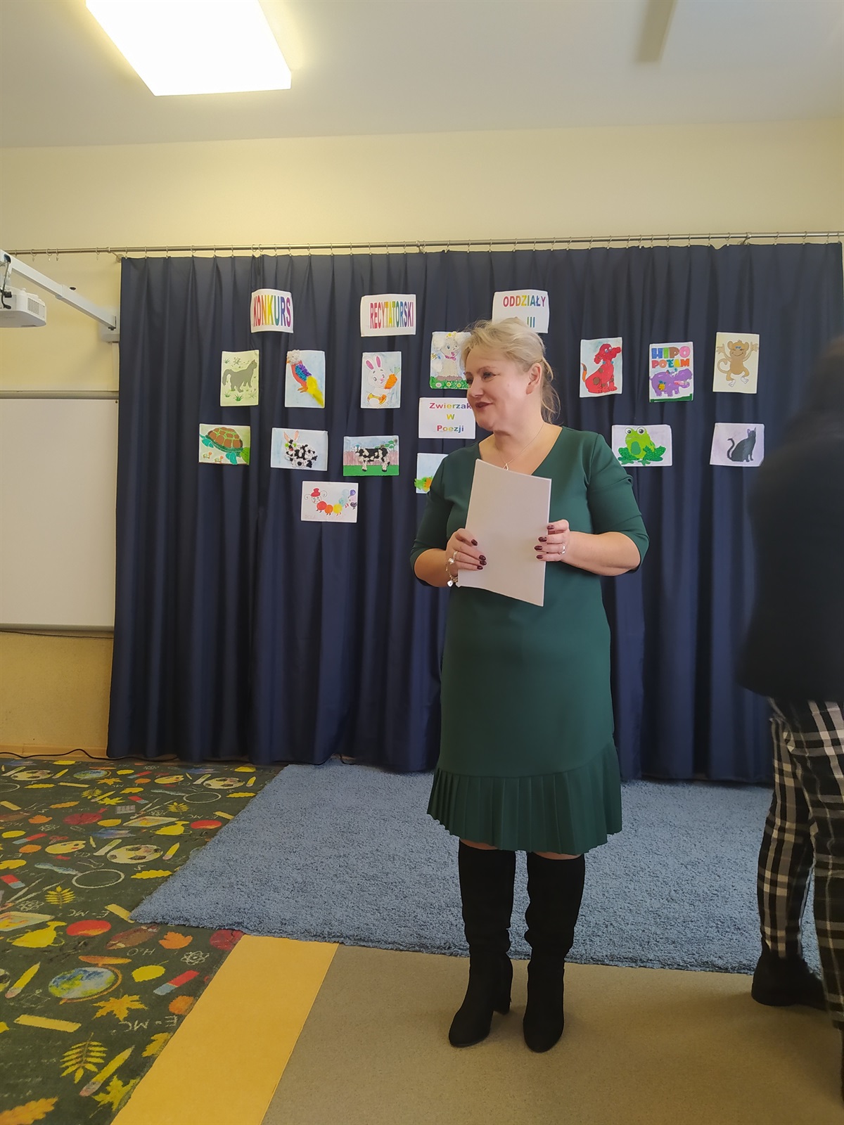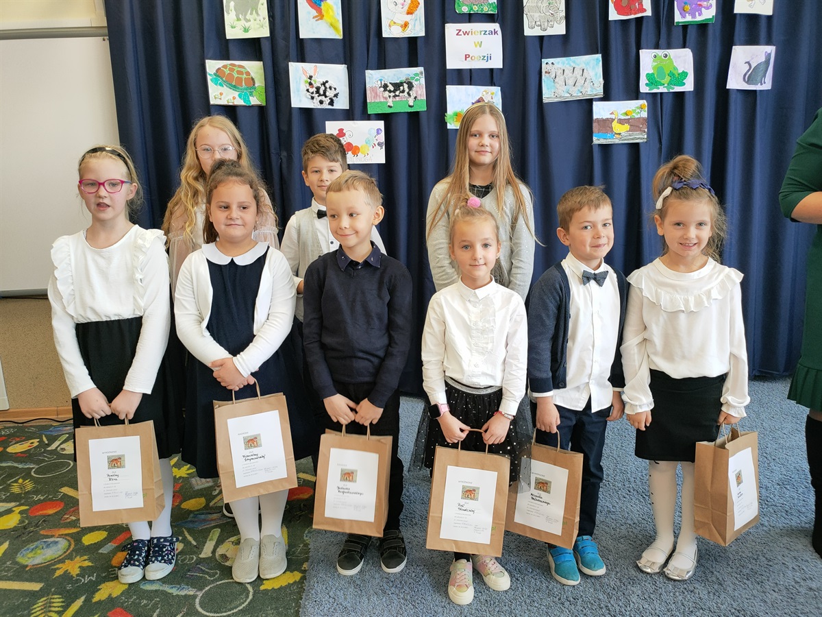W dniu 25.11.2022 r. w naszej szkole odbył się konkurs recytatorski pt. "Zwierzak w poezji" dla uczniów z oddziałów I - III i oddziału przedszkolnego. Wzięło w nim udział 23 uczniów. Jury reprezentowały panie: dyrektor szkoły - Bożena Nowak - Justyna, Monika Baryła i Karolina Ludwiczak, która przygotowała także oprawę muzyczną. Po wystąpieniu wszystkich uczestników panie udały się na naradę i wybrały zwycięzców konkursu. I tak nagrody otrzymali uczniowie: Iga Zielińska, Natalia Mordaka, Jan Witkowski