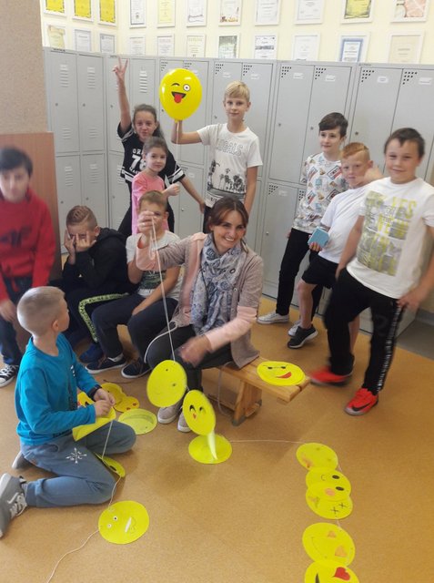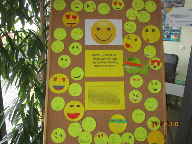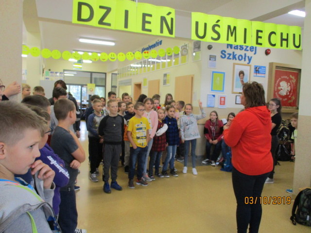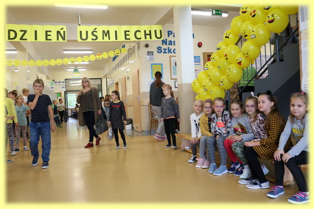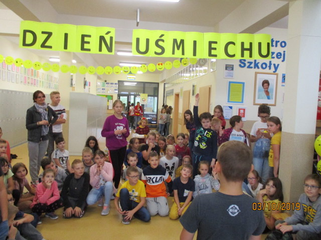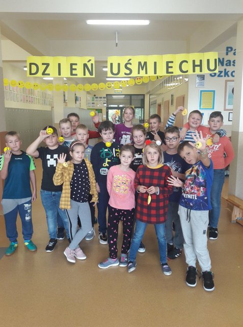 4 października 2019 r. w naszej szkole obchodzono Dzień Uśmiechu. To radosne święto obchodzone jest od 1999 r. Pomysłodawcą przedsięwzięcia jest Harvey Ball – autor znanego na całym świecie symbolu żółtej, uśmiechniętej buzi, tzw. smile face. Symbol ten reprezentować ma dokładnie to, co na co dzień chcemy widzieć u innych ludzi – bezinteresowny uśmiech i radość życia. Bo jak się okazuje, znane od wieków powiedzenie „śmiech to zdrowie”, to nie tylko metafora. W ciągu ostatnich dekad rozwinęła się nawet nowa dziedzina badań nad tym zjawiskiem, zwana gelontologią. Dzięki niej potwierdzono naukowo, że śmiech rozluźnia i odstresowuje, przyczyniając się do wzmocnienia układu odpornościowego organizmu.Ponadto stymuluje wydzielanie endorfin, czyli hormonów szczęścia. W naszej szkole wszyscy uczniowie, którzy tego dnia przyszli ubrani na żółto, otrzymywali naklejki – uśmiechnięte buźki, natomiast ci, którzy opowiedzieli najśmieszniejszy dowcip, otrzymywali nagrody. Organizatorkami przedsięwzięcia były panie: Anetta Banaszczyk i Izabela Dybała.