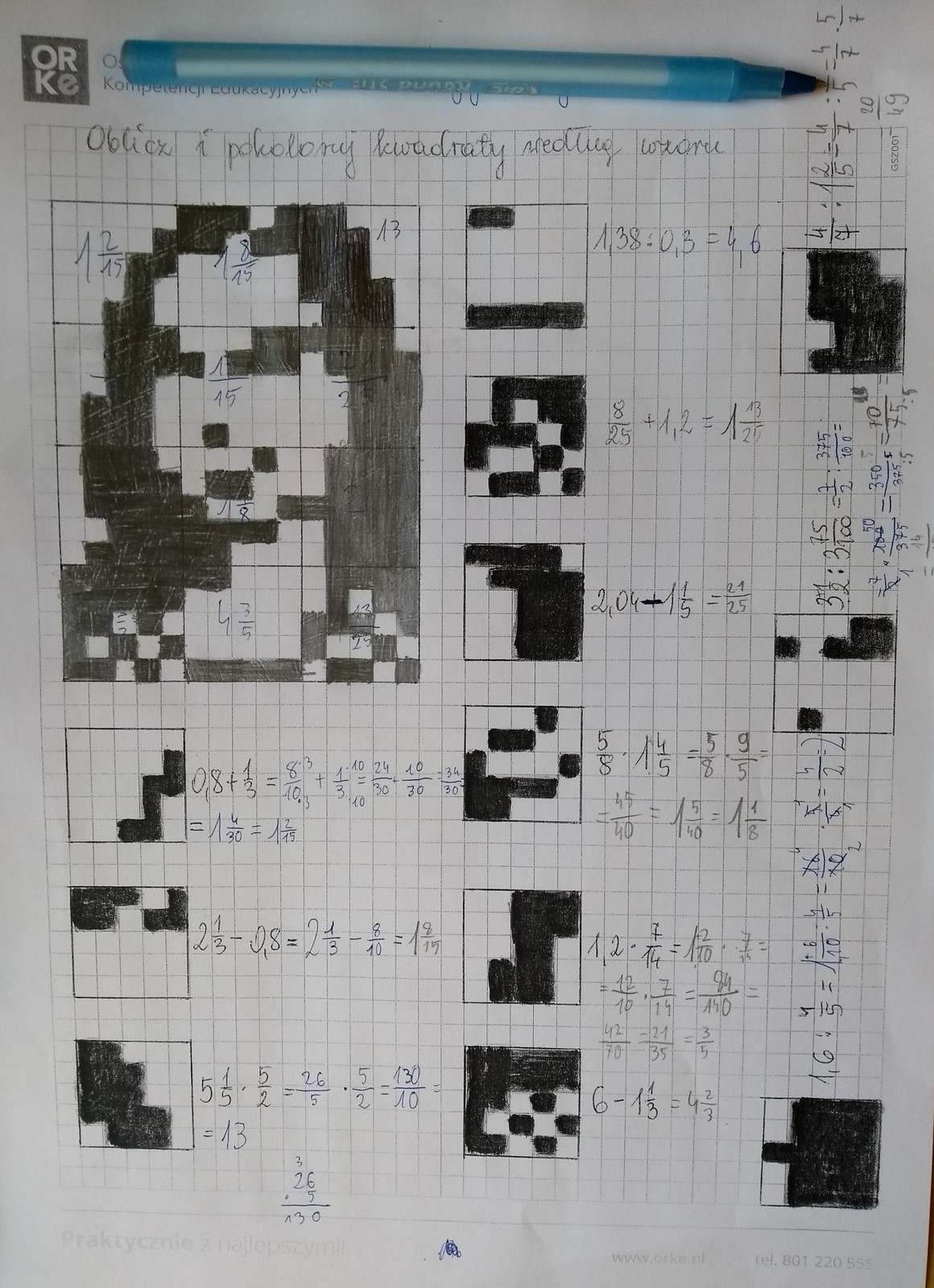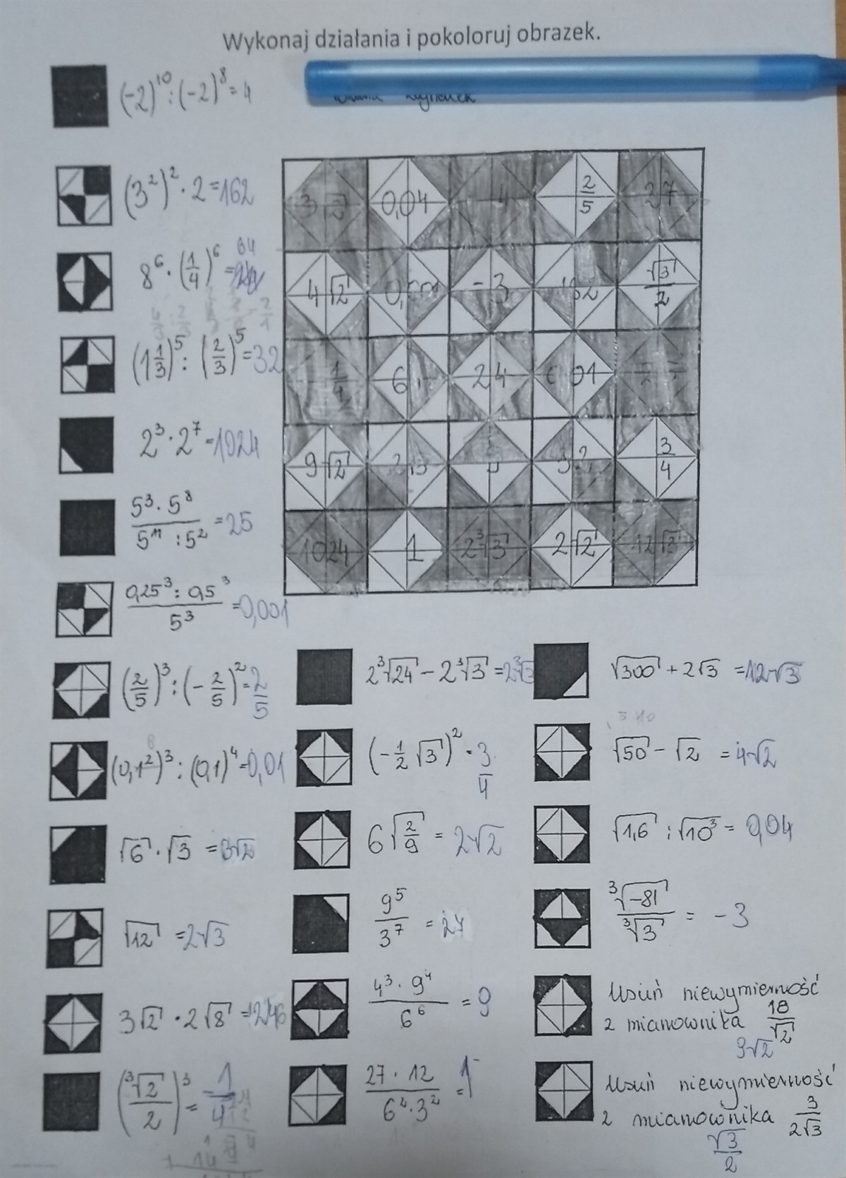 W ramach Tygodnia Kodowania uczniowie klas VI - VIII odkodowywali obrazki rozwiązując działania na ułamkach, potęgach i pierwiastkach. Akcję przeprowadziła p. Magdalena Pryczak