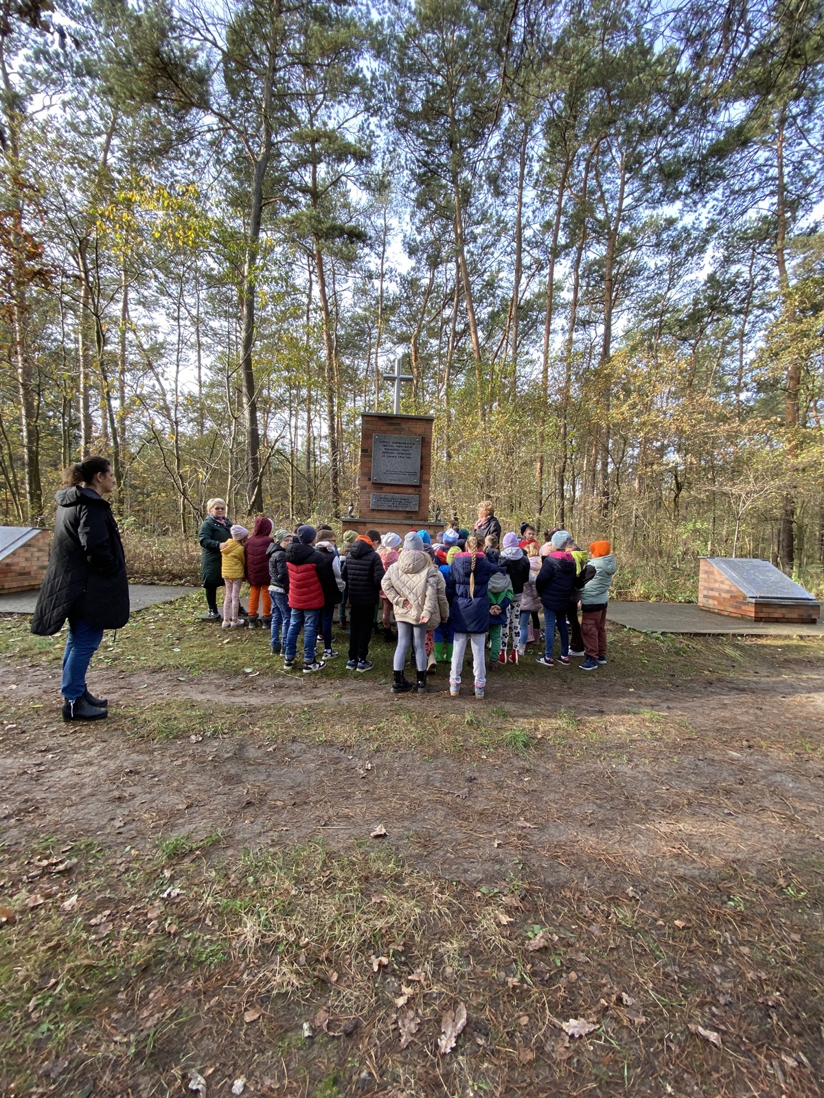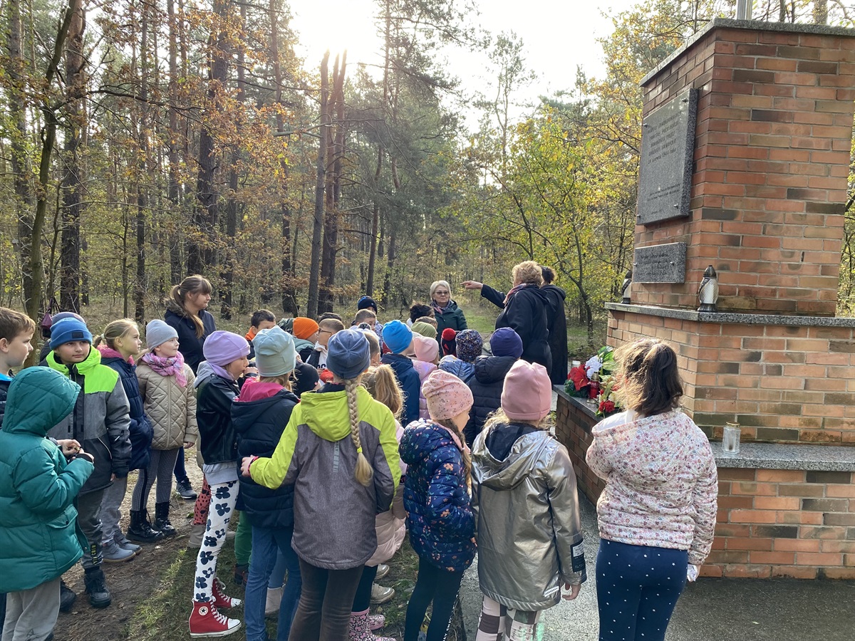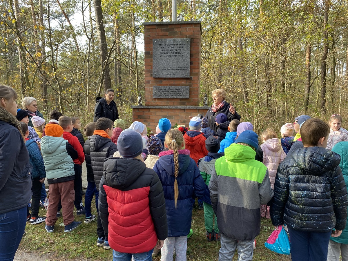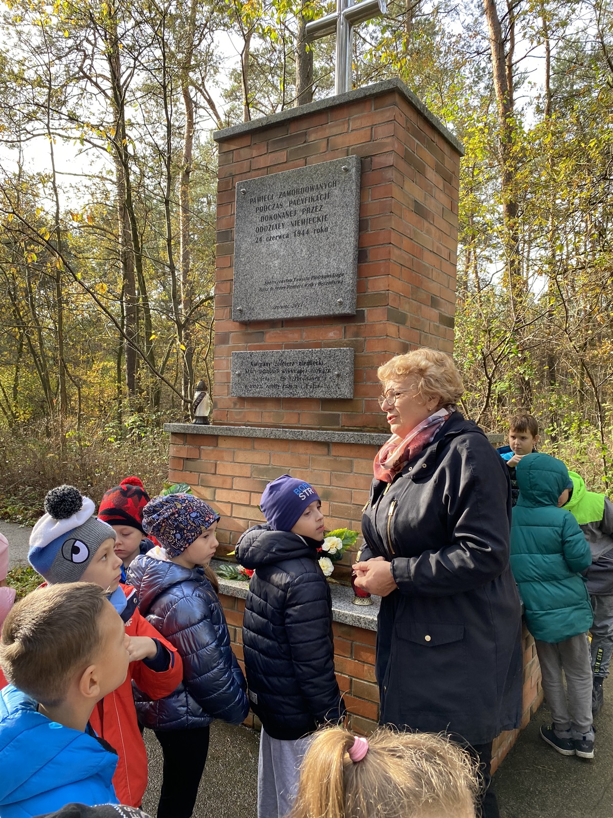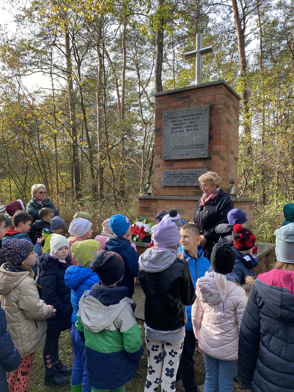 Tam znajduje się pomnik Polaków, którzy zostali zastrzeleni przez nazistowskich okupantów. W związku z tym, że Szkoła  Podstawowa im. Margarethy Kamprad od wielu lat dba o tą mogiłę, to naszym obowiązkiem jest kontynuacja tego zadania. Uczniowie naszej szkoły wraz z nauczycielami uporządkowali mogiłę, położyli wiązankę i zapalili znicze, oddając w ten sposób hołd Polakom, którzy rok przed zakończeniem II wojny światowej oddali swoje  życie za wolność  ojczyzny – Polski.