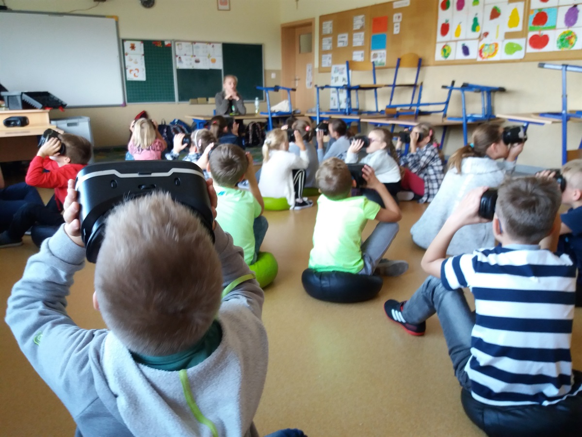 Dnia 15.10. 2019 r. w naszej szkole odbyły się innowacyjne zajęcia edukacyjne dla oddziałów O - III.Każda lekcja Akademii VR dla jednego oddziału trwała 45 minut. Uczniowie korzystali z materiałów edukacyjnych na sprzętach wirtualnej rzeczywistości(VR) równocześnie bawiąc się i ucząc. Zajęcia prowadził doświadczony przewodnik "oprowadzając" uczniów po wirtualnej rzeczywistości. Narracja była dostosowana do grupy wiekowej. Tematem zajęć dla  uczniów z oddziałów O i I to "Oceany", zaś dla uczniów z oddziałów II i III "Atmosfera". Lekcje Akademii VR to duża porcja wiedzy przekazywanej w innowacyjnej i bardzo atrakcyjnej dla dzieci formie. Podczas zajęć uczniowie znaleźli się w "centrum wydarzeń", otoczeni realistycznymi obrazami VR, co dostarczyło im wiele niezapomnianych wrażeń.
