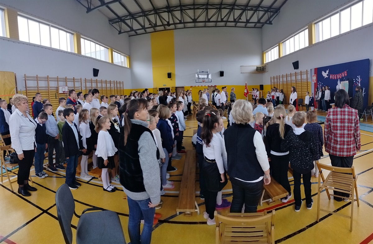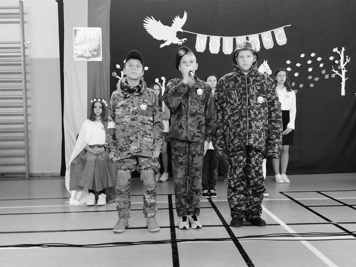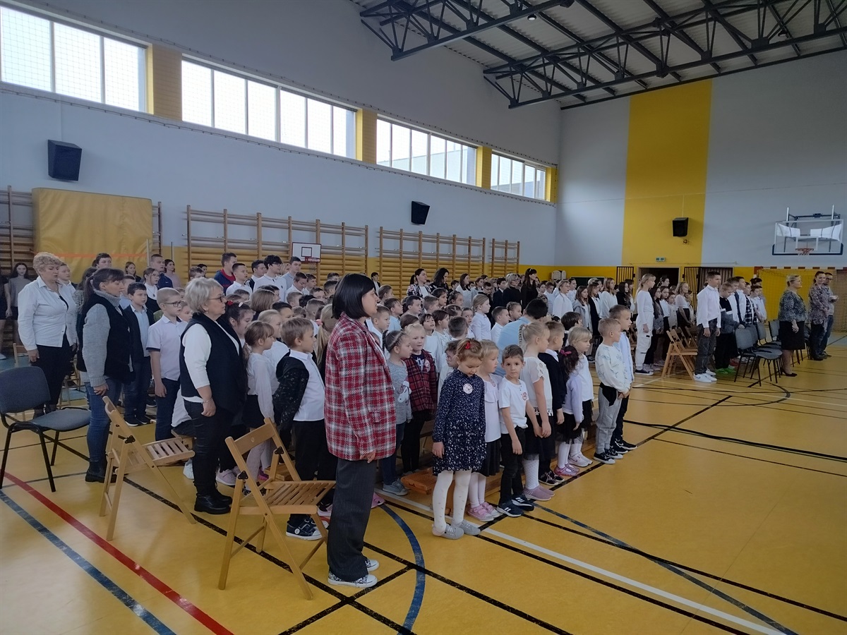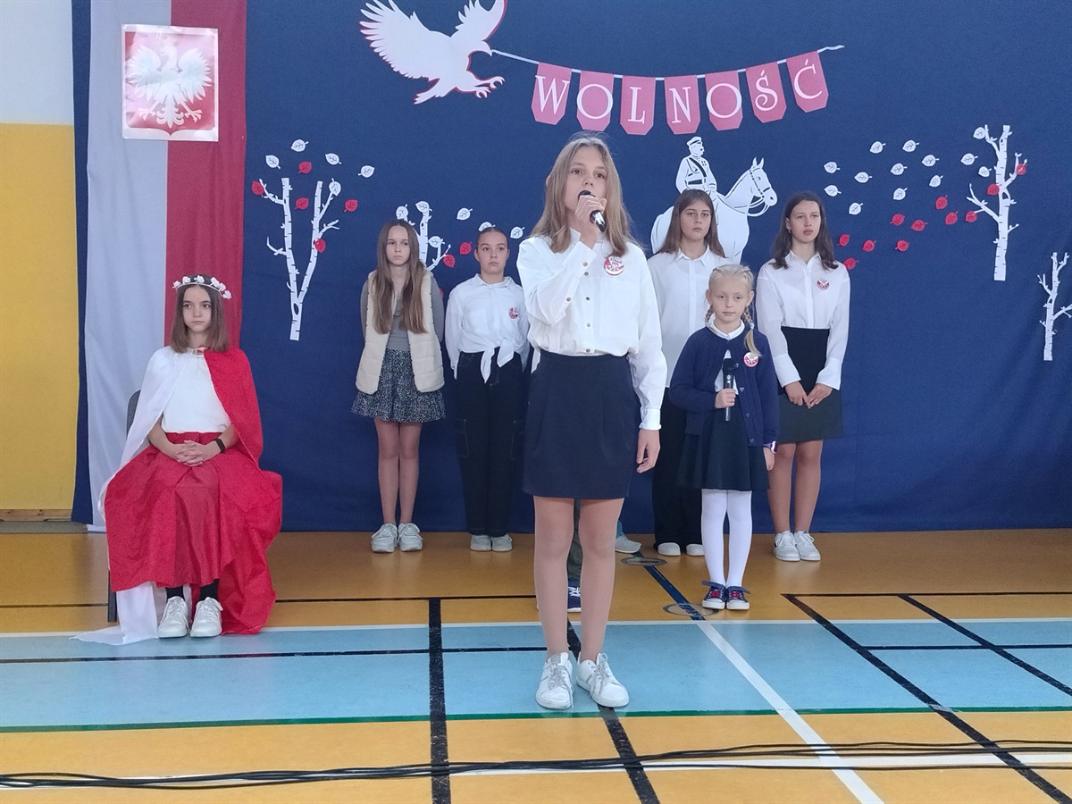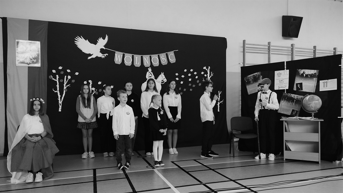 W tym roku 11 listopada przypadł w sobotę i tego dnia poczet sztandarowy wraz z opiekunem uczestniczył w gminnych obchodach Święta Niepodległości, natomiast w czwartek 16 listopada odbyła się w naszej szkole uroczysta akademia z okazji 105 rocznicy odzyskania przez Polskę niepodległości. Uczniowie z klasy V, VI i VII przygotowali pod okiem nauczycieli krótką lekcję historii, w swojej inscenizacji przedstawiając drogę Polaków do odzyskania upragnionej wolności i przywrócenia ojczyzny na mapy świata. Patriotyczny charakter uroczystości podkreśliły: wymowna dekoracja, recytowane wiersze oraz pieśni w wykonaniu uczniów uczęszczających na koło wokalne.