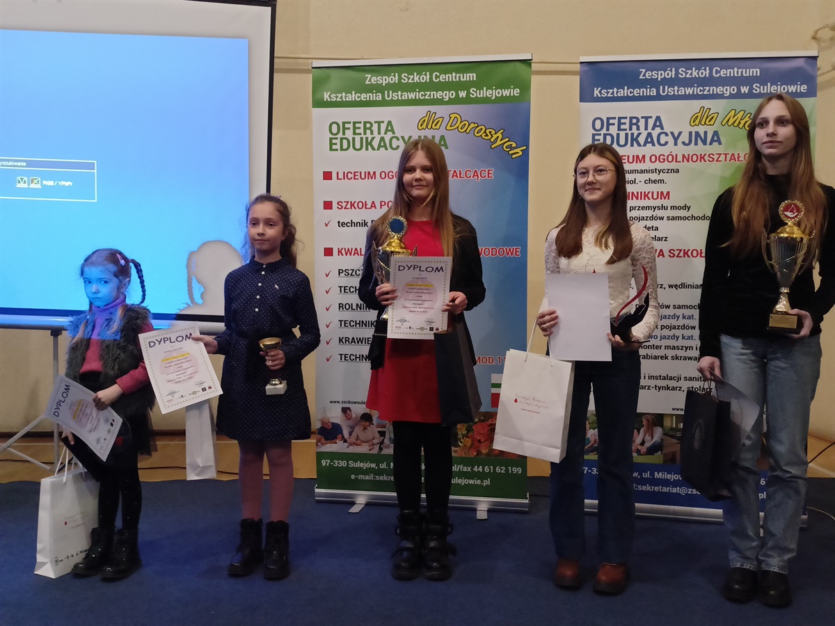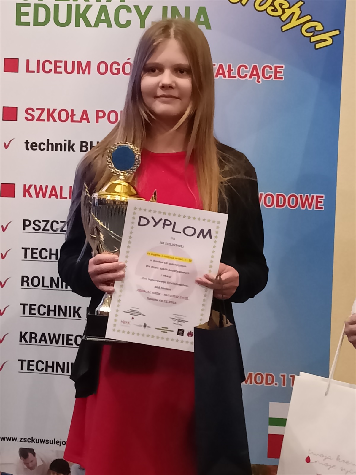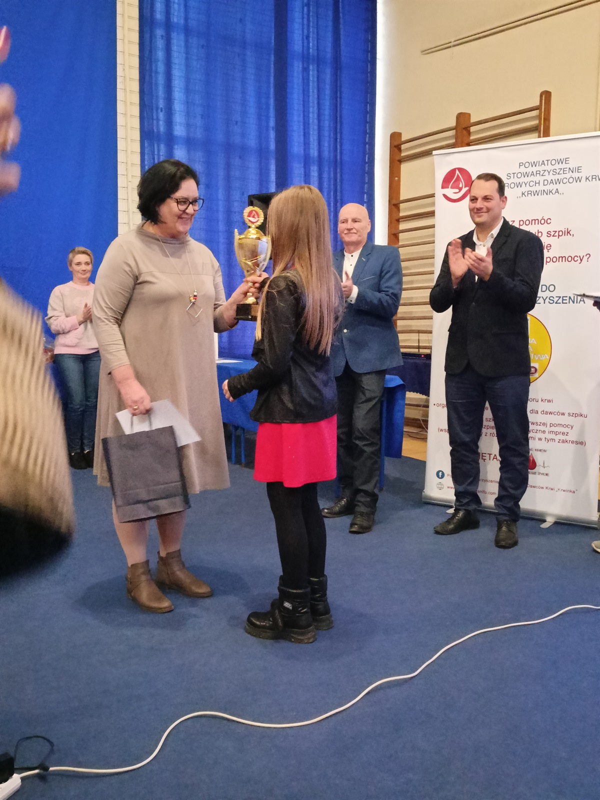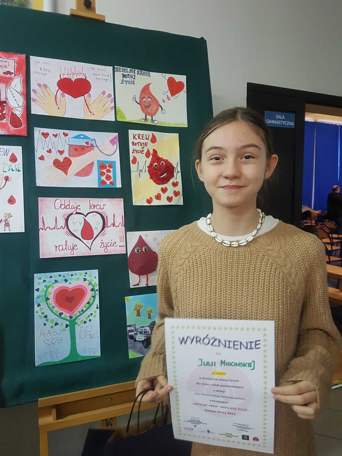 W sobotę 25 listopada 2023 r. w Zespole Szkół Centrum Kształcenia Ustawicznego w Sulejowie odbyła się gala konkursu plastycznego z okazji Dni Honorowego Krwiodastwa pn. „Oddając krew, ratujesz życie”. Celem konkursu było promowanie honorowego krwiodastwa wśród najmłodszych. Organizatorami konkursu byli Powiatowe Stowarzyszenie HDK – Krwinka i Zespół Szkół CKU w Sulejowie. Patronat nad konkursem objęli: Narodowe Centrum Krwi, Starosta piotrkowski Piotr Wojtysiak, Urząd Miasta i Gminy w Sulejowie oraz OSP w Sulejowie. Spośród nadesłanych prawie 200 prac z 18 szkół podstawowych z powiatu piotrkowskiego, komisja nagrodziła 43 uczestników, w tym 5 uczennic z klasy IV Szkoły Podstawowej im. Margarethy Kamprad w Jarostach. W konkursie I miejsce zdobyła Iga Zielińska, wyróżnienie Prezesa Powiatowego SHDK Krwinka, Roberta Szulca otrzymały: Martyna Dziubecka i Paulina Gliszczyńska, a wyróżnienia w kategorii klas I-IV otrzymały: Daria Dajcz i Julia Migowska. Gratulujemy zwyciężczyniom i życzymy dalszych sukcesów.