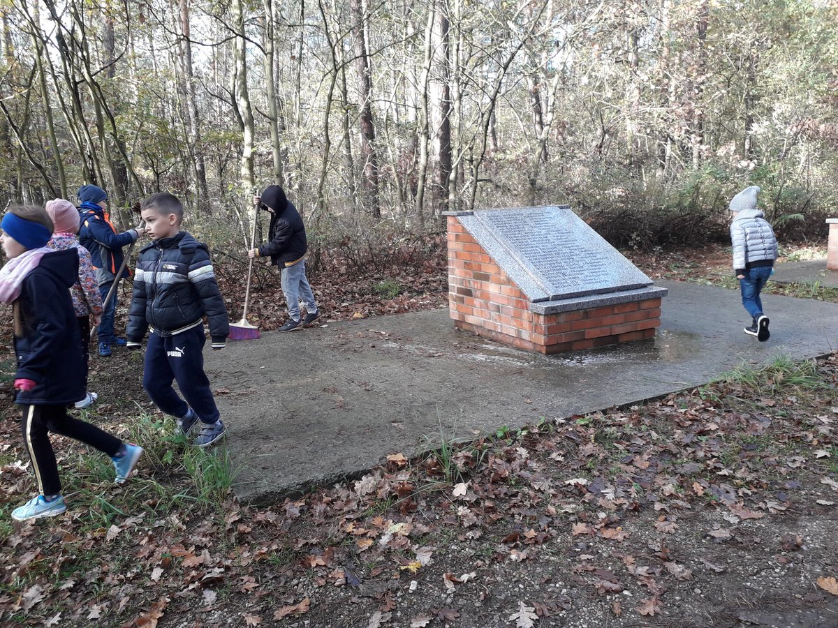 Takie wyróżnienie cieszy i zobowiązuje, dlatego i w tym roku uczniowie klas I i II pojechali posprzątać mogiłę. Zabrali szczotki, grabie, środki czystości i ogromny zapał do pracy. Każdy mógł się wykazać i zamieść liście, wytrzeć pomnik lub ustawić nowe znicze i kwiaty. Oczywiście był też czas na przypomnienie, co się stało pamiętnego dnia 24 czerwca 1944 roku i odczytanie nazwisk poległych. Minutą ciszy uczciliśmy pamięć zamordowanych mężczyzn. Będziemy tę tradycję podtrzymywać, bo tak należy.