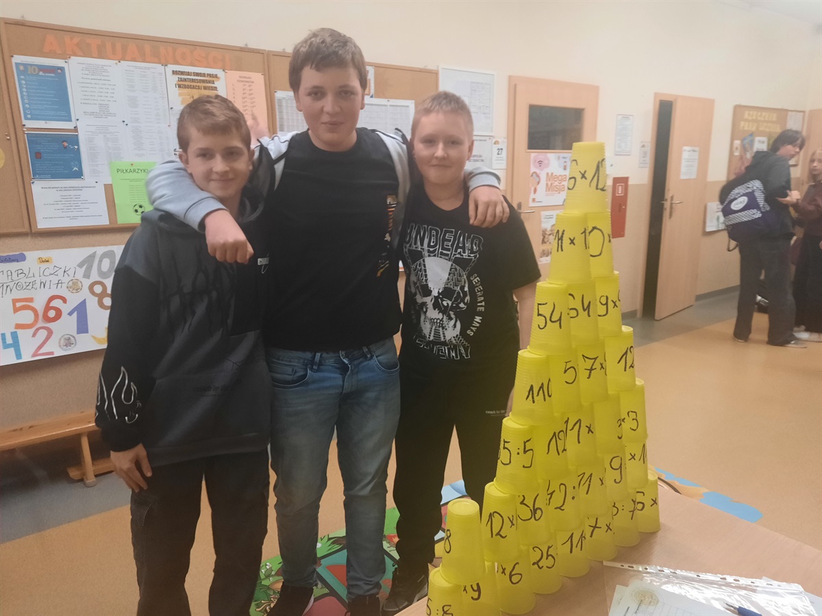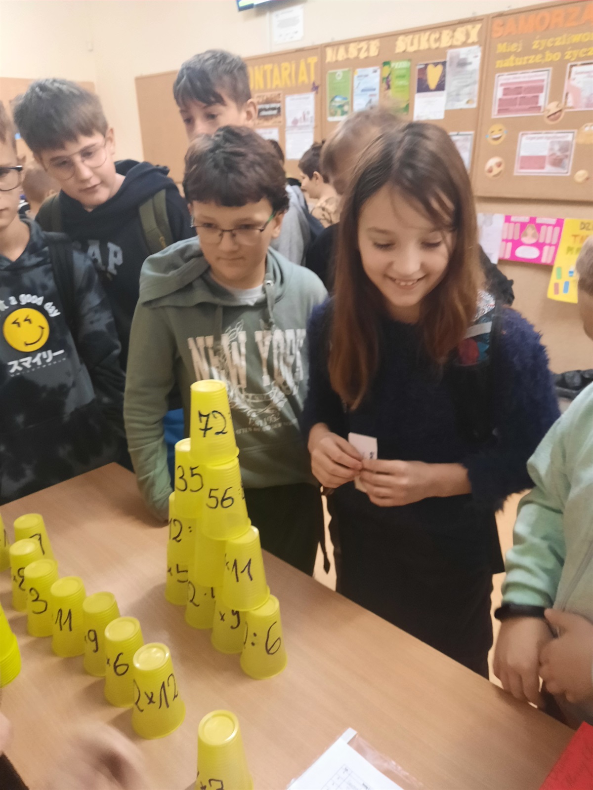 -    zabawę „Wieża”, podczas której 2- osobowe drużyny miały za zadanie ułożyć jak najwyższą wieżę składającą się z plastikowych kubeczków. Na każdym kubku było zapisane działanie. Jeżeli dana osoba podała poprawny wynik iloczynu, dokładała kubek do wspólnej wieży. Natomiast jeżeli uczestnik zabawy podał zły wynik, to grupa traciła całą wieżę. Podczas tej zabawy uczniowie byli bardzo zaangażowani, a na ich twarzach było widać skupienie.