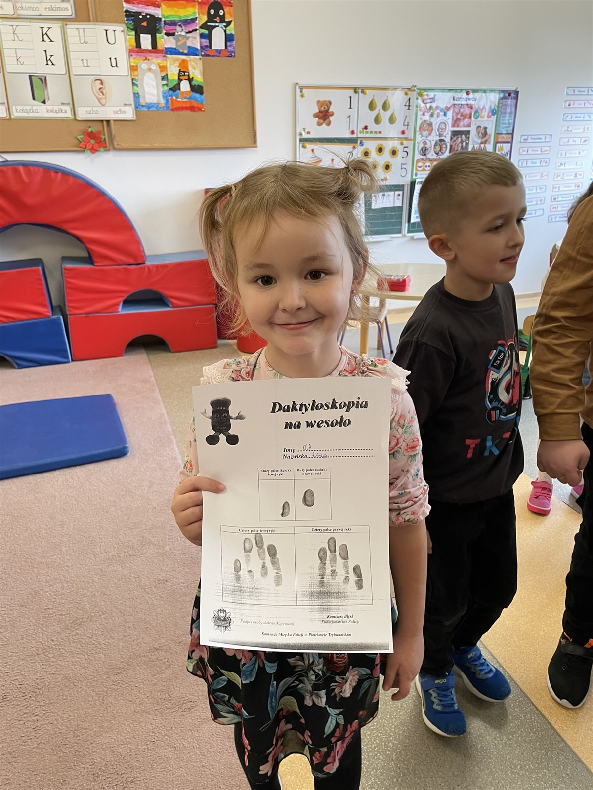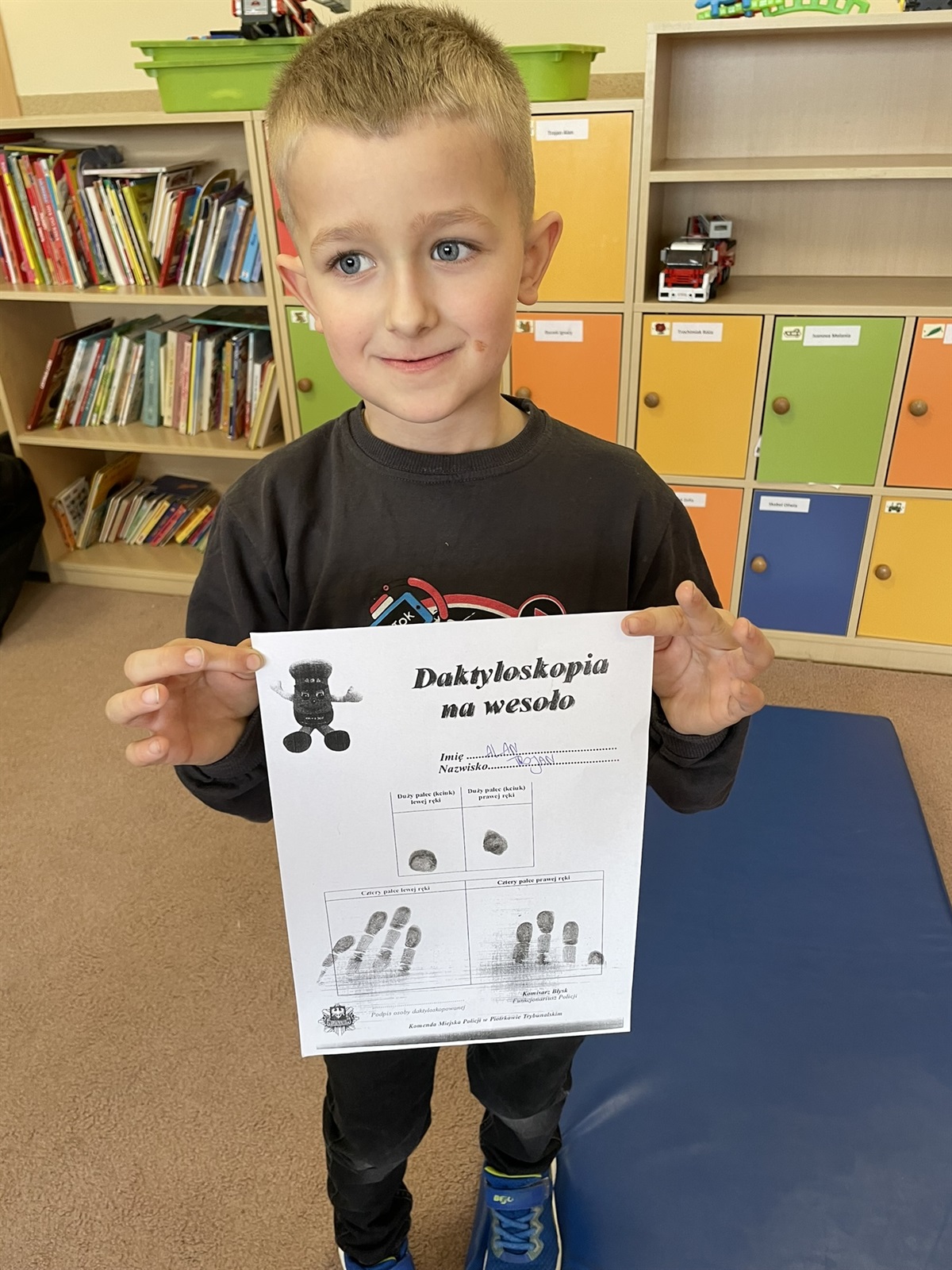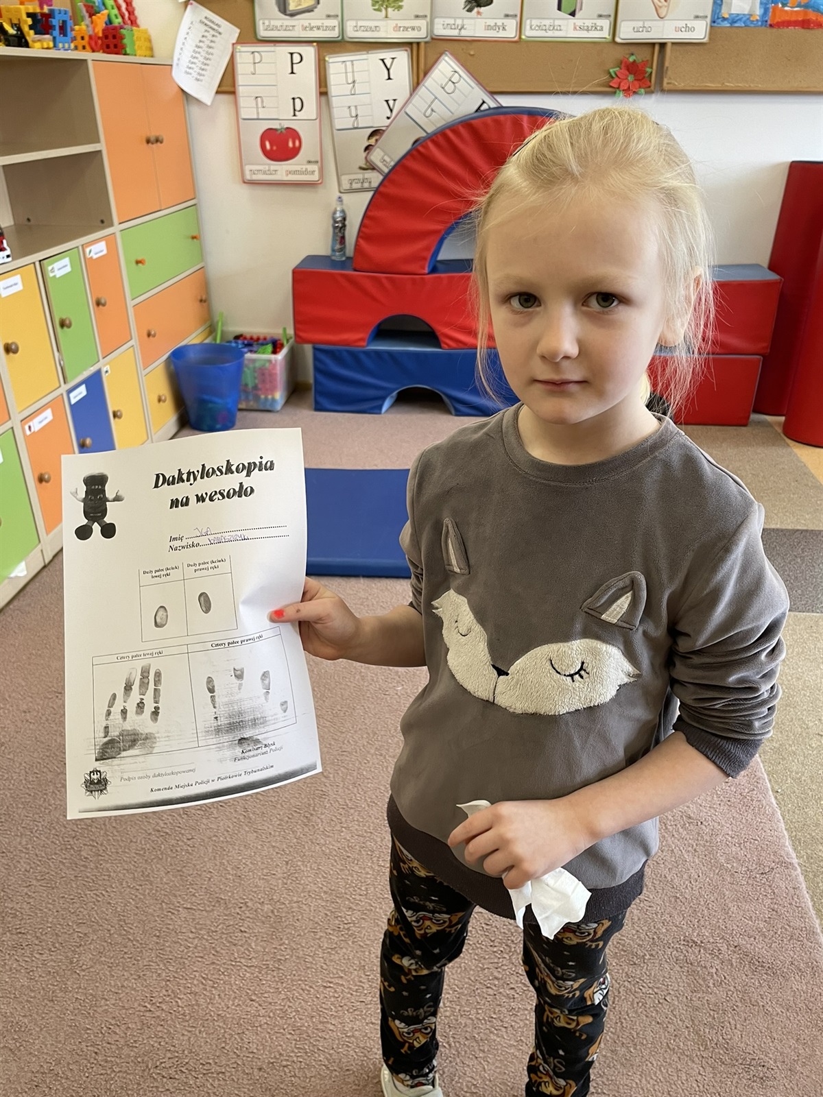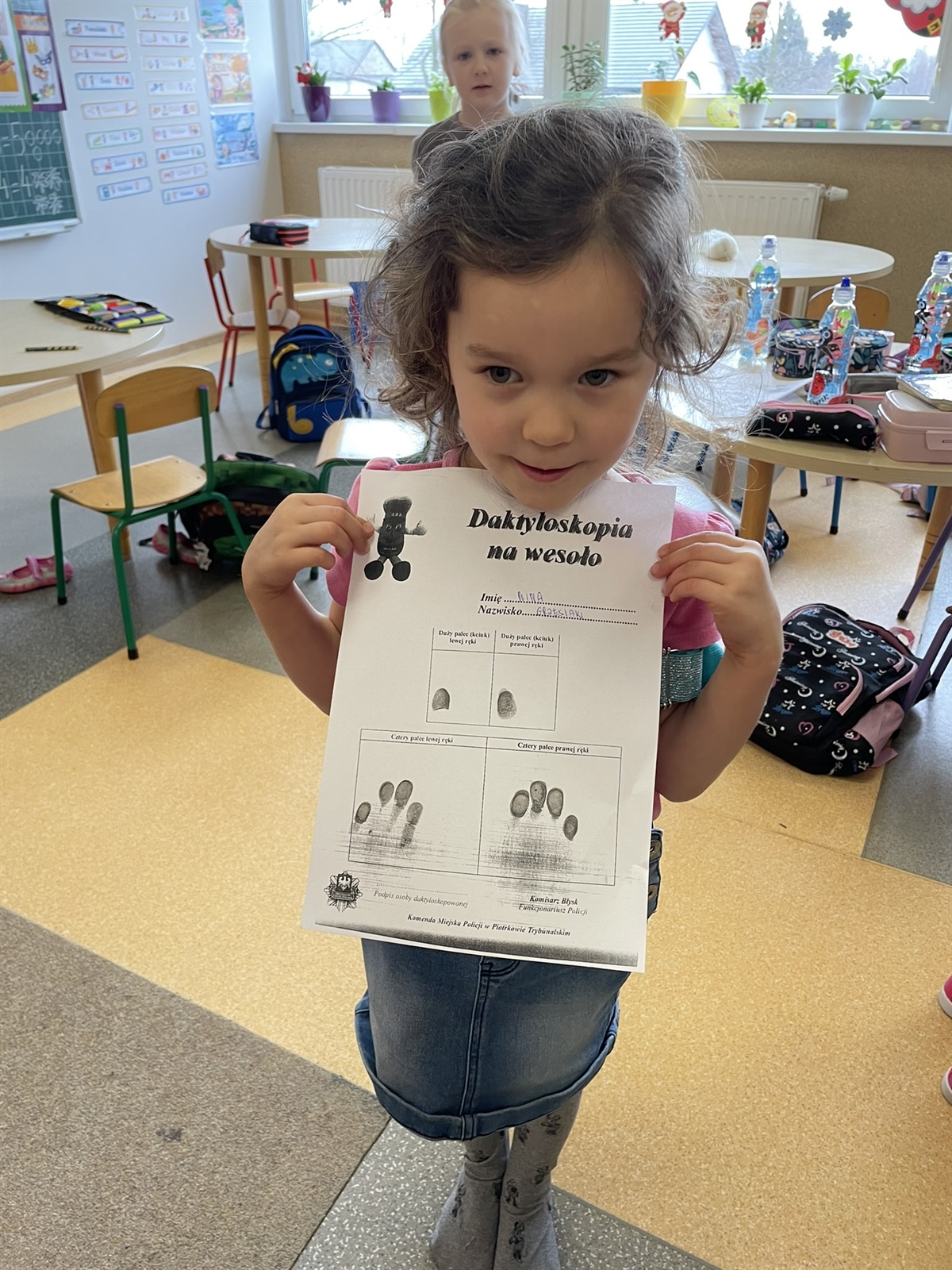 - policjantka Miejskiej Komendy Policji w Piotrkowie Trybunalskim. Przedszkolaki posłuchały o tym, czym się zajmuje się policjant. Mogły na własne oczy zobaczyć umundurowanie policyjne. Każdy zapozował z czapką policyjną, mógł założyć na ręce prawdziwe kajdanki, a także przymierzyć ciężką kamizelkę policyjną chroniącą policjantów przed uderzeniem np. kibiców piłkarskich. Nie lada gratką była możliwość odbicia swoich odcisków palca na kartce papieru. Poznaliśmy daktyloskopię, czyli technikę śledczą polegającą na badaniu porównawczym linii papilarnych dłoni w celu ustalenia sprawcy odpowiadającego za konkretne przestępstwo. W tym celu odciskaliśmy nasze palce na specjalnym wałku nasączonym tuszem, by później odcisnąć je na karcie daktyloskopii. Każdy dostał swój odcisk palca na pamięć. Był on umieszczony