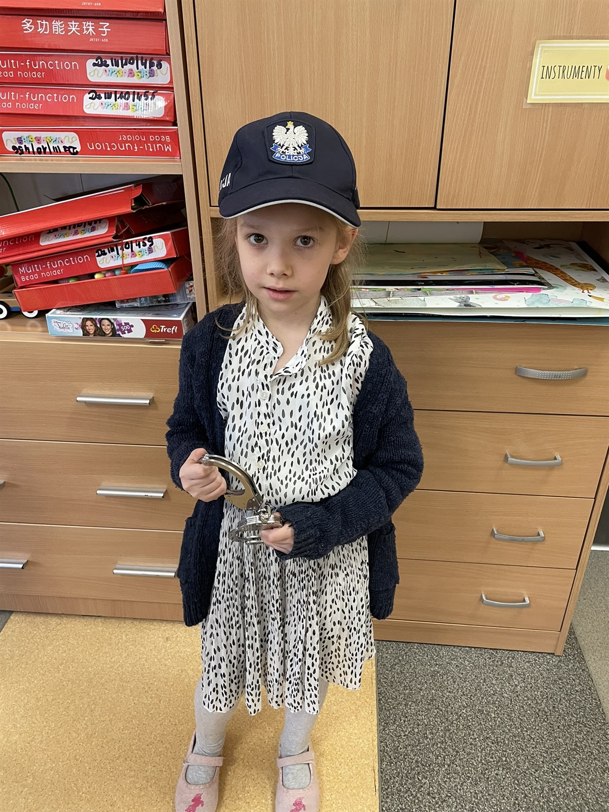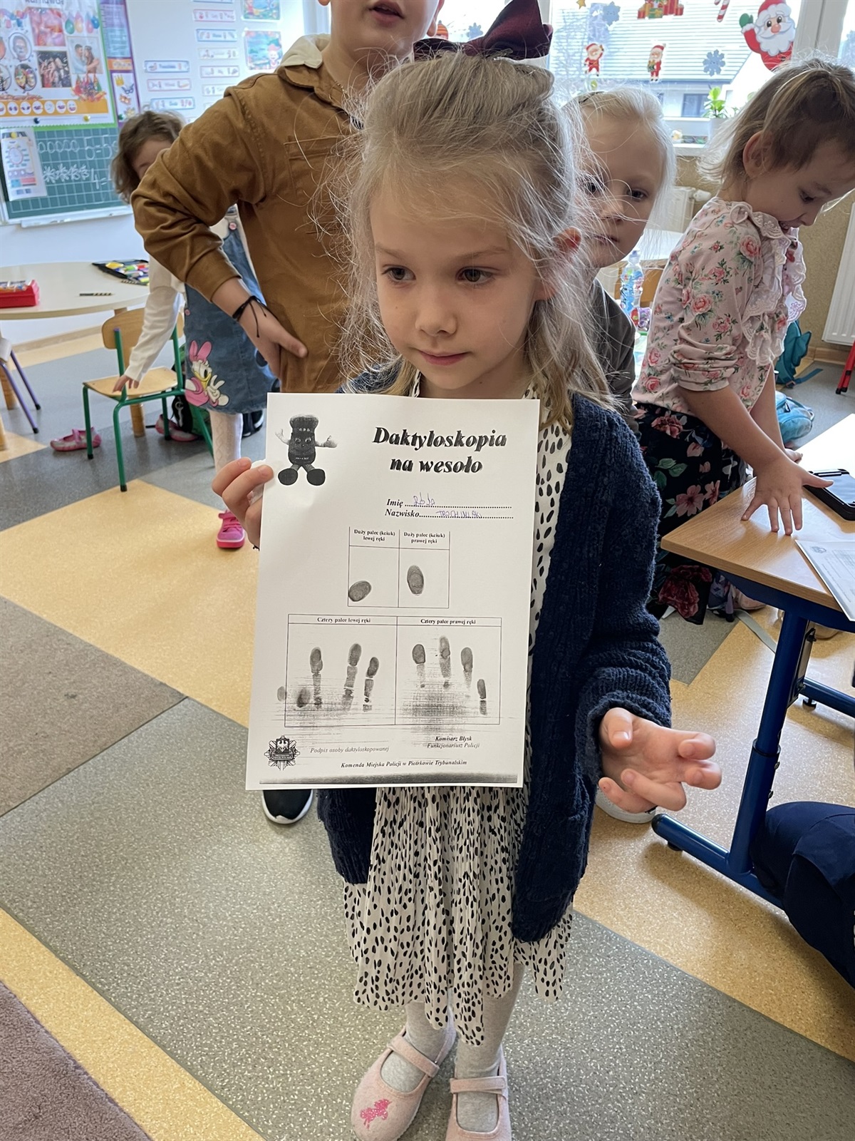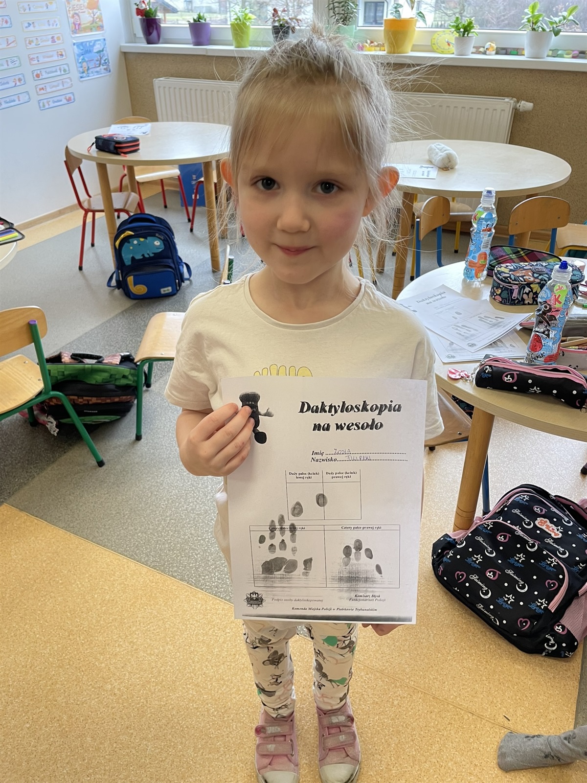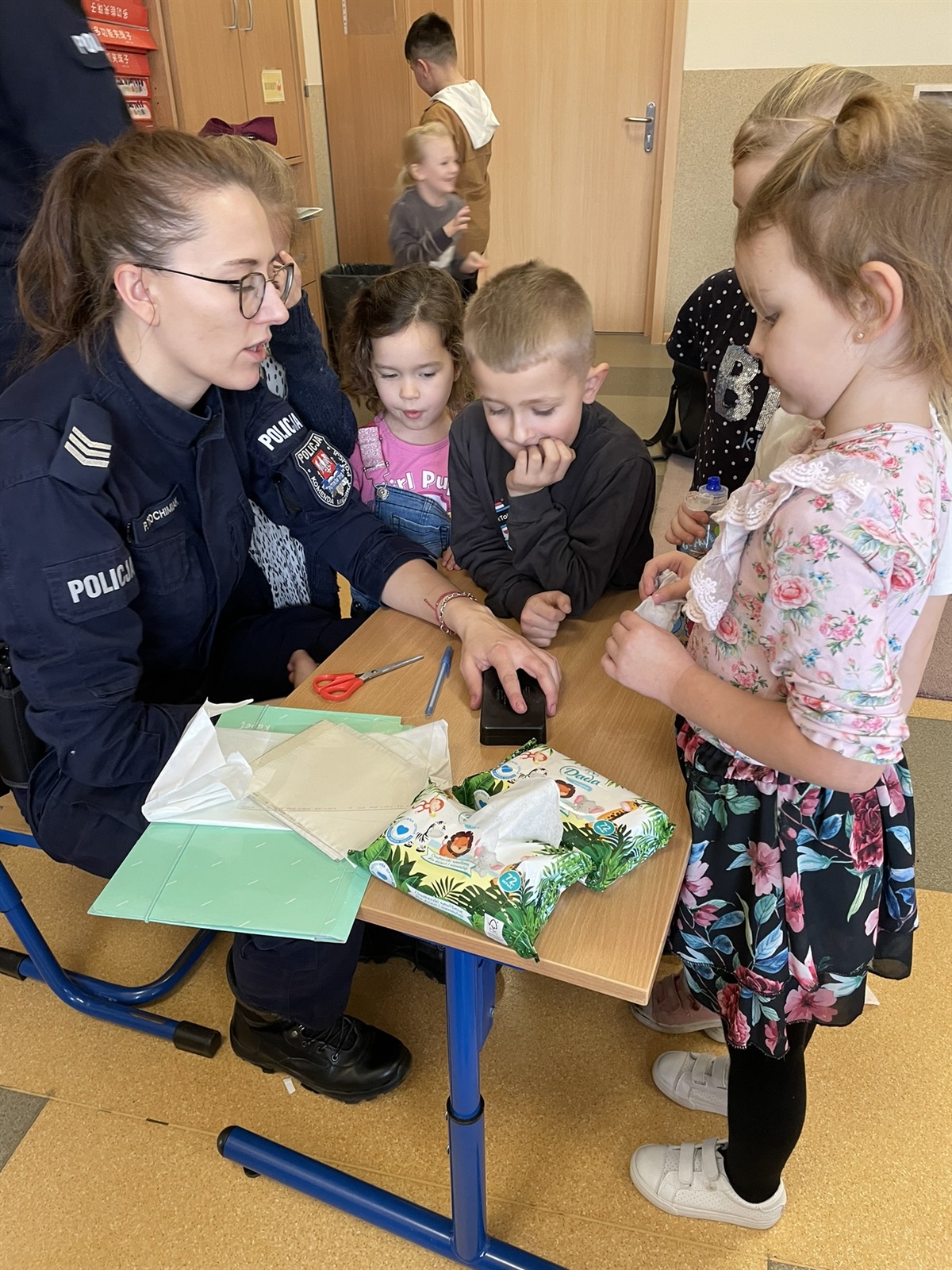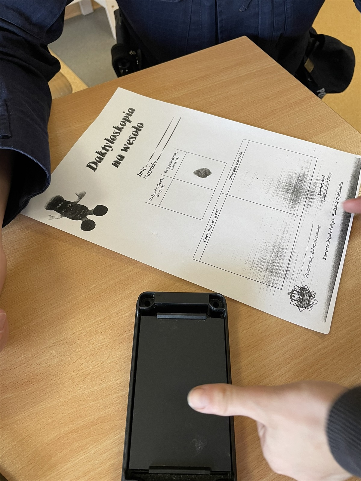 - policjantka Miejskiej Komendy Policji w Piotrkowie Trybunalskim. Przedszkolaki posłuchały o tym, czym się zajmuje się policjant. Mogły na własne oczy zobaczyć umundurowanie policyjne. Każdy zapozował z czapką policyjną, mógł założyć na ręce prawdziwe kajdanki, a także przymierzyć ciężką kamizelkę policyjną chroniącą policjantów przed uderzeniem np. kibiców piłkarskich. Nie lada gratką była możliwość odbicia swoich odcisków palca na kartce papieru. Poznaliśmy daktyloskopię, czyli technikę śledczą polegającą na badaniu porównawczym linii papilarnych dłoni w celu ustalenia sprawcy odpowiadającego za konkretne przestępstwo. W tym celu odciskaliśmy nasze palce na specjalnym wałku nasączonym tuszem, by później odcisnąć je na karcie daktyloskopii. Każdy dostał swój odcisk palca na pamięć. Był on umieszczony