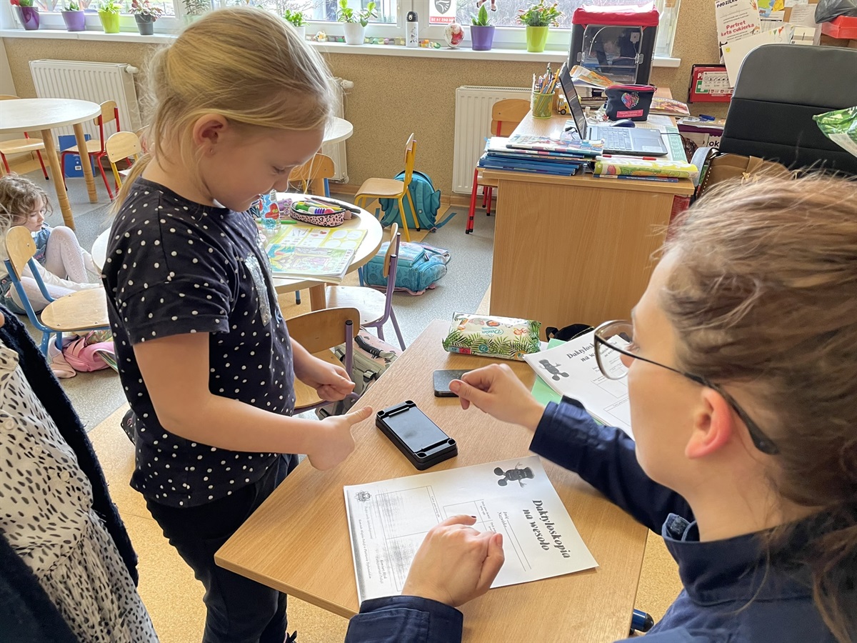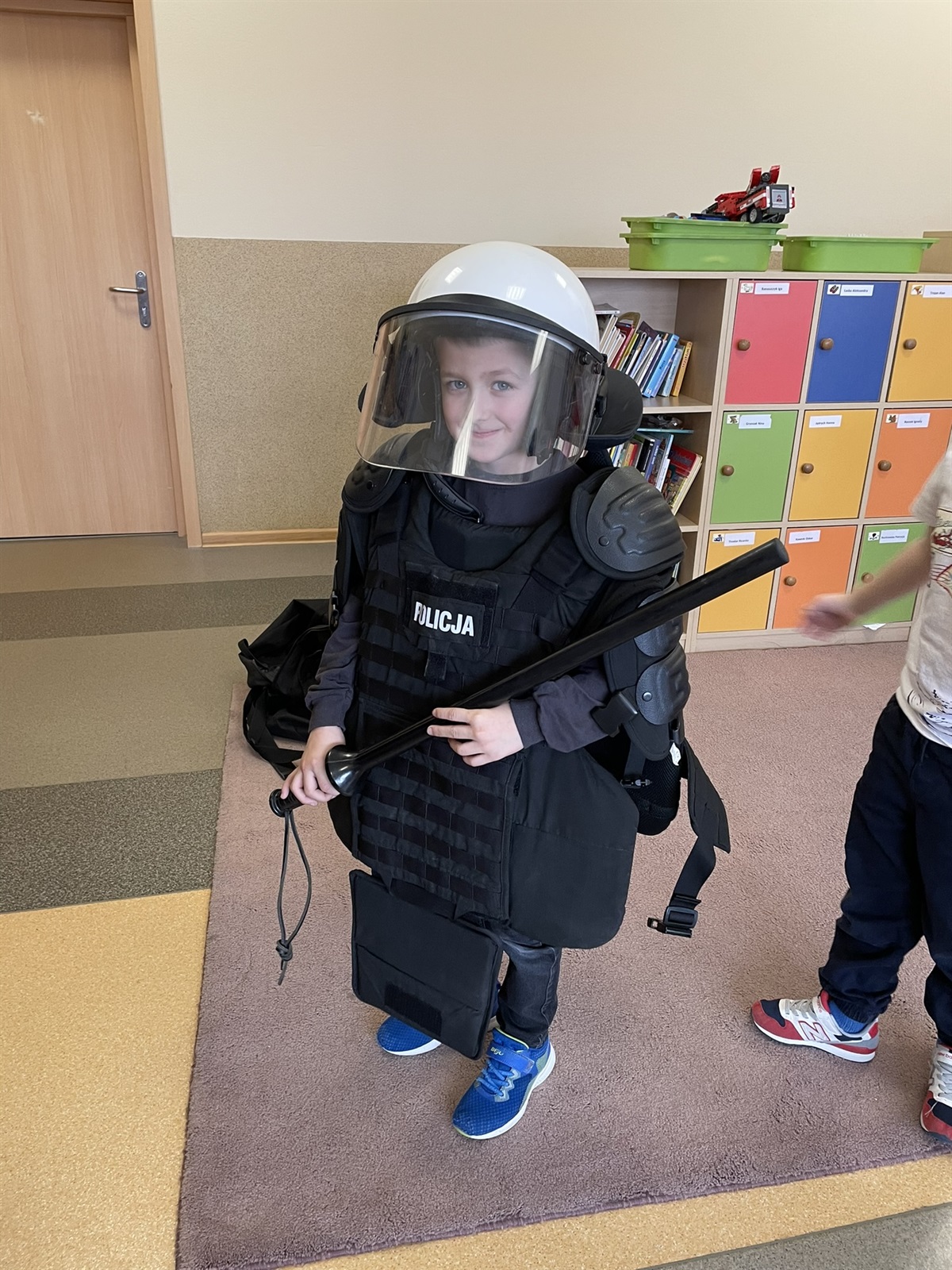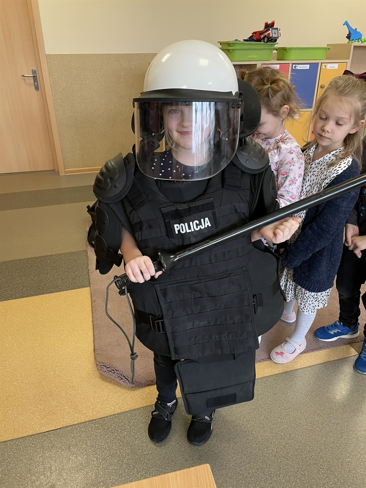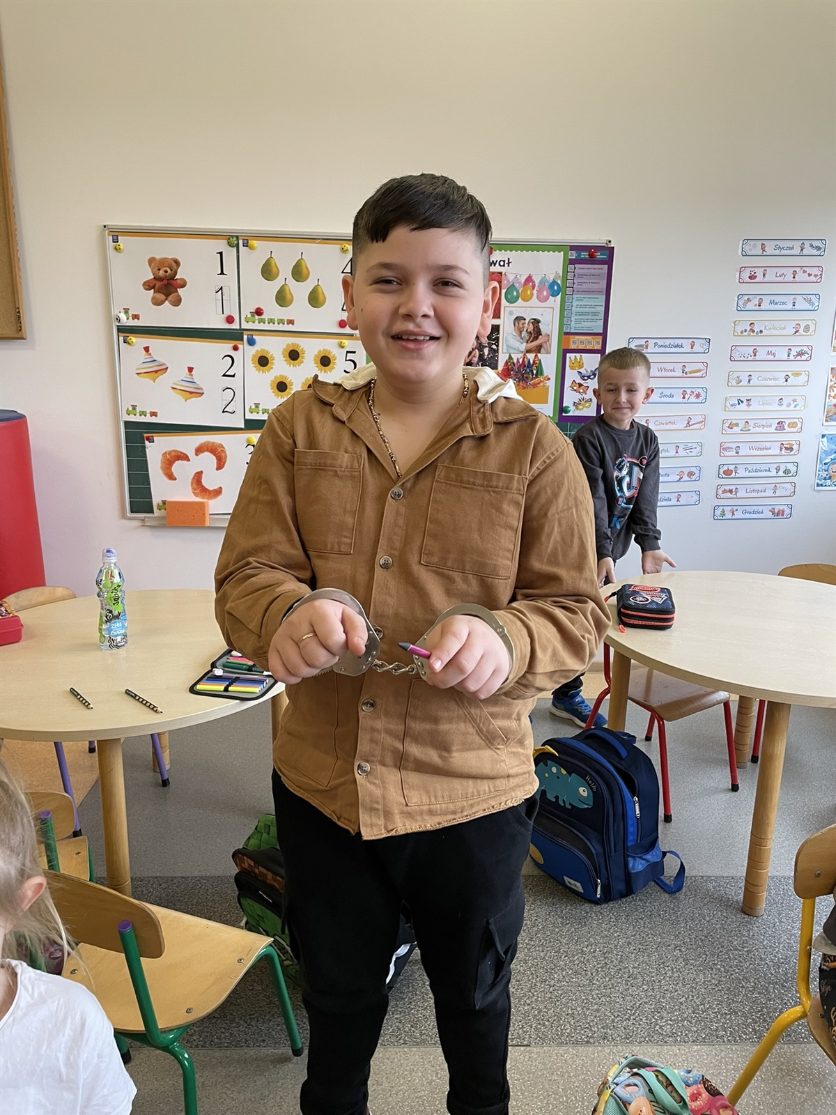 - policjantka Miejskiej Komendy Policji w Piotrkowie Trybunalskim. Przedszkolaki posłuchały o tym, czym się zajmuje się policjant. Mogły na własne oczy zobaczyć umundurowanie policyjne. Każdy zapozował z czapką policyjną, mógł założyć na ręce prawdziwe kajdanki, a także przymierzyć ciężką kamizelkę policyjną chroniącą policjantów przed uderzeniem np. kibiców piłkarskich. Nie lada gratką była możliwość odbicia swoich odcisków palca na kartce papieru. Poznaliśmy daktyloskopię, czyli technikę śledczą polegającą na badaniu porównawczym linii papilarnych dłoni w celu ustalenia sprawcy odpowiadającego za konkretne przestępstwo. W tym celu odciskaliśmy nasze palce na specjalnym wałku nasączonym tuszem, by później odcisnąć je na karcie daktyloskopii. Każdy dostał swój odcisk palca na pamięć. Był on umieszczony