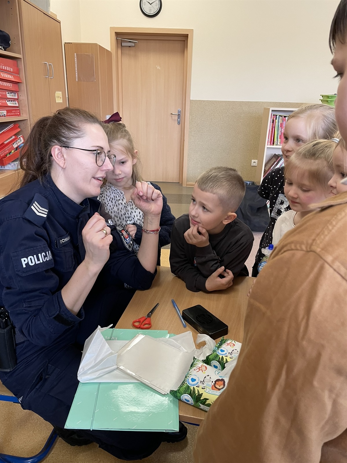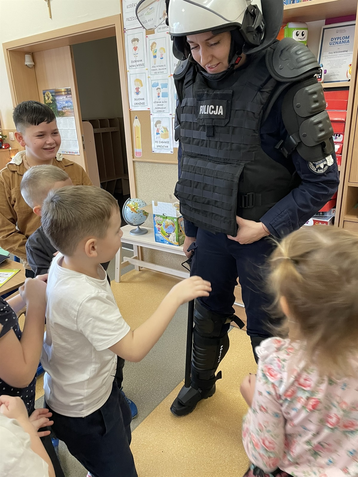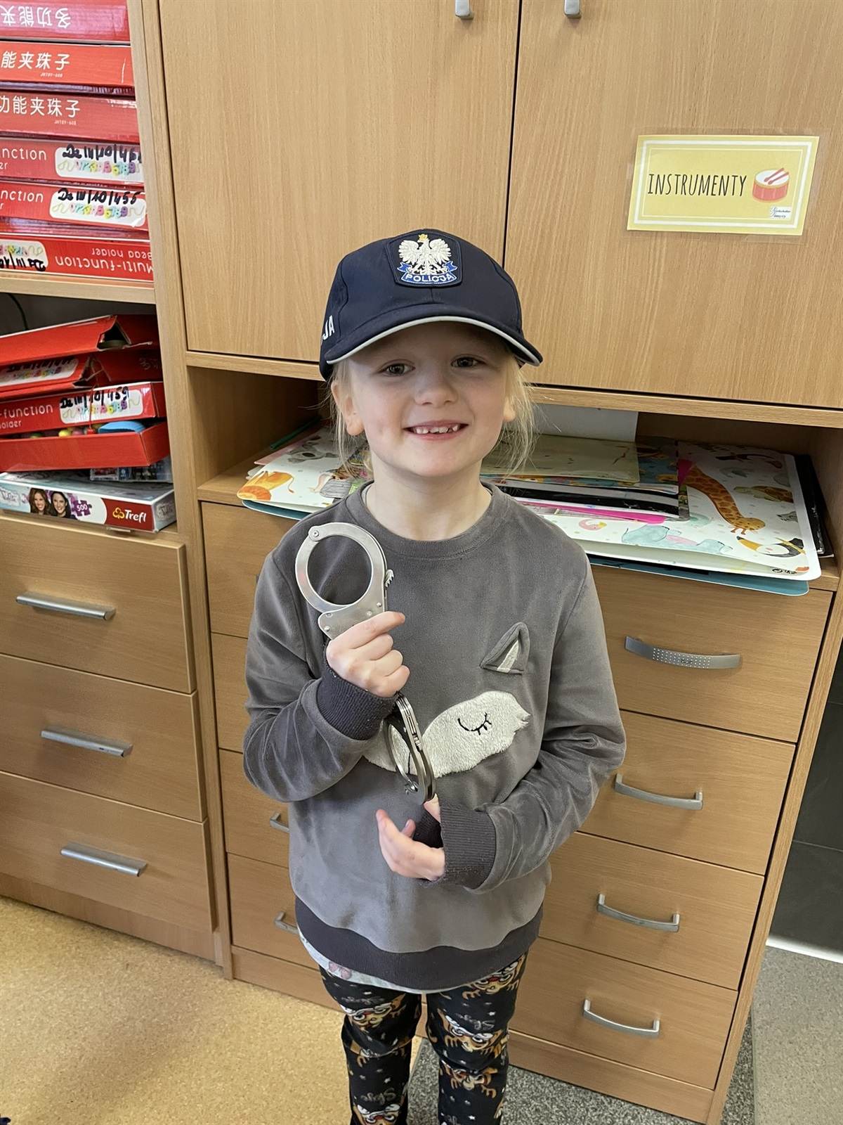 Serdeczne podziękowania dla Pani Pauliny Trochimiak, która bardzo profesjonalnie, z wielkim zaangażowaniem oraz poczuciem humoru zaprezentowała swój zawód i zaraziła dzieci bakcylem zawodu policjanta.