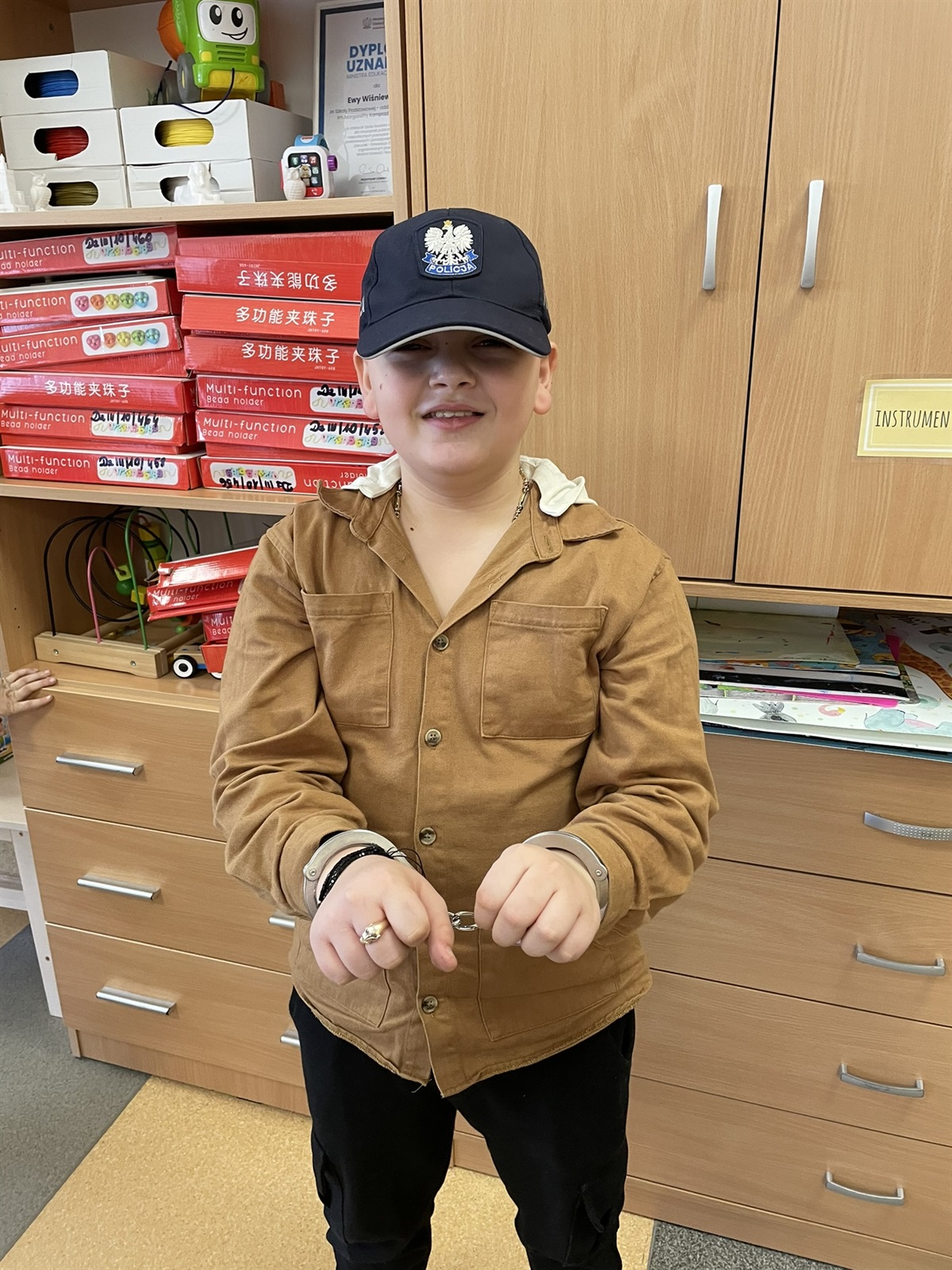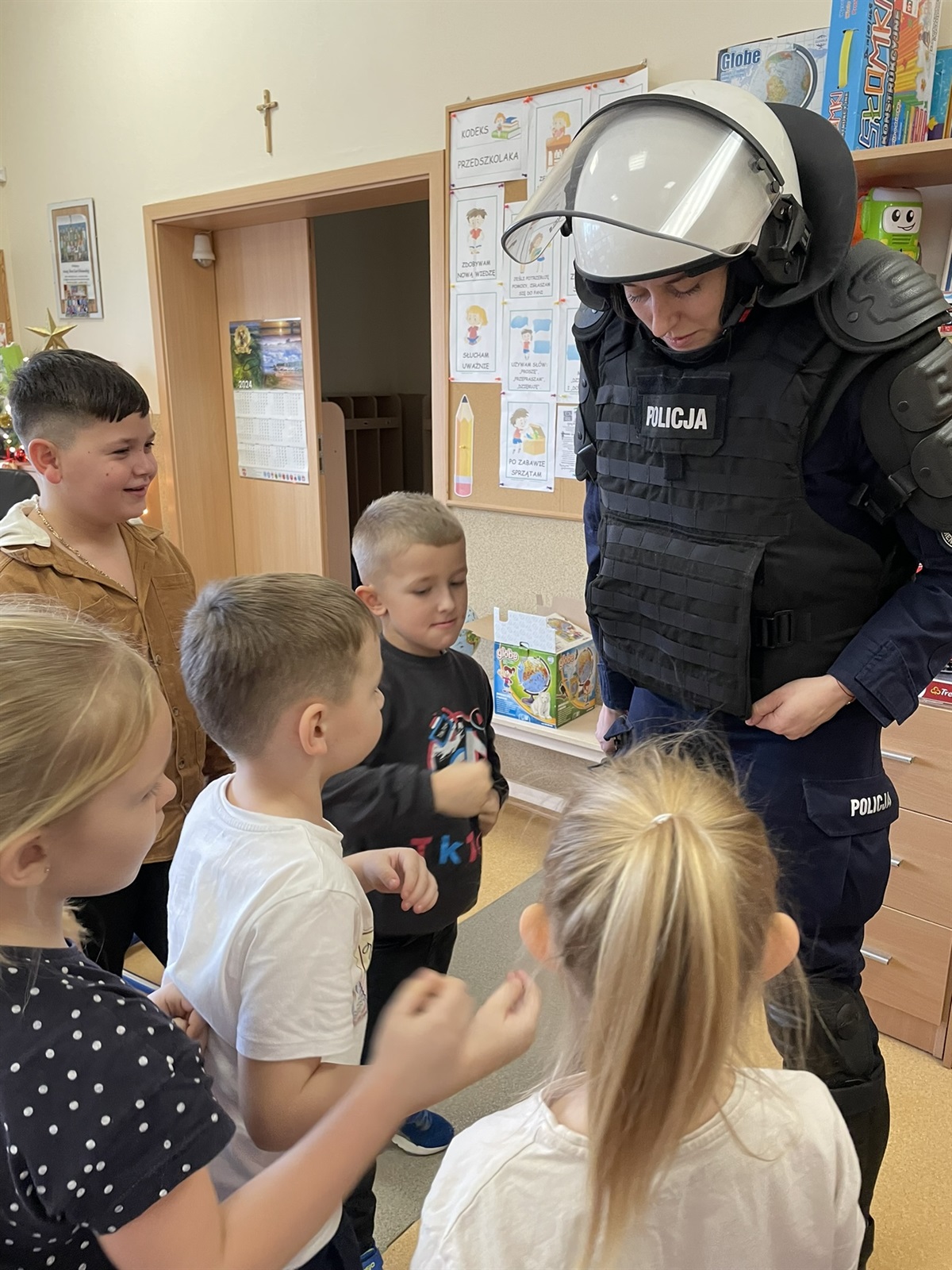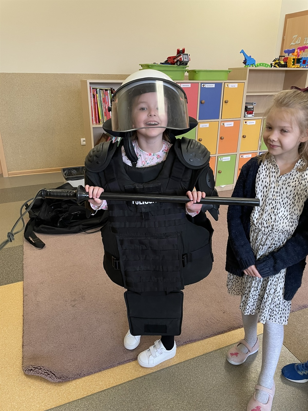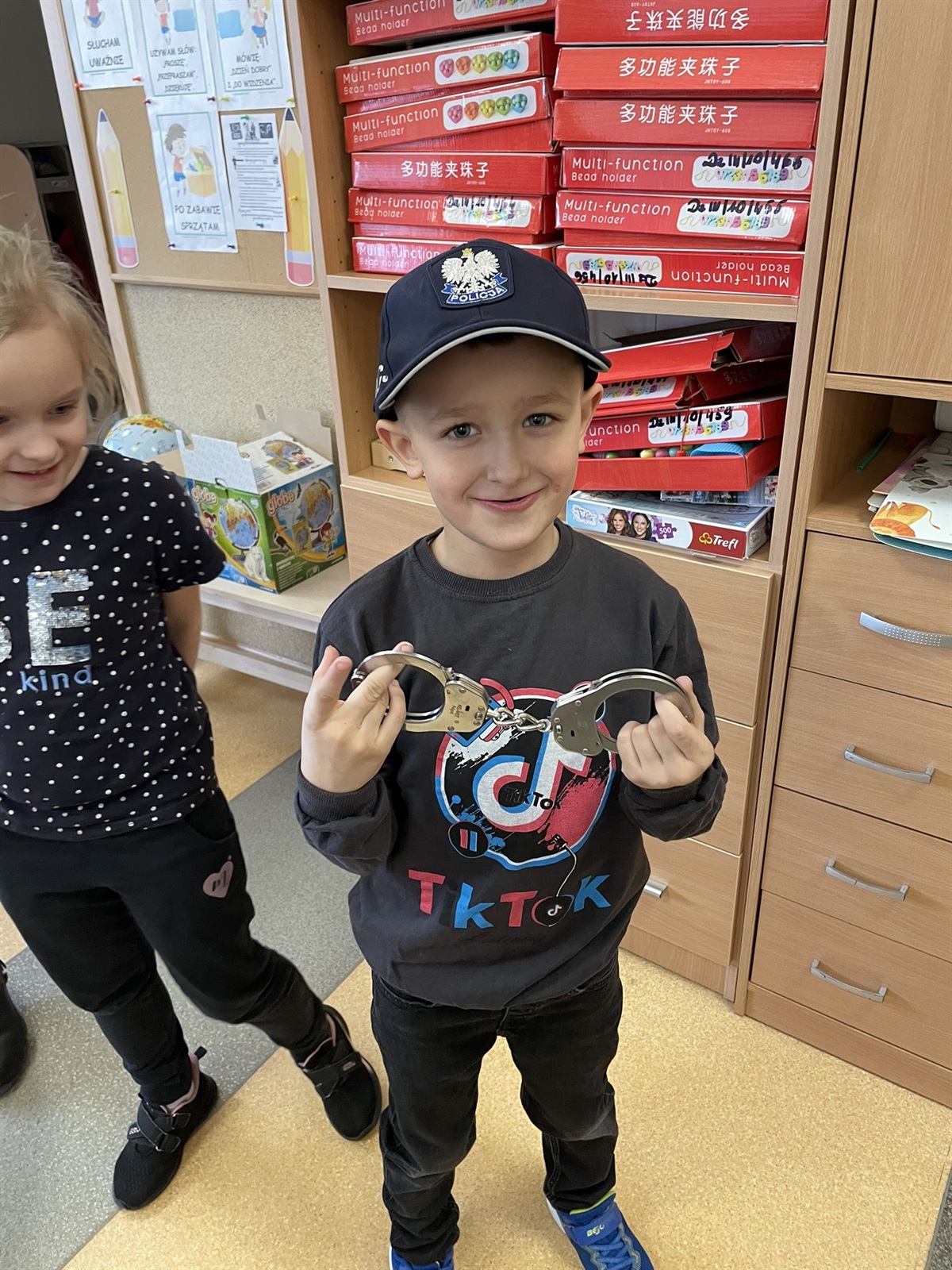 jak pojawienie się w oddziale przedszkolnym Pani Pauliny Trochimiak zawodowej policjantki z Miejskiej Komendy Policji w Piotrkowie Trybunalskim.  Na rozpoczęcie ferii odbyliśmy niezwykłą lekcję przedsiębiorczości. Bo któż z małych przedszkolaków nie marzy, o tym, aby założyć mundur policjanta, potrzymać kajdanki oraz włożyć na siebie kamizelkę ochronną. Tego wszystkiego mali adepci mogli zaznać w ramach piątkowego (26.01.2024 r.) spotkania z Panią policjantką.