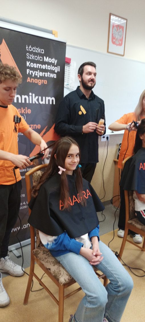 W środę 14 lutego gościliśmy przedstawicieli Łódzkiej Szkoły Mody Kosmetologii Fryzjerstwa Anagra. Przyjechali do uczniów klas VII i VIII by opowiedzieć o swojej szkole, zajęciach i realizowanych przez nich projektach. Zachęcali do wstąpienia w ich szeregi i zdobycia zawodu kosmetyczki lub fryzjera. Na dowód posiadanych przez nich umiejętności wykonali makijaże i fryzury na naszych modelkach. Cieszymy się, że doszło do tak ciekawego i owocnego spotkania. Jesteśmy zainteresowani dalszą współpracą.