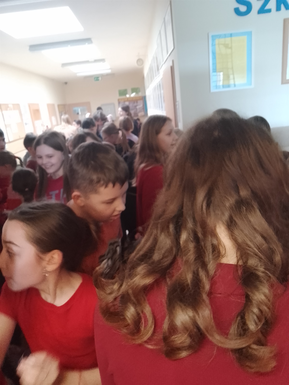 Tego dnia również Samorząd Uczniowski zorganizował zabawę „Znajdź swoją drugą połowę”, w której chętni uczniowie losowali połowę serca i musieli odnaleźć inną osobę z identyczną połówką. Nie było to łatwe zadanie ale dzięki temu nasz korytarz pełen był osób uśmiechniętych do siebie i otwartych na rozmowę z innymi. Ponad dwadzieścia par się odnalazło, dla najszybszych czekały słodkie upominki. Powtórka za rok! organizator. p. Ewa Kroczyńska, p. Monika Robert