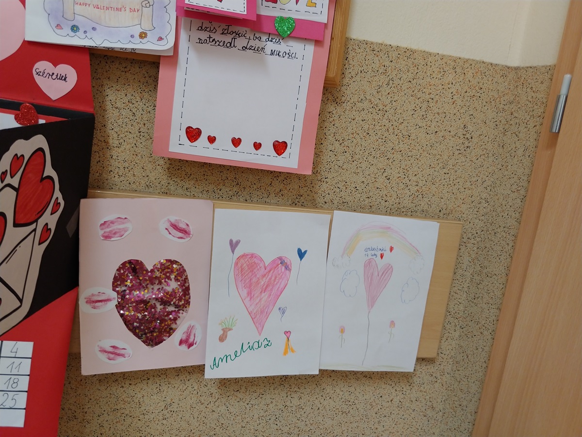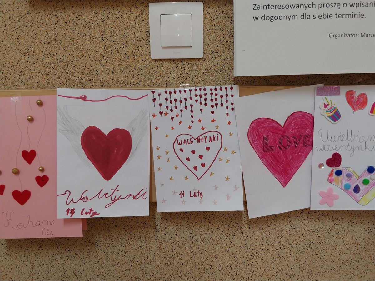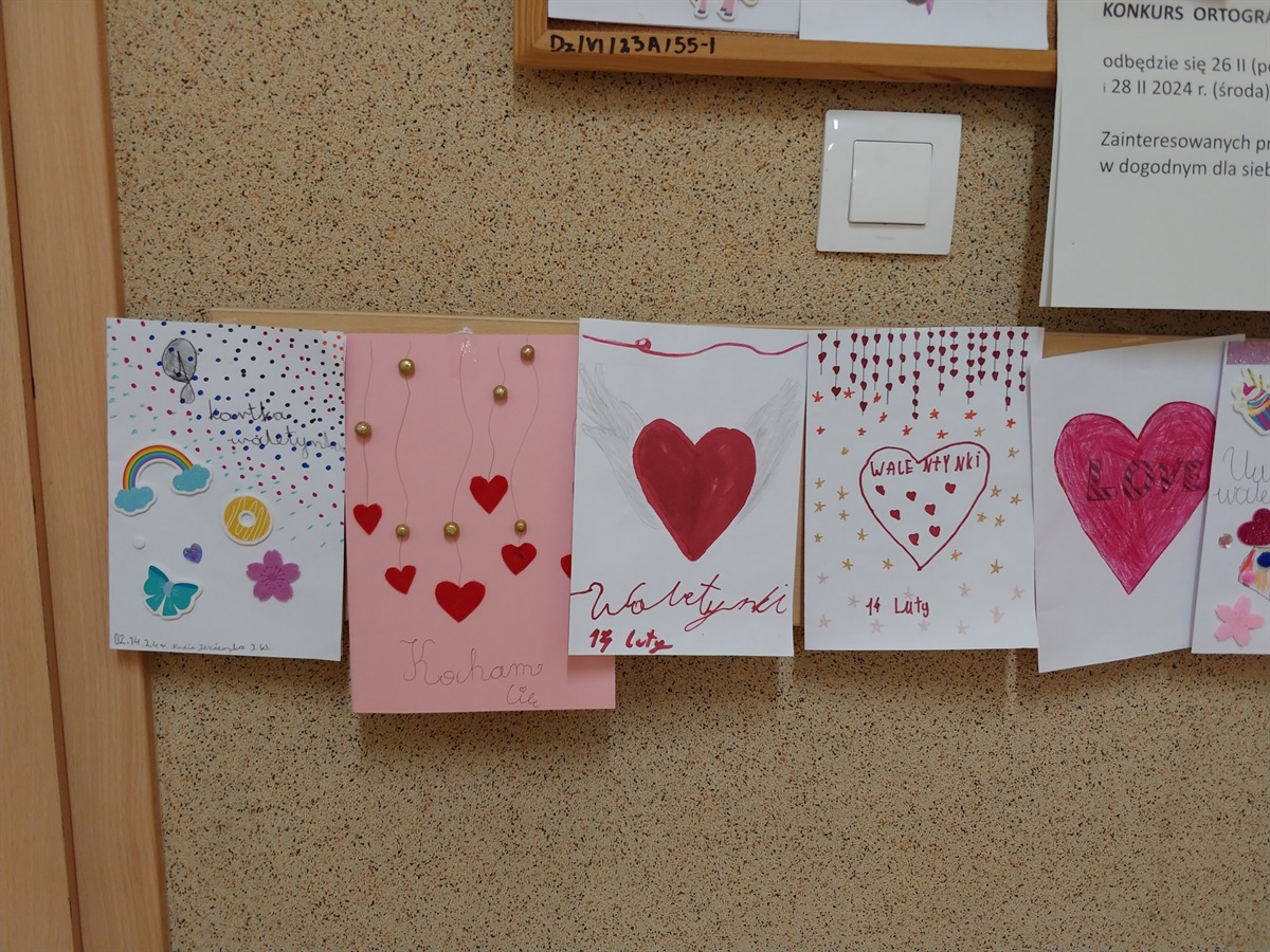 14 lutego 2024 r. świętowaliśmy Dzień Zakochanych. Uczniowie z klasy VI Ada Wężyk, Franciszek Masiarek, Michał Adamczyk i Helena makowska rozdawały listy składane wcześniej do skrzynki walentynkowej. Każdy za jej pośrednictwem mógł przesłać życzenia swojej sympatii. Został również rozstrzygnięty konkurs plastyczny pt.: "MOJA WALENTYNKA". Spośród wielu przepięknie wykonanych kartek wyłoniliśmy zwycięzców. Nagrody otrzymali: Martyna Dziubecka, Lena Kujawska, Adam Trawiński, Maja Grzesiak, Maja Kwaśniewska, Aleksandra Augustyniak. Były też wyróżnienia dla Magdaleny Zaręby, Maji Kujawskiej, Patyrka Besztaka, Filipa Justyny oraz Antoniego Wolniaka. Organizatoremh Walentynek i konkursu była p. Anna Strzopa-Machulska. Zwycięzcom gratulujemy, a wszystkim biorącym udział w zabawie bardzo dziękujemy.