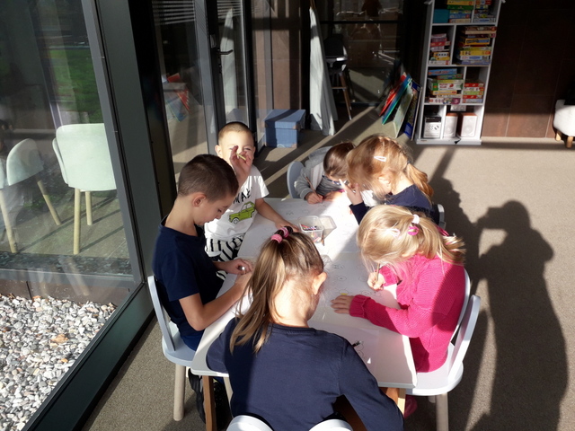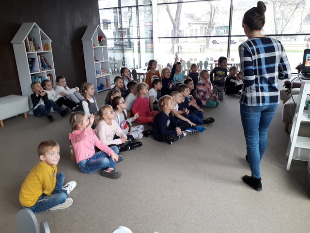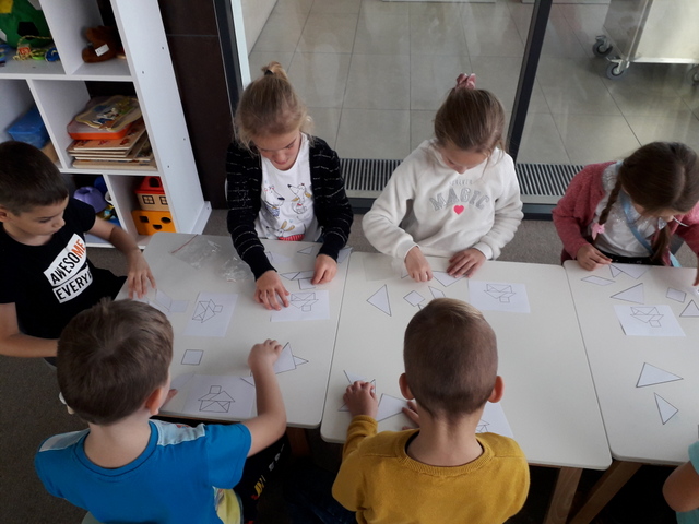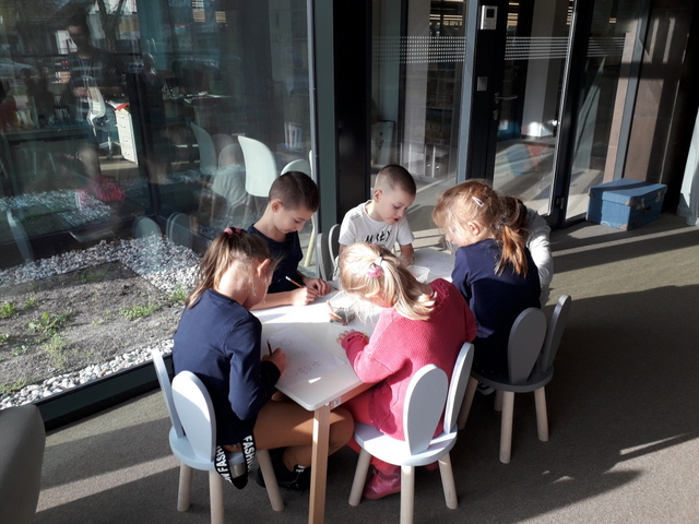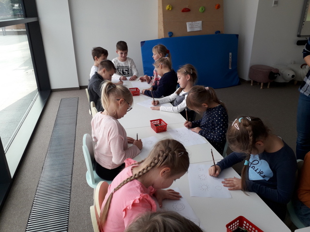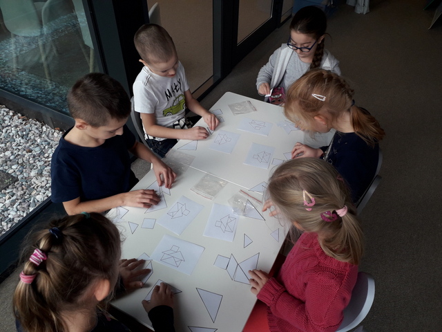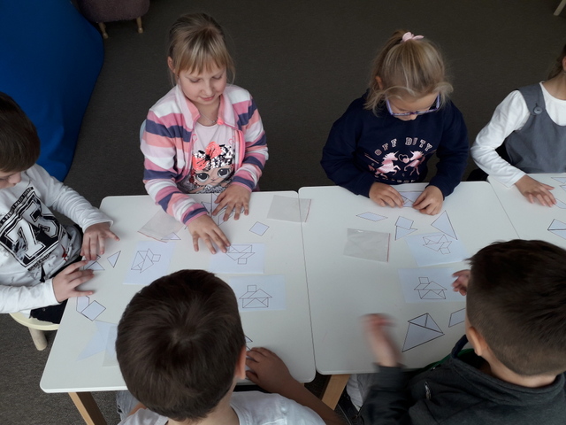 Zajęcia biblioteczne, zgodnie z wcześniejszą umową, przygotowane były odpowiednio dla klasy I i II. Młodsi uczniowie uczestniczyli w lekcji pt.: „Literacka geometria Danuty Wawiłow”. Pani przeczytała jeden z wierszy autorki i  pytała dzieci o kształty, które znają. Następnie uczniowie wykonali pracę z kółek – każdy stworzył swój geometryczny obrazek.  Na koniec zajęć uczniowie układali tangramy i odszukiwali różnice na obrazkach – wszyscy świetnie się spisali.