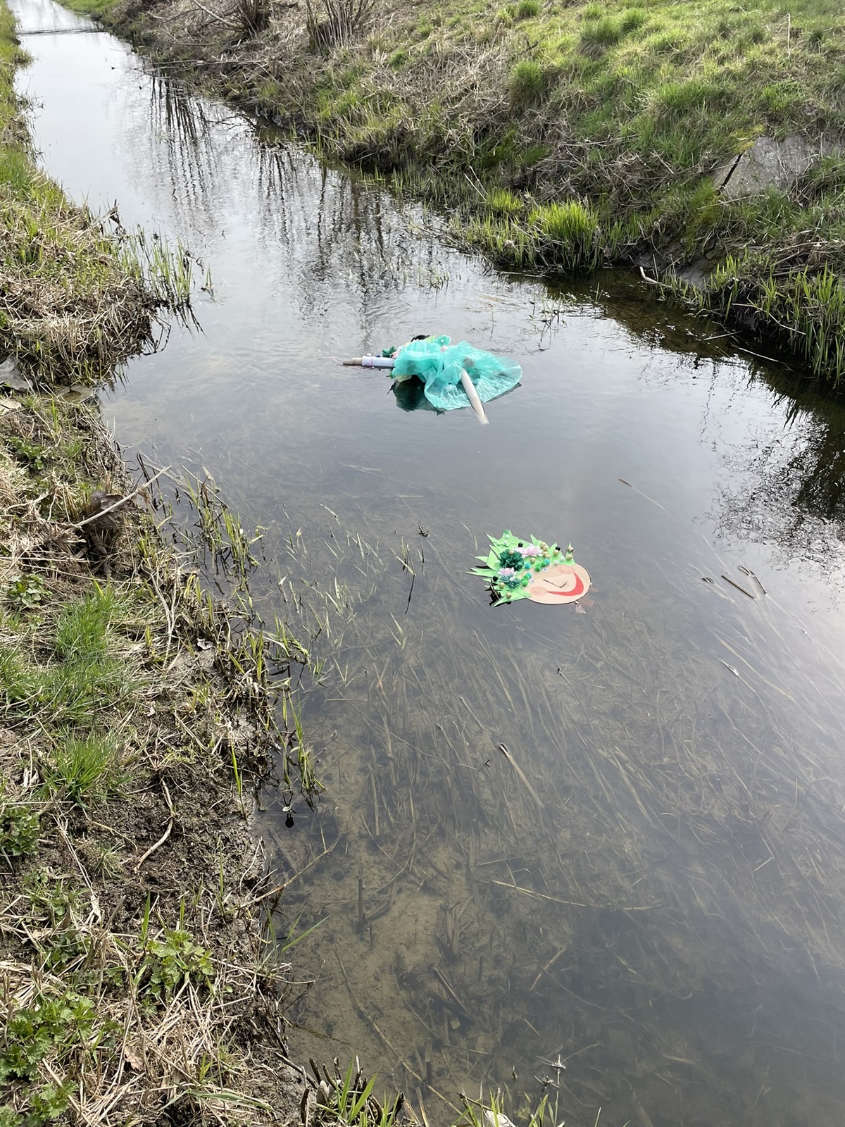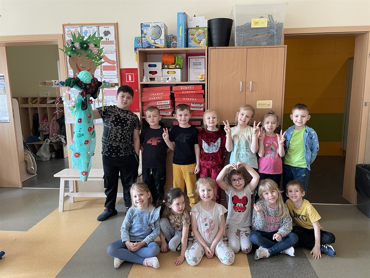 To właśnie ona była dziś gwiazdą naszego dnia, zrobiona z rolek od papieru, pomponów, tektury, papieru, starych materiałów, papierowych foremek od ciasteczek, brokatowych kuleczek - „Marzanna”, bo o niej mowa wrzucona do wody zainicjowała 21.03.2024 roku powitanie wiosny w oddziale przedszkolnym.