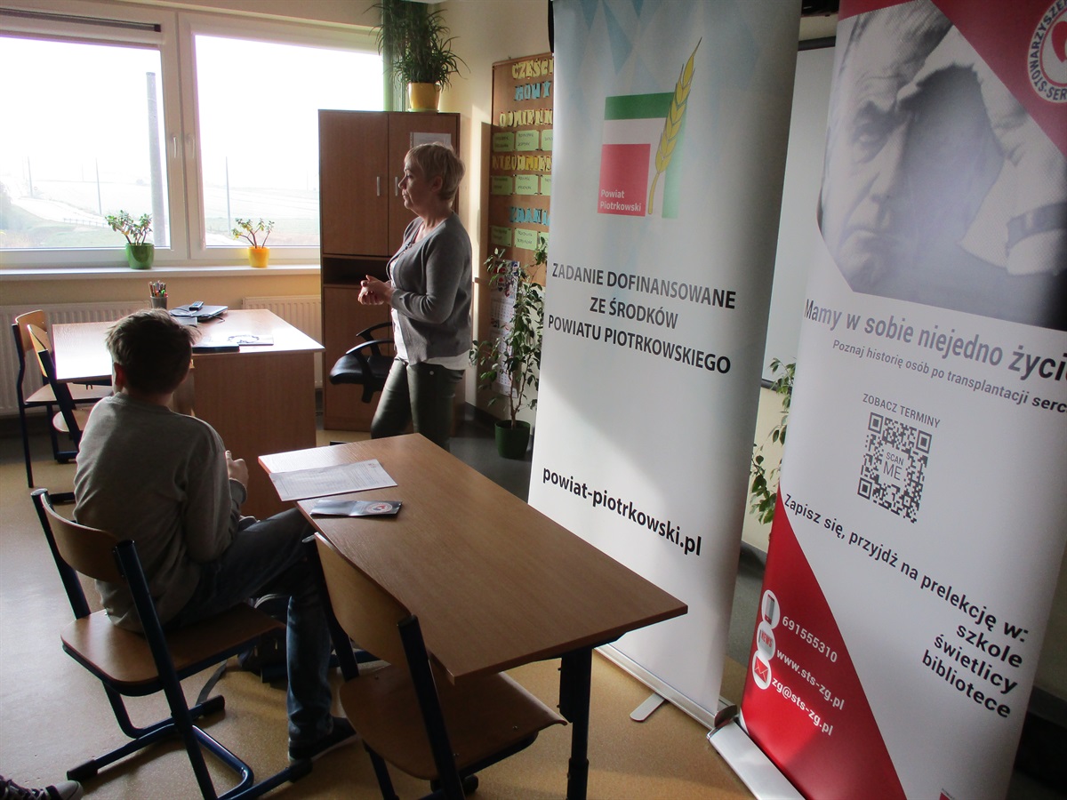 W dniu 8 listopada 2019 r. gościliśmy w naszej szkole panią Magdalenę Durę - osobę po przeszczepieniu serca, która opowiadała uczniom klasy VII i VIII o podarowanym życiu. Zachęcała również do zastanowienia się, czy każdy człowiek powinien wyrazić deklarację woli, w ramach której zdrowe organy po jego śmierci uratowałyby życie drugiego człowieka. Uczniowie otrzymali materiały edukacyjne związane z tematyką przeszczepień.
