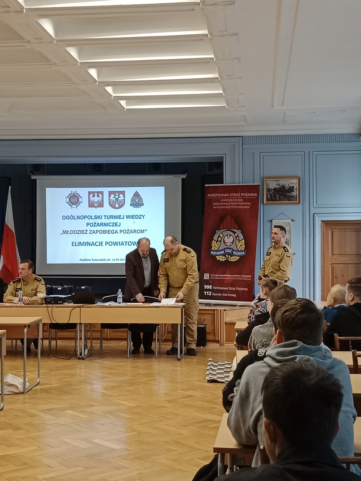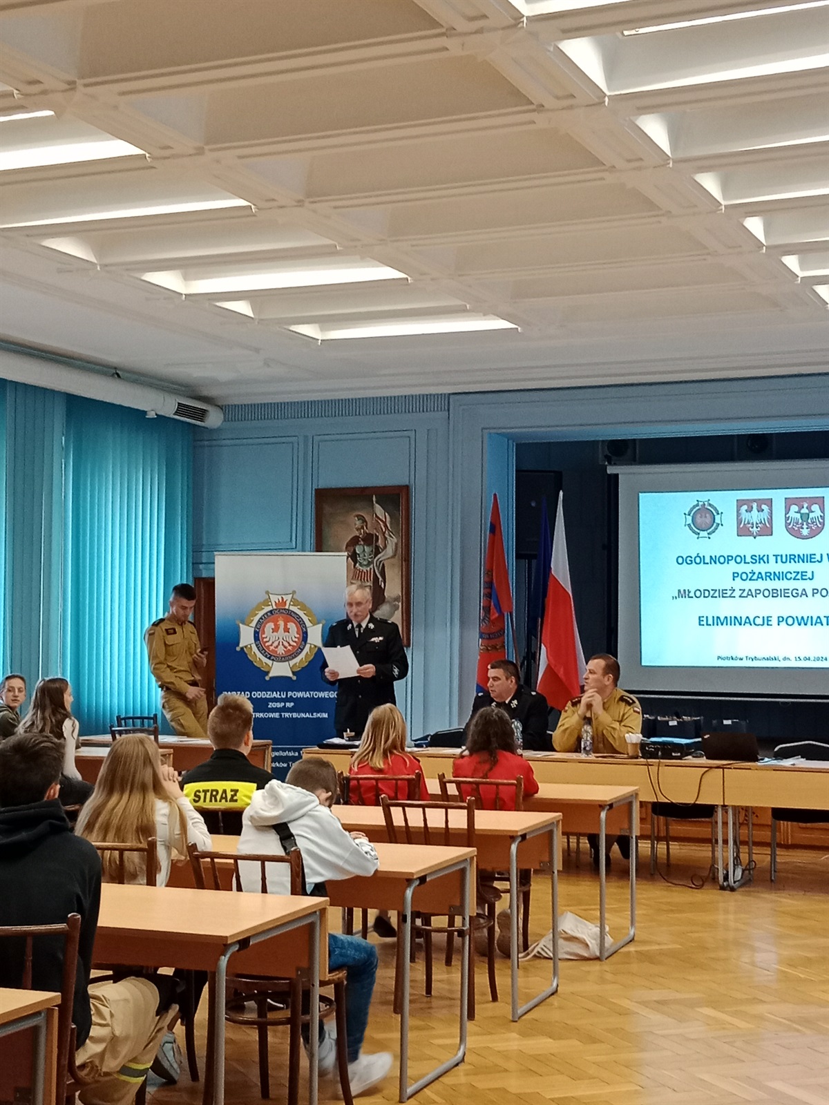 Dnia 15 kwietnia 2024 r. w Państwowej Straży Pożarnej w Piotrkowie Trybunalskim odbyły się eliminacje powiatowe Ogólnopolskiego Turnieju Wiedzy Pożarniczej pn. „Młodzież Zapobiega Pożarom”. Gminę Moszczenica w kategorii klas V-VIII, reprezentował uczeń naszej szkoły – Michał Adamczyk z kl. VI. Konkursowicze rozpoczęli od napisania testu wiedzy, który wyłonił kandydatów do ścisłego finału. W kolejnym etapie uczniowie odpowiadali na pytania dotyczące prezentowanego sprzętu strażackiego i pierwszej pomocy. Ostatecznie Michał zajął II miejsce. Dla uczestników konkursu organizatorzy przygotowali również atrakcje w postaci prelekcji o historii pożarów oraz zwiedzanie budynku Straży Pożarnej  w celu prezentacji sprzętu gaśniczego. Michał należy do Młodzieżowej Drużyny Pożarniczej mieszczącej się w OSP Jarosty i był przygotowywany do turnieju przez p. Magdalenę i Marcina Adamczyków. Gratulujemy i życzymy kolejnych sukcesów.