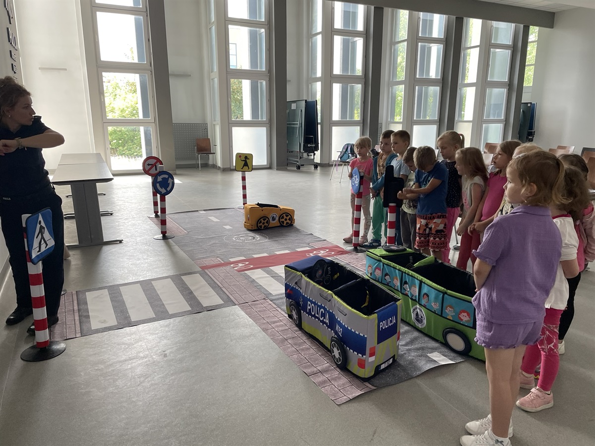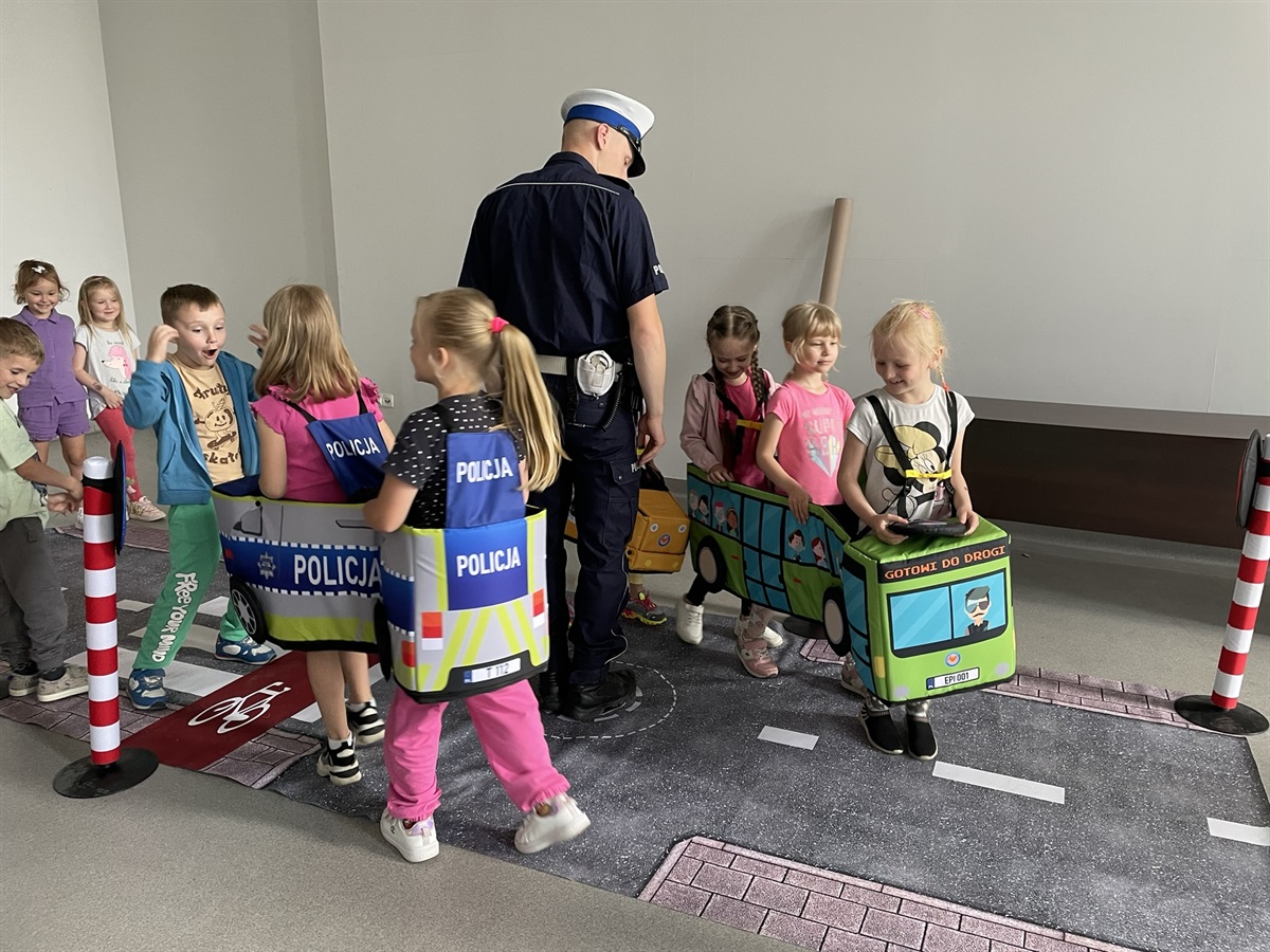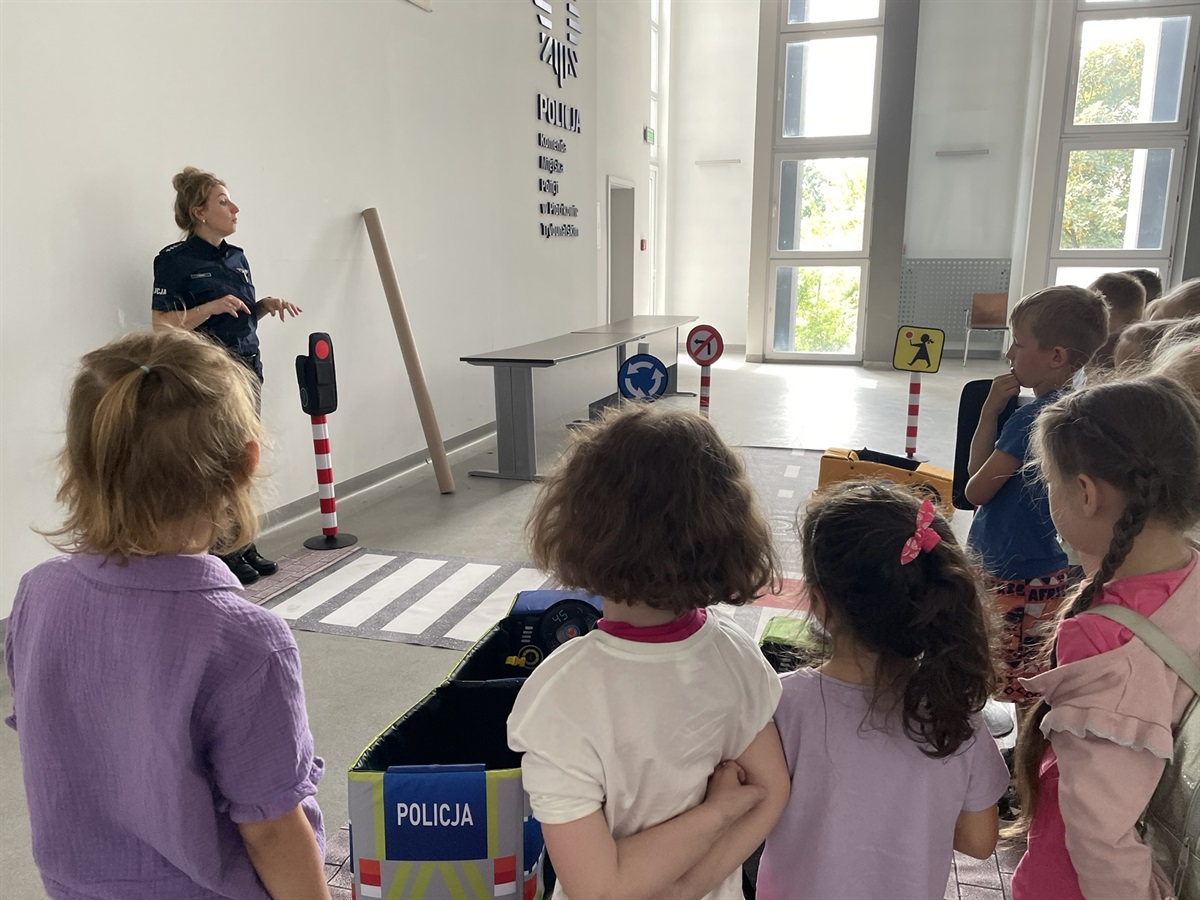 się, kiedy policjant pokazuje, że jest światło czerwone, pomarańczowe, zielone. Wszystko odbywało się pod fachowym okiem aspirant Katarzyny Dębińskiej - policyjnego profilaktyka w Komendzie Miejskiej Policji w Piotrkowie Trybunalskim. Zwieńczeniem spotkania z policją była możliwość wejścia na prawdziwy motocykl policyjny, a także do radiowozu policyjnego. Panowie policjanci użyli nawet sygnału dźwiękowego, żeby nas pożegnać. Była to niesamowita frajda. Zdobyte informacje przydadzą nam się zwłaszcza przed nadchodzącymi wakacjami podczas, których wyruszamy na wakacje i stajemy się uczestnikami ruchu drogowego.