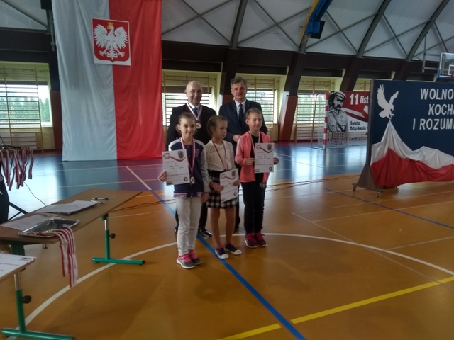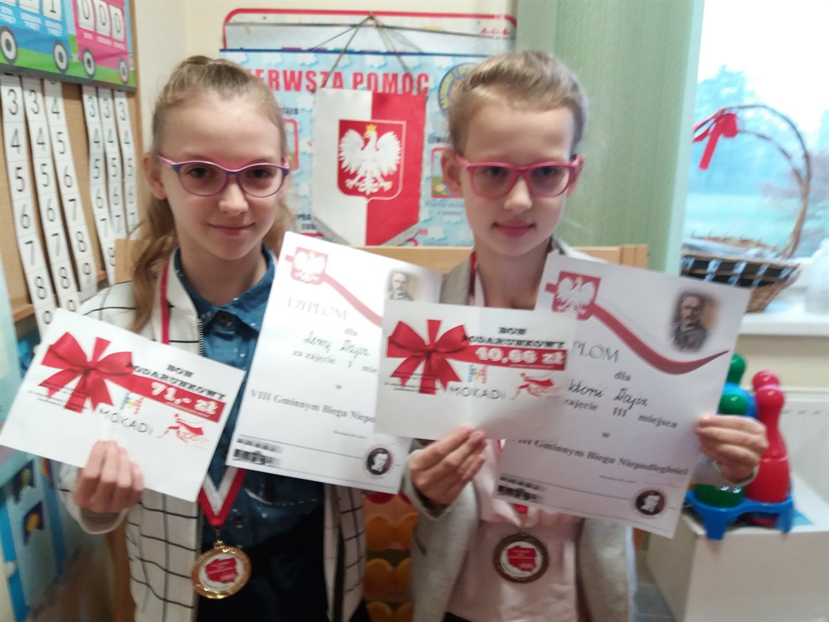 08.11.2019 r. odbył się VIII - Gminny Bieg Niepodległości pod patronatem wójta Gminy Moszczenica - Marcelego Piekarka. Wzięli w nim udział uczniowie naszej szkoły zarówno w kategorii klas młodszych, jak i starszych. W kategorii dziewczynek klas I-III Lena Dajcz zdobyła I miejsce, Wiktoria Dajcz III miejsce. w kategorii chłopców Mateusz Pirek zdobył miejsce V. W rywalizacji klas IV-VIII zwyciężyli – Anna Kiełbasa z klasy VIa oraz Adrian Tomczyński z klasy VIII. Za miejsca w pierwszej trójce uczniowie otrzymywali dyplomy, medale oraz nagrody - talony pieniężne na zakupy w sklepie "Mokadi" w Moszczenicy. Zwycięzcom, jak i pozostałym uczestnikom biegu serdecznie gratulujemy!