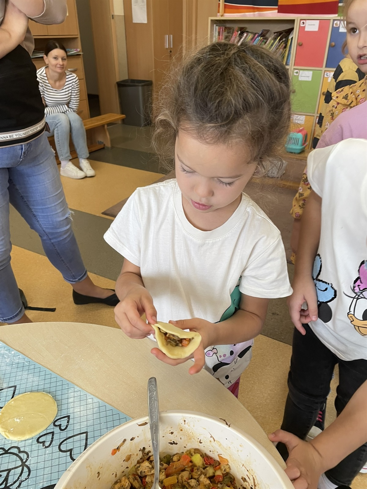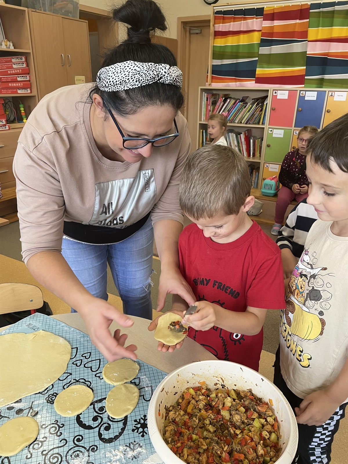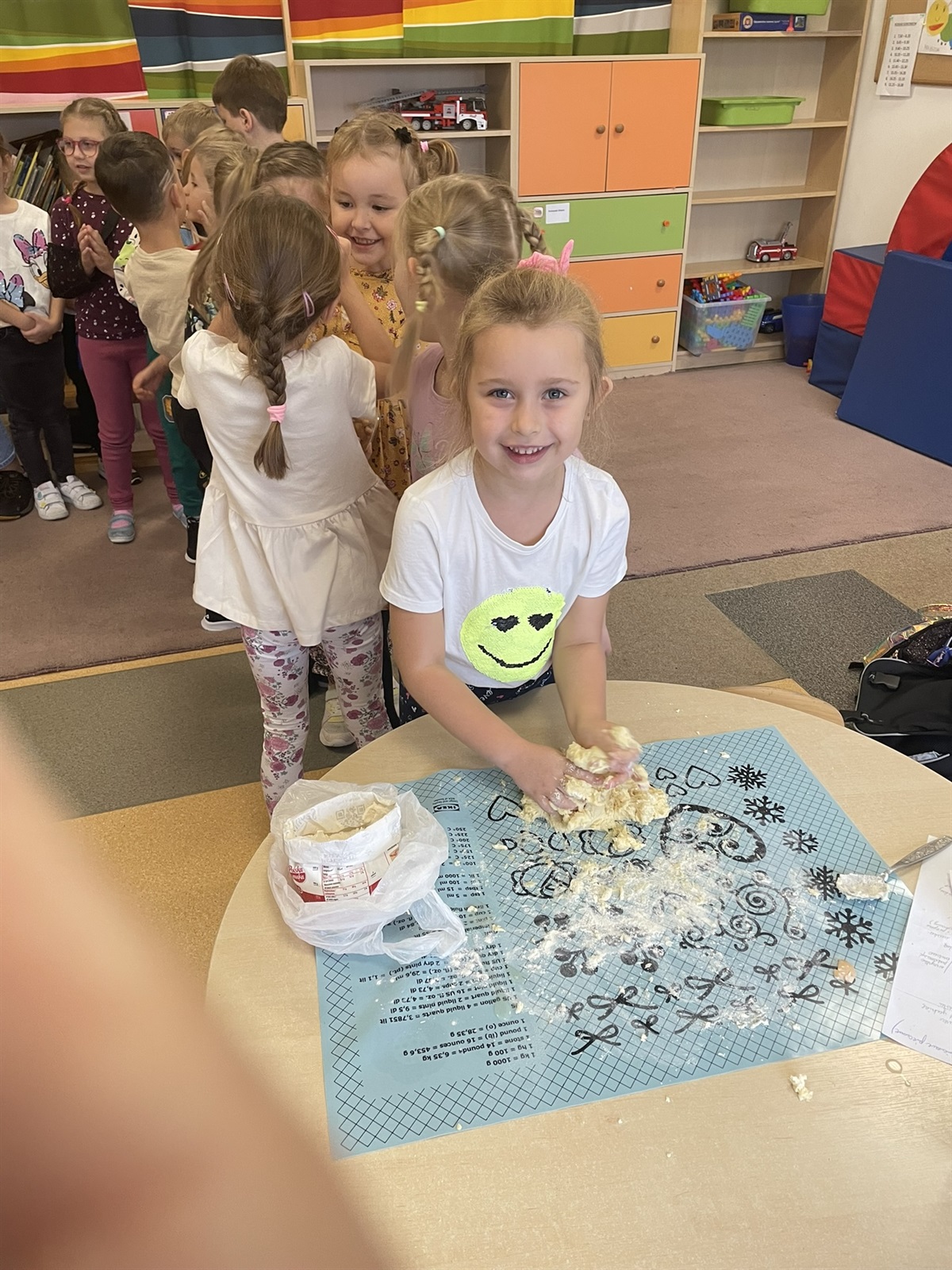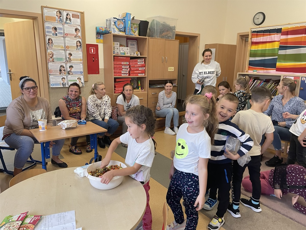 W poniedziałkowy poranek 7 października 2024 r. w oddziale przedszkolnym odbyły się kulinarne zmagania przedszkolaków oraz ich rodziców. Dziecięce rączki przy pomocy rodziców przygotowały składniki, a później gniotły, wałkowały, ubijały ciasto, które na godzinę powędrowało do lodówki. Następnie mali kucharze stworzyli farsz. Gdy ciasto już było gotowe wszyscy mali kucharze zakasali rękawy i zaczęli lepić włoskie mini calzone. Dzięki czemu usprawniliśmy chwyt szczypcowy, rozwój manualny, a także poznaliśmy miary matematyczne dotyczące ilości dodawanych składników. Później ze smakiem zajadaliśmy się wraz z rodzicami przepysznymi pierożkami calzone z dodatkiem sosu czosnkowego.