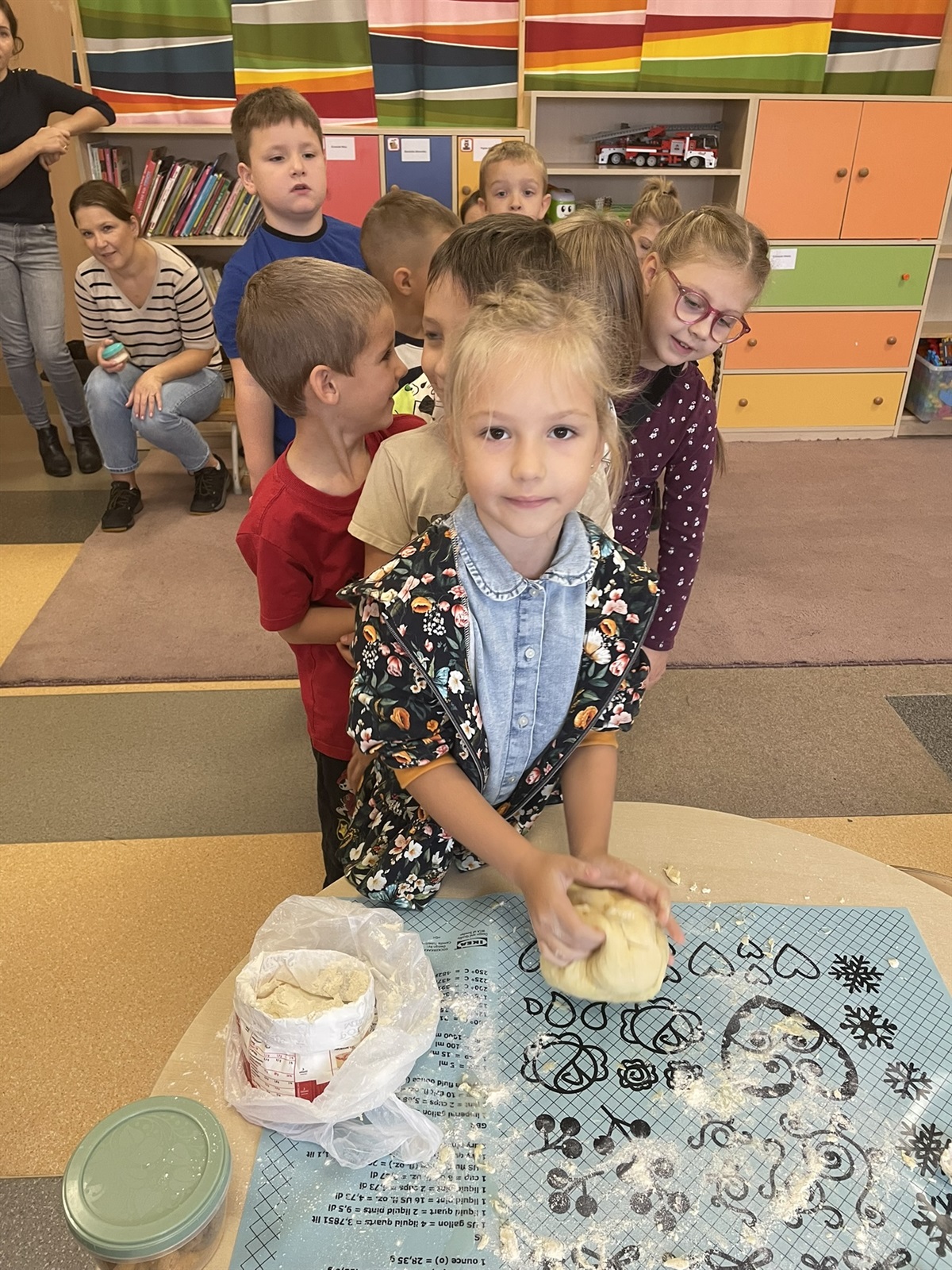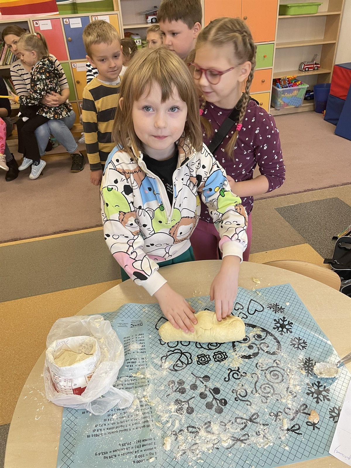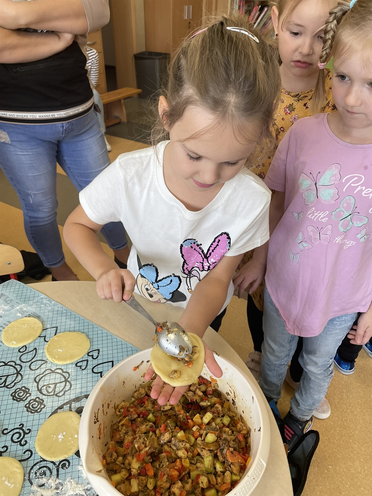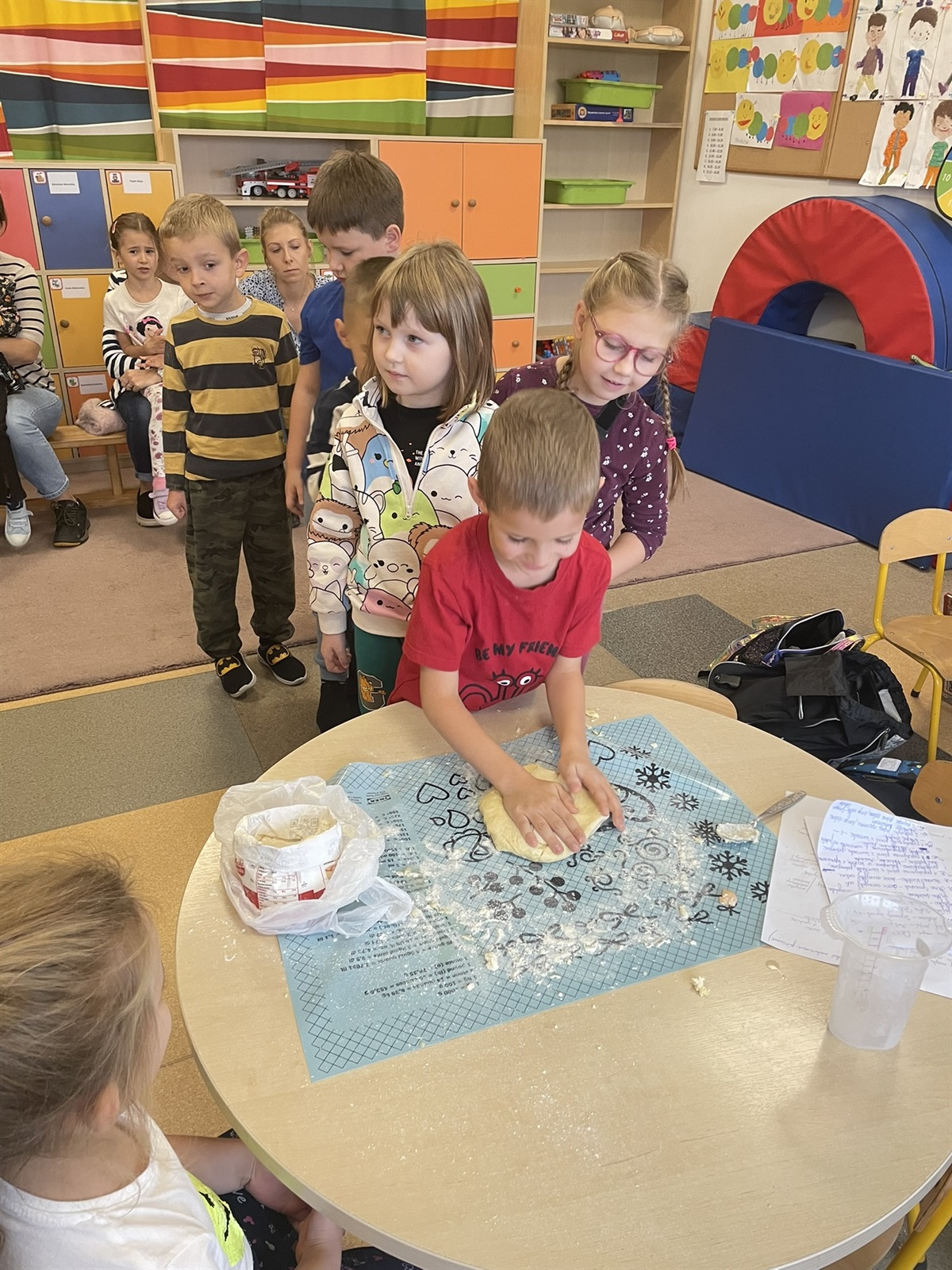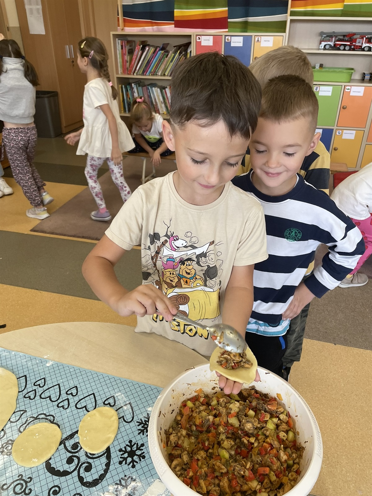 W poniedziałkowy poranek 7 października 2024 r. w oddziale przedszkolnym odbyły się kulinarne zmagania przedszkolaków oraz ich rodziców. Dziecięce rączki przy pomocy rodziców przygotowały składniki, a później gniotły, wałkowały, ubijały ciasto, które na godzinę powędrowało do lodówki. Następnie mali kucharze stworzyli farsz. Gdy ciasto już było gotowe wszyscy mali kucharze zakasali rękawy i zaczęli lepić włoskie mini calzone. Dzięki czemu usprawniliśmy chwyt szczypcowy, rozwój manualny, a także poznaliśmy miary matematyczne dotyczące ilości dodawanych składników. Później ze smakiem zajadaliśmy się wraz z rodzicami przepysznymi pierożkami calzone z dodatkiem sosu czosnkowego.