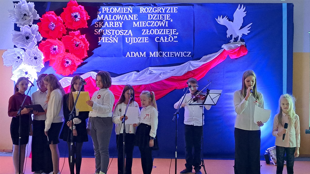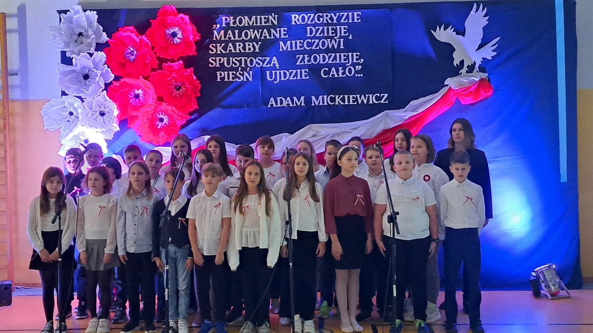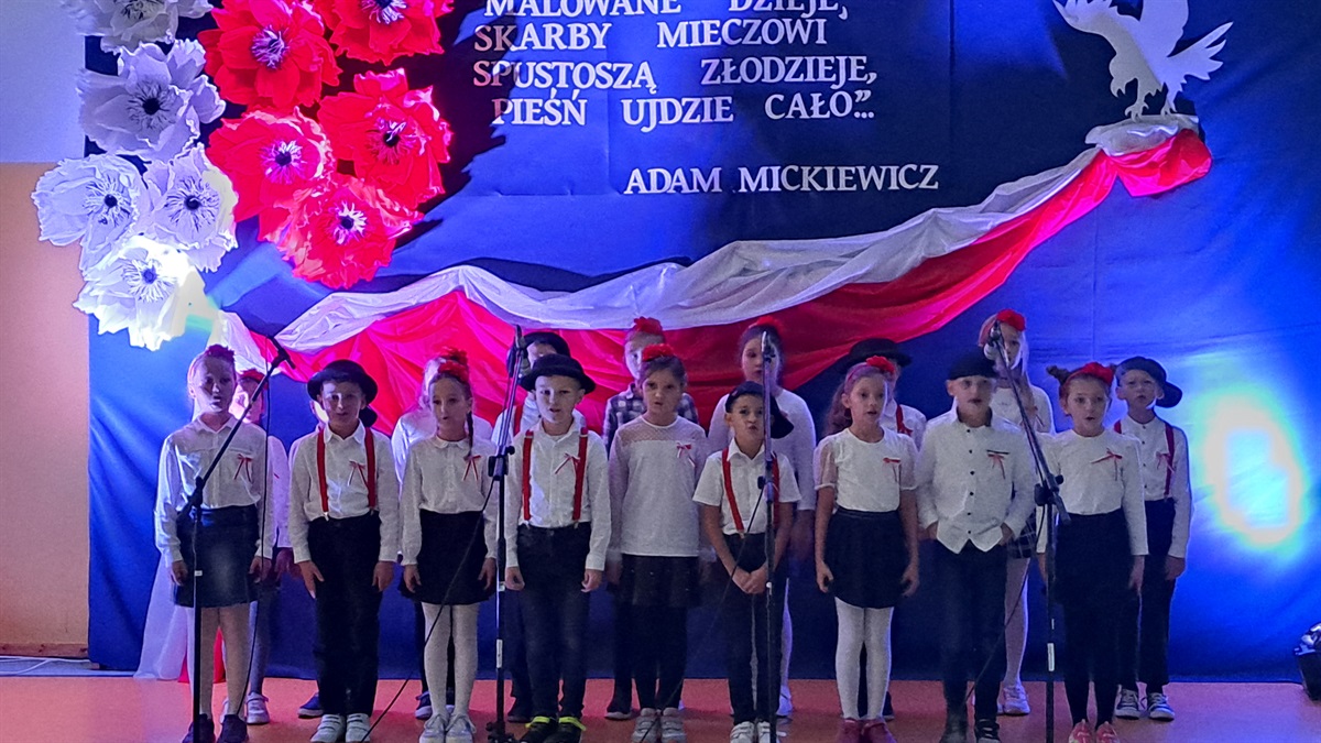 Z okazji 106. rocznicy odzyskania niepodległości w sali gimnastycznej rozbrzmiewały pieśni, które niegdyś towarzyszyły żołnierzom, powstańcom, partyzantom walczącym na wielu frontach o wolną Polskę.